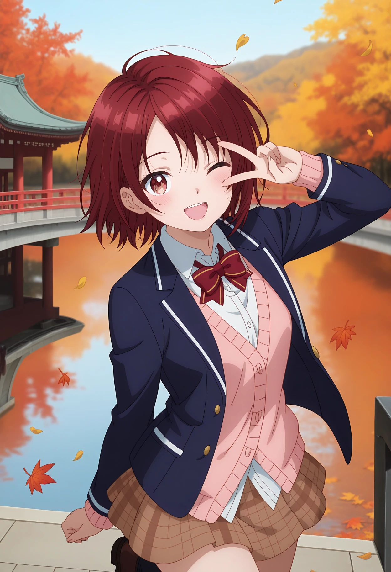 blazer, open jacket, blue jacket, red bowtie, collared shirt, white shirt, pink cardigan, plaid skirt, brown skirt