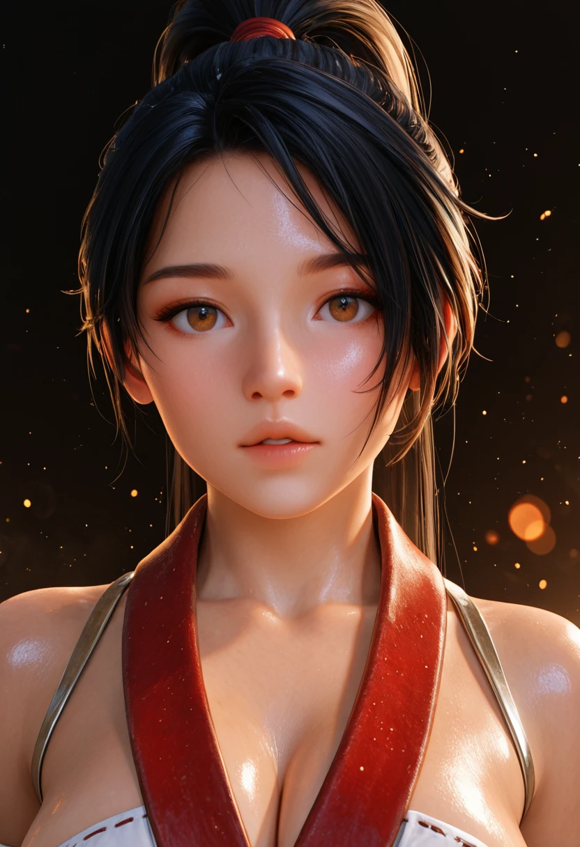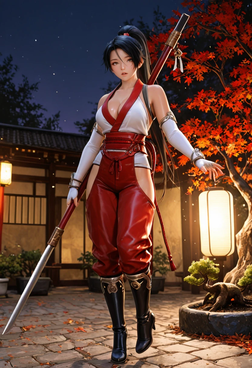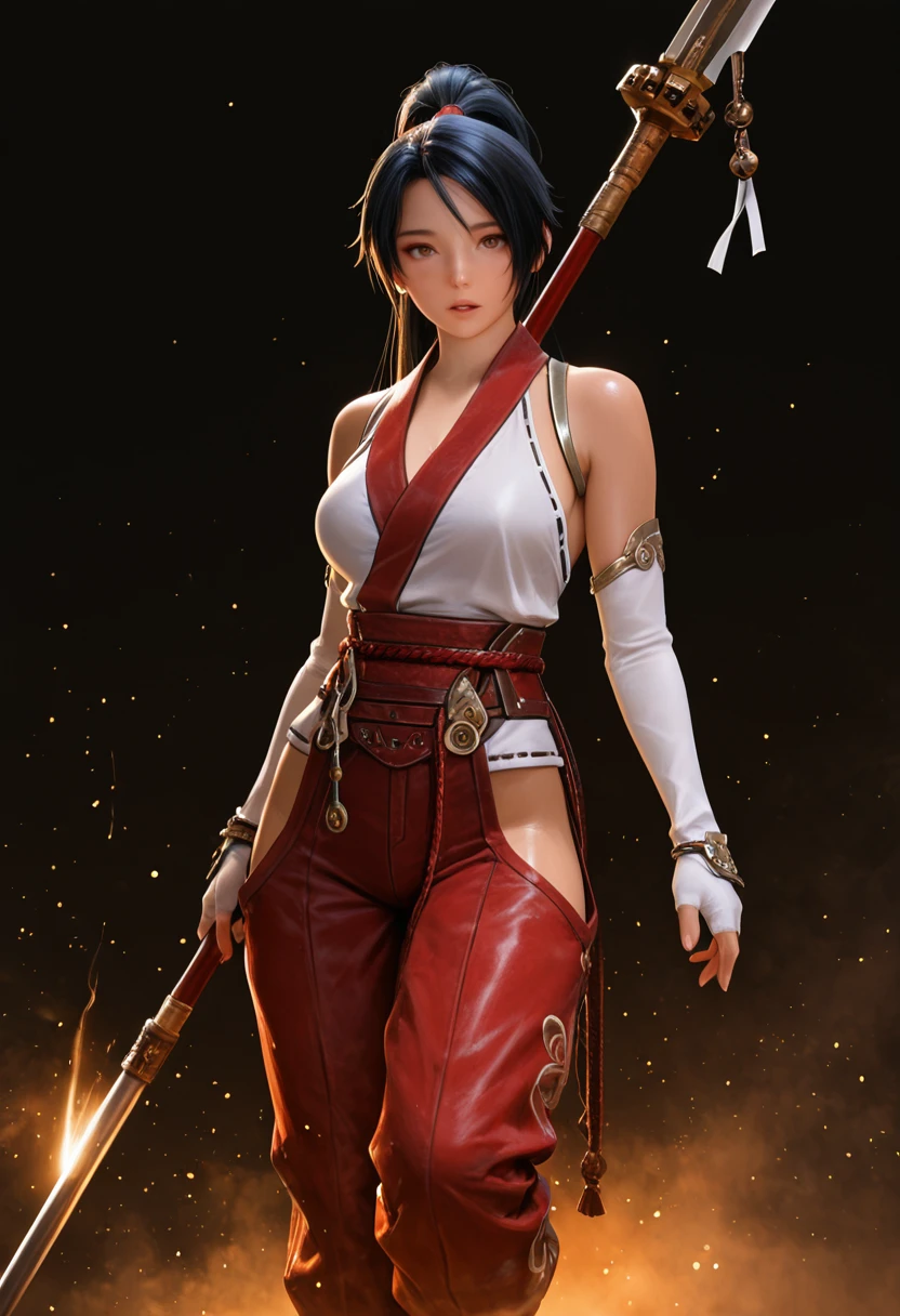 Use NGB2_Momi, 1girl, brown eyes, black hair, high ponytail, for her base features and for her outfit, large breasts, cleavage, bare shoulders, jewelry, sash, detached sleeves, fingerless, white elbow gloves, red pants, hip vents, highheel boots,