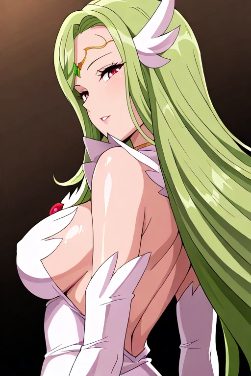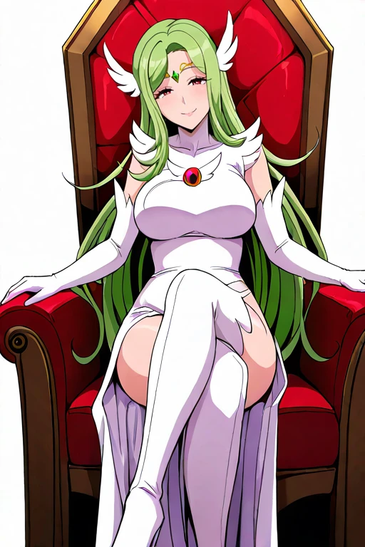 1girl, solo, mature female, aria atimdite, very long hair, green hair, wing hair ornament, circlet, forehead jewel, green jewel, red eyes, shiny skin,