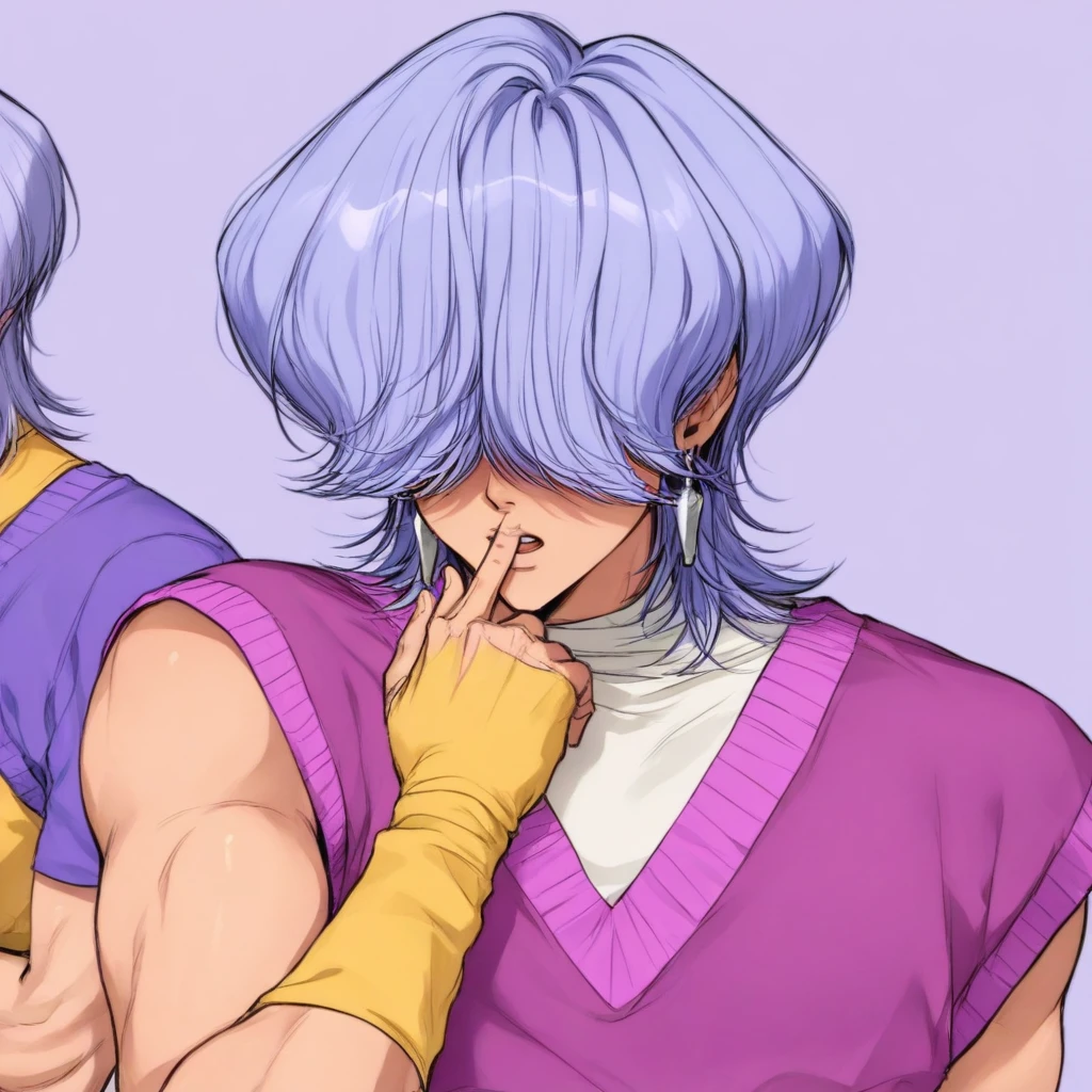 Mystery, lavender hair, hair covering her eyes, Hoop earrings for men, muscle, purple top with yellow shirt underneath, jeans, masculine appearance, handsome, perfect eyes and face, anime style, anime color