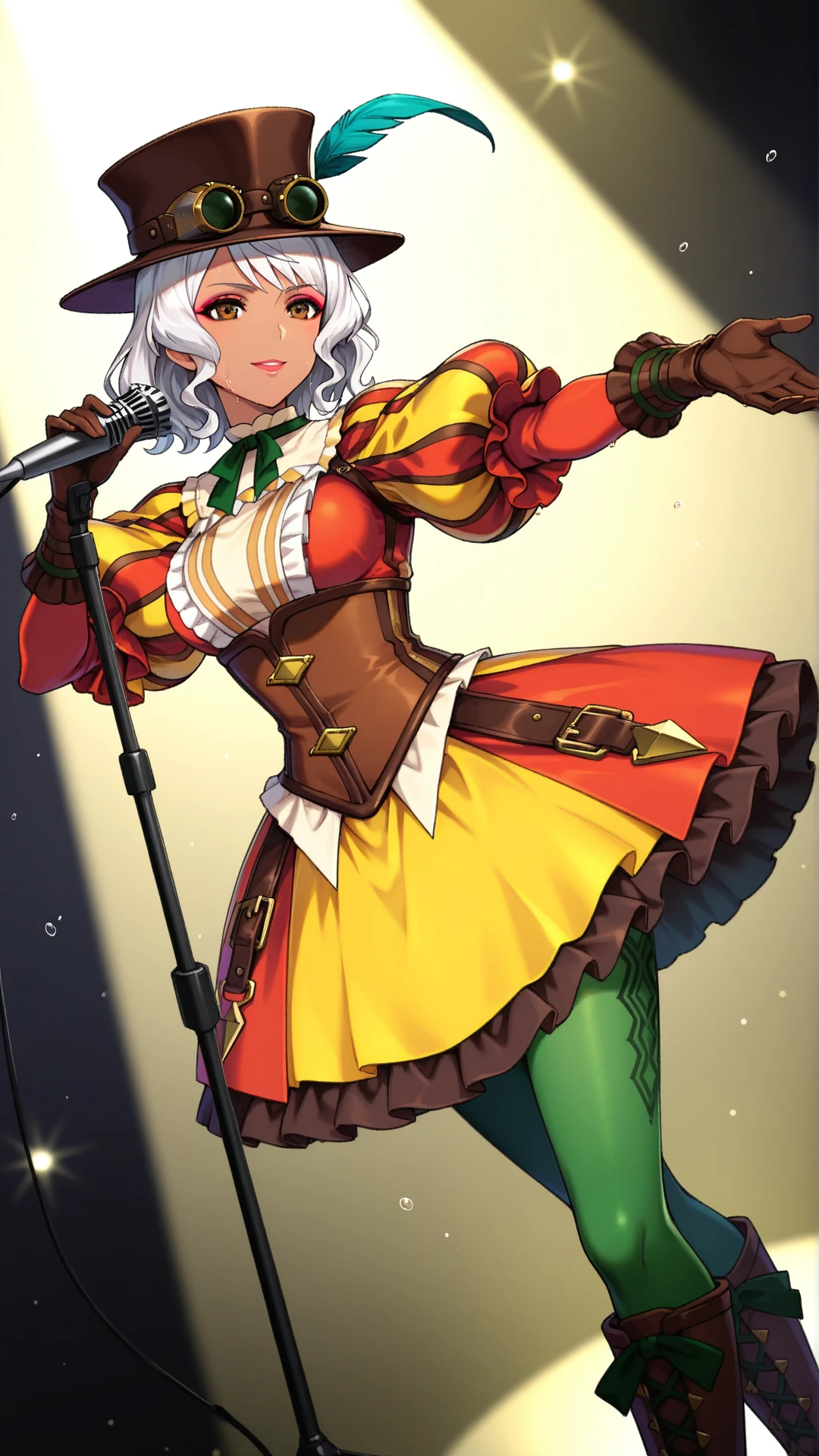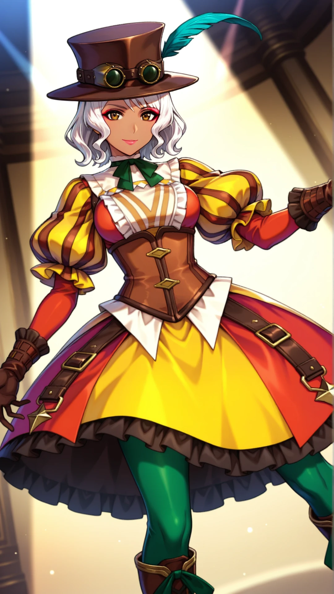 Outfit:top hat, hat feather, goggles on headwear, corset, boots, green pantyhose, puff and slash sleeves, dress,