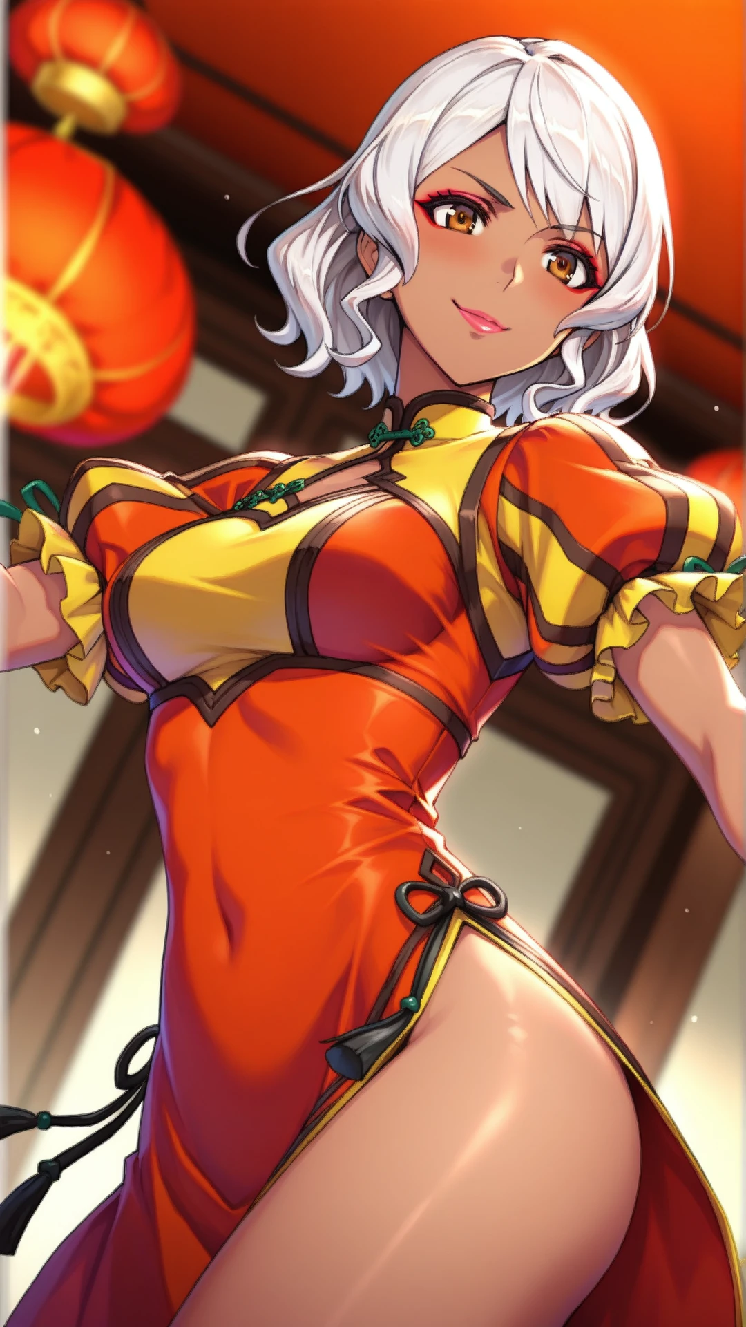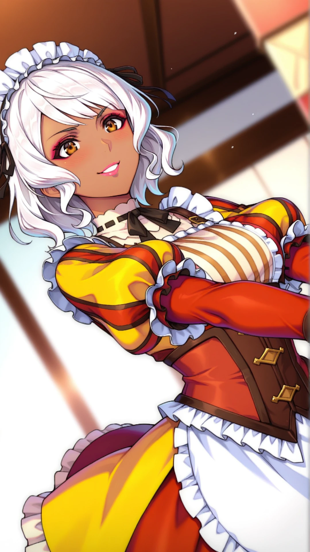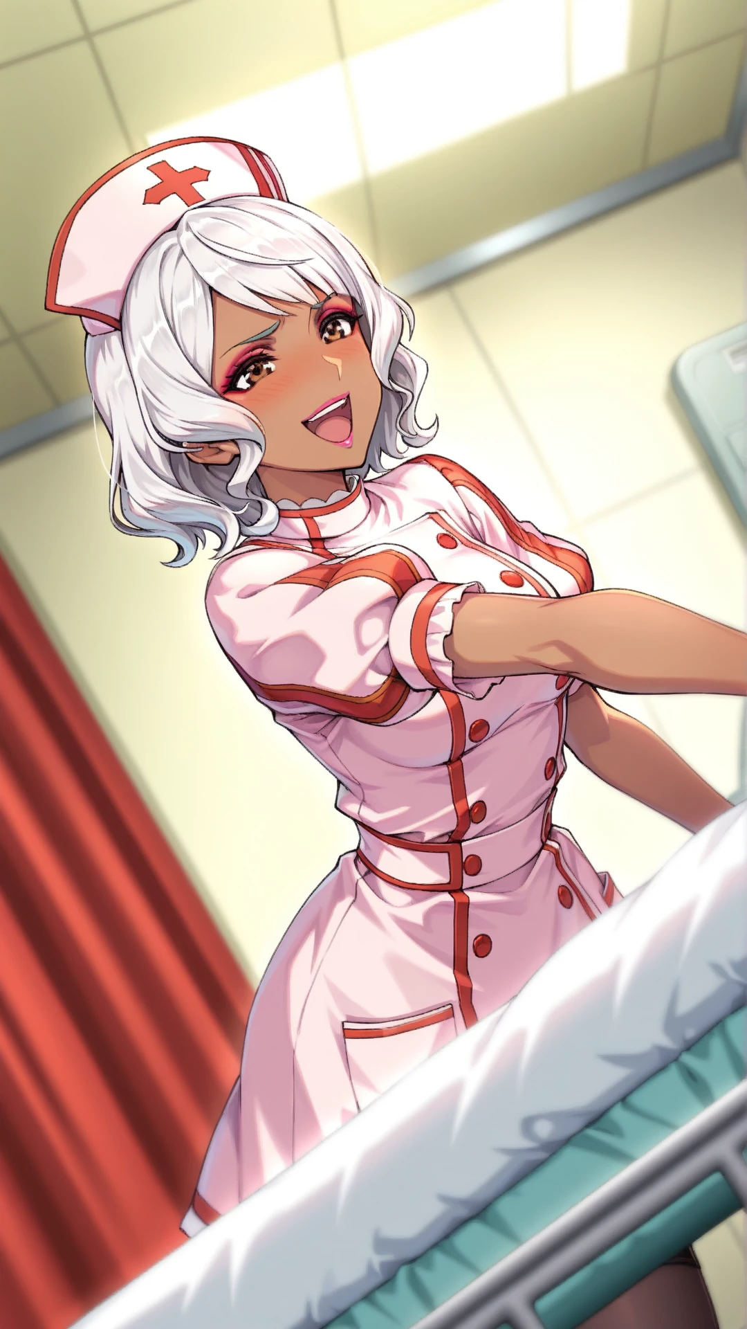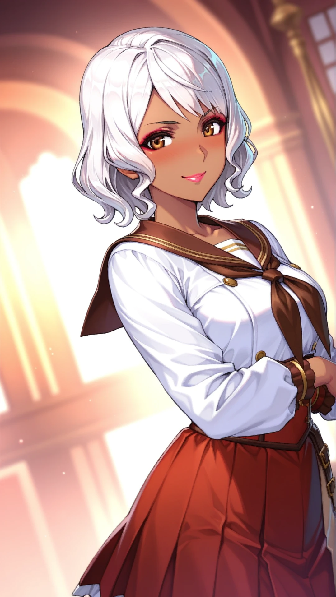 Appearance:white hair, dark-skinned female, short hair, brown eyes, makeup, lipstick, eyeshadow,