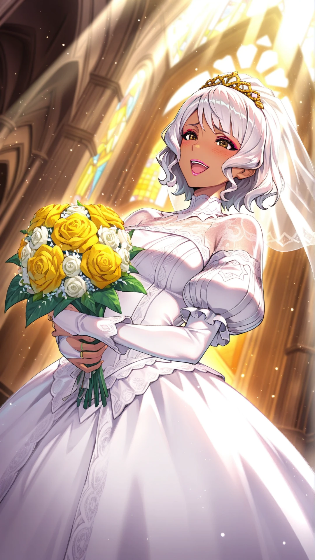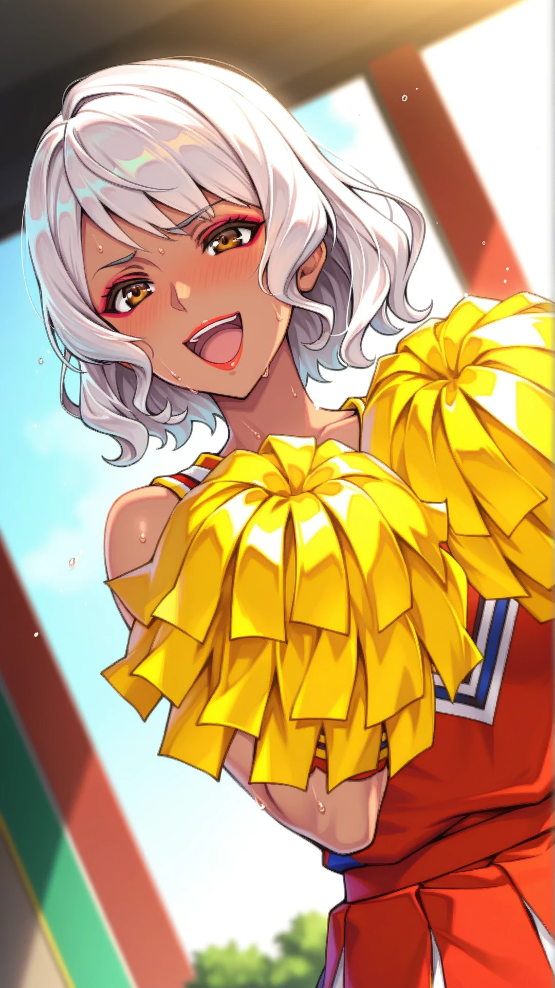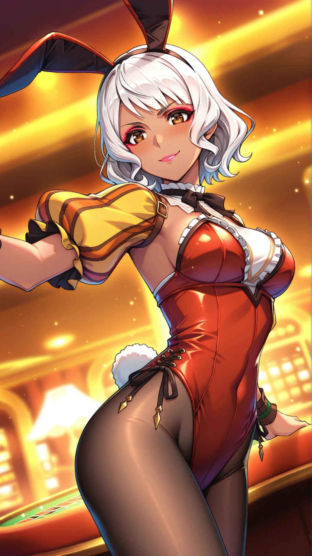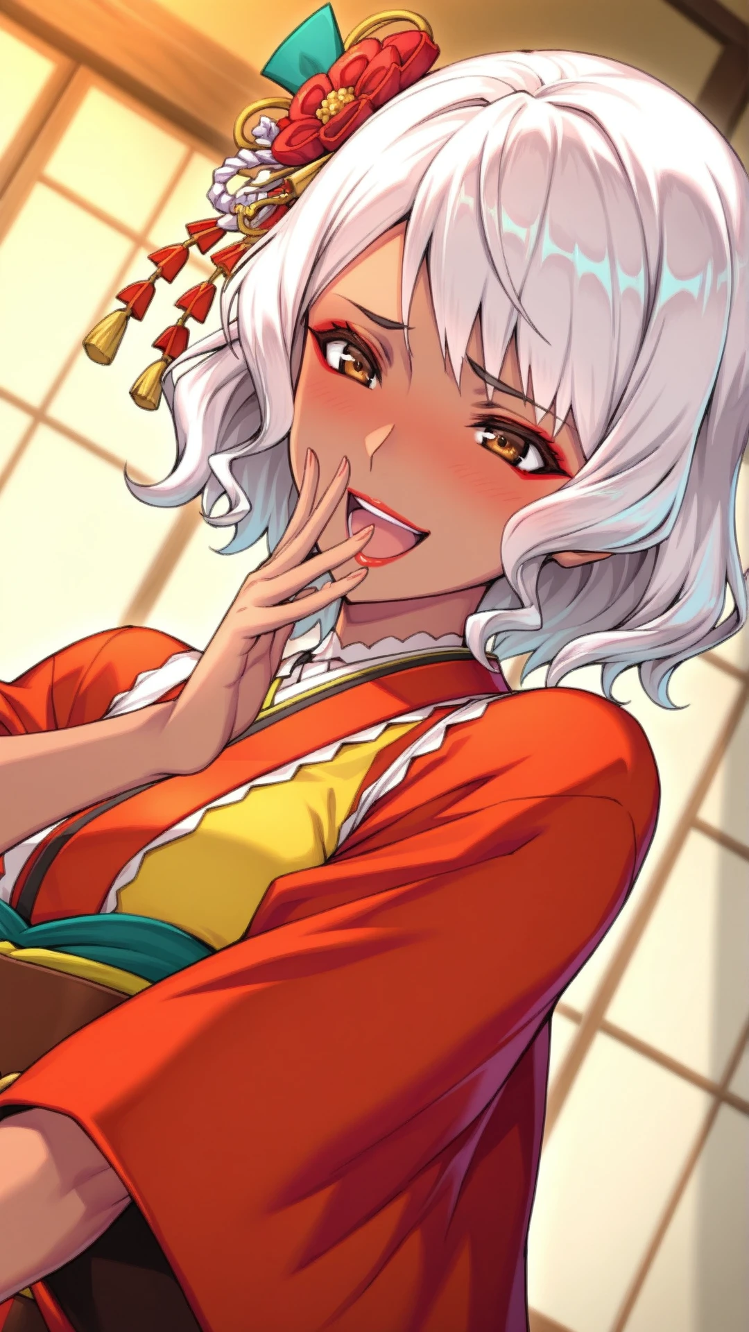 Appearance:white hair, dark-skinned female, short hair, brown eyes, makeup, lipstick, eyeshadow,