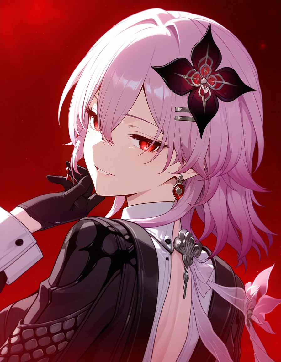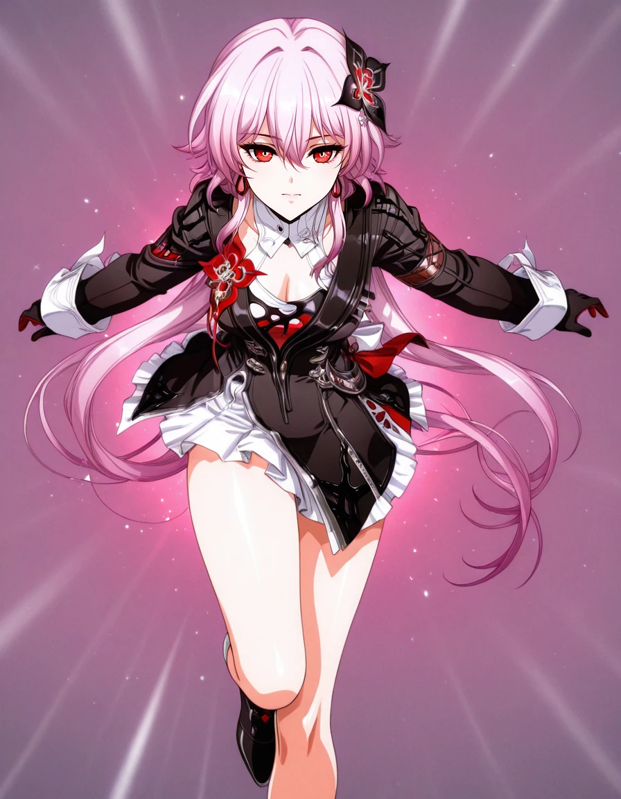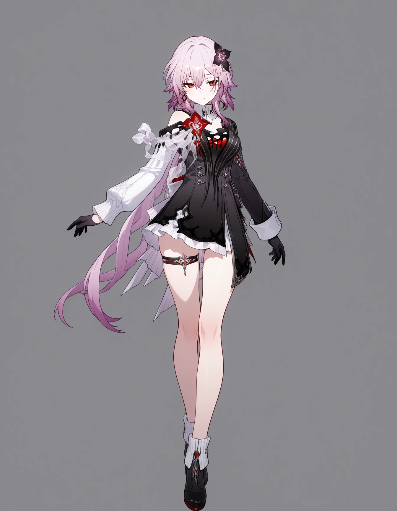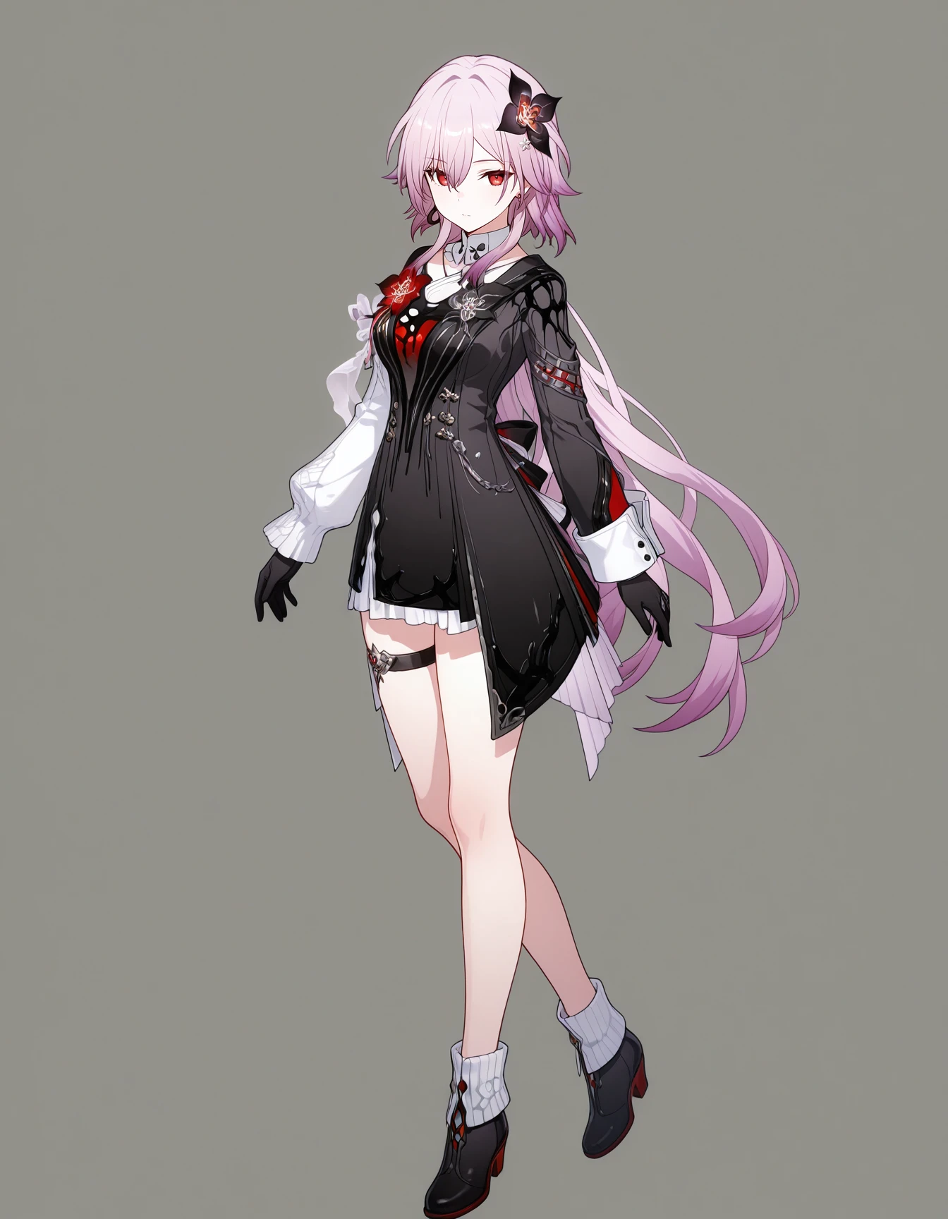 mai_evernight_(honkai_star_rail),long_hair,pink_hair,red_eyes,hair_ornament,black_dress,long_sleeves,black_gloves,thigh_strap, black_footwearRecommend preferred Strength: 0.7~1.