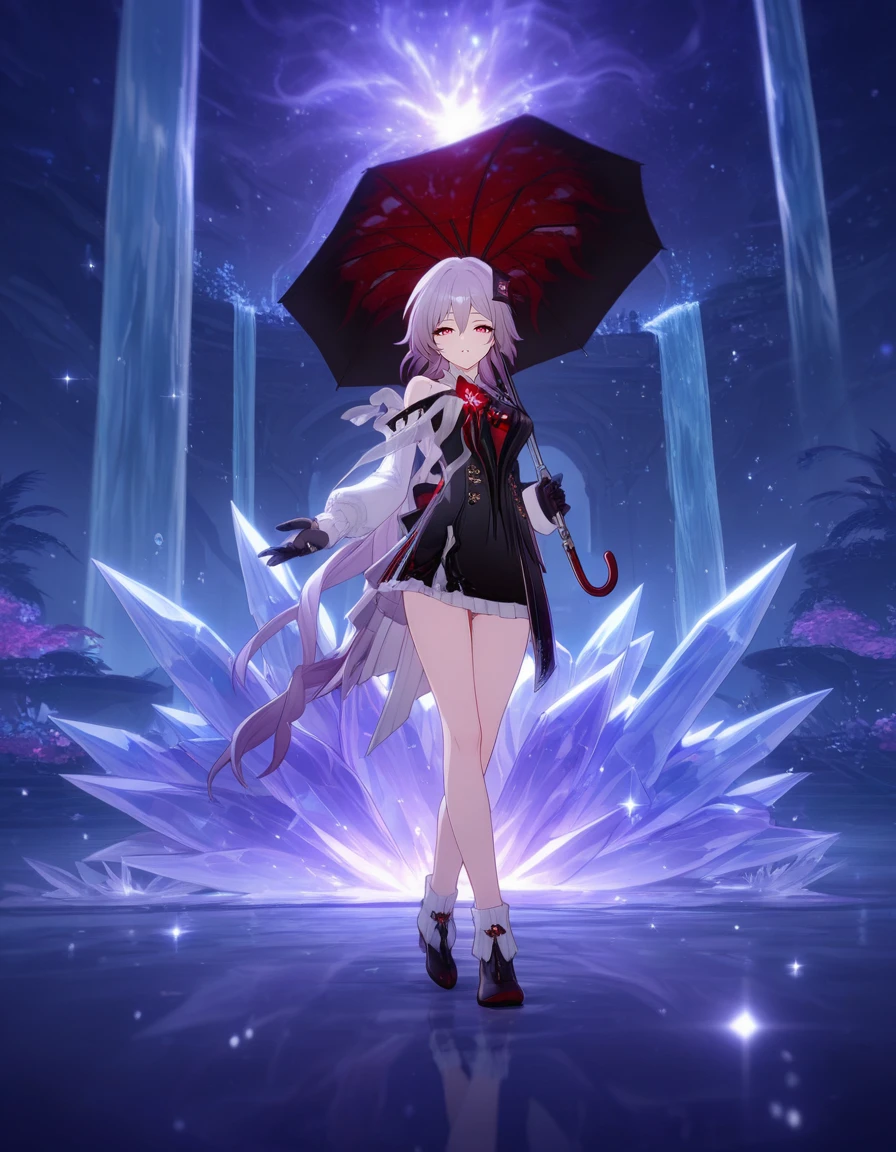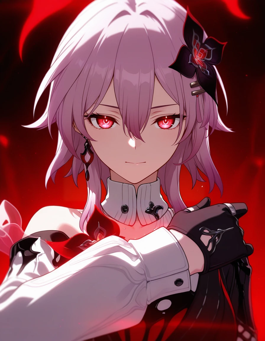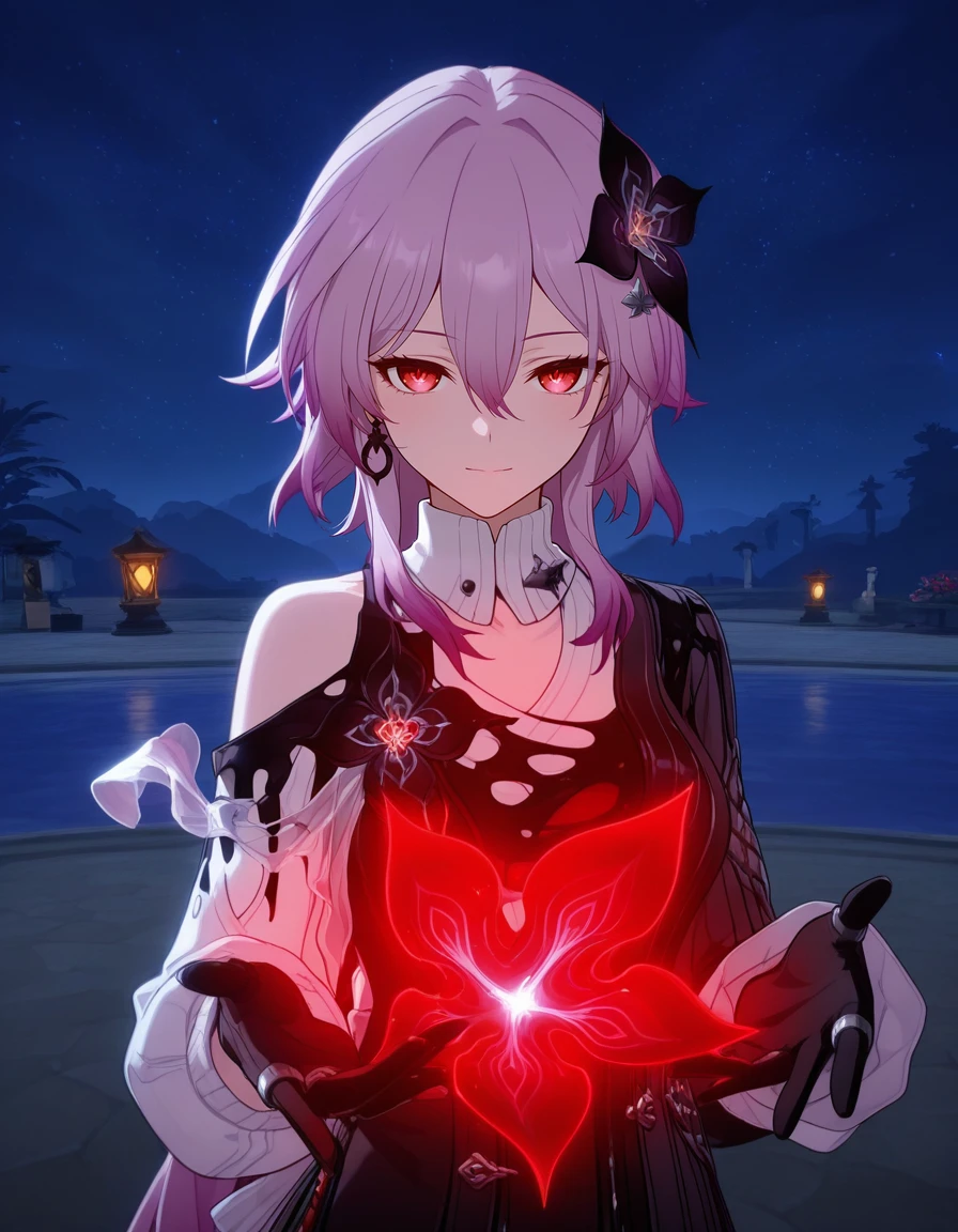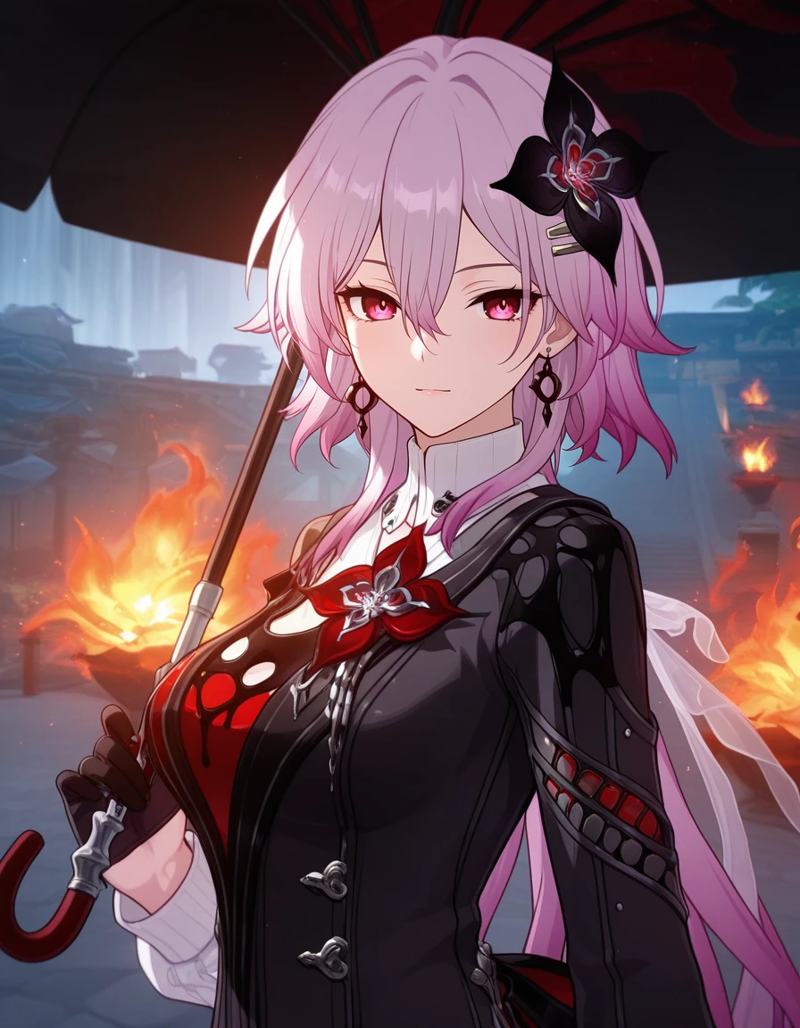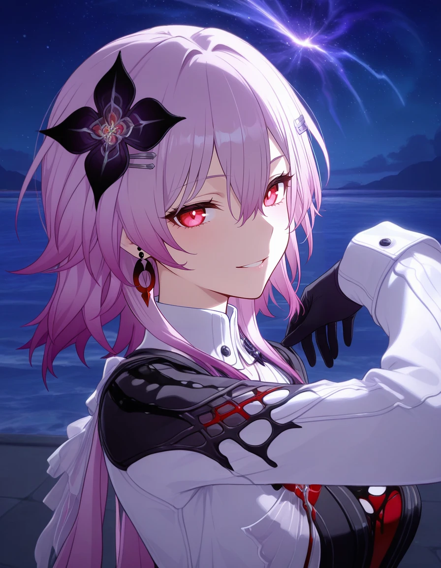 mai_evernight_(honkai_star_rail),long_hair,pink_hair,red_eyes,hair_ornament,black_dress,long_sleeves,black_gloves,thigh_strap, black_footwearRecommend preferred Strength: 0.7~1.