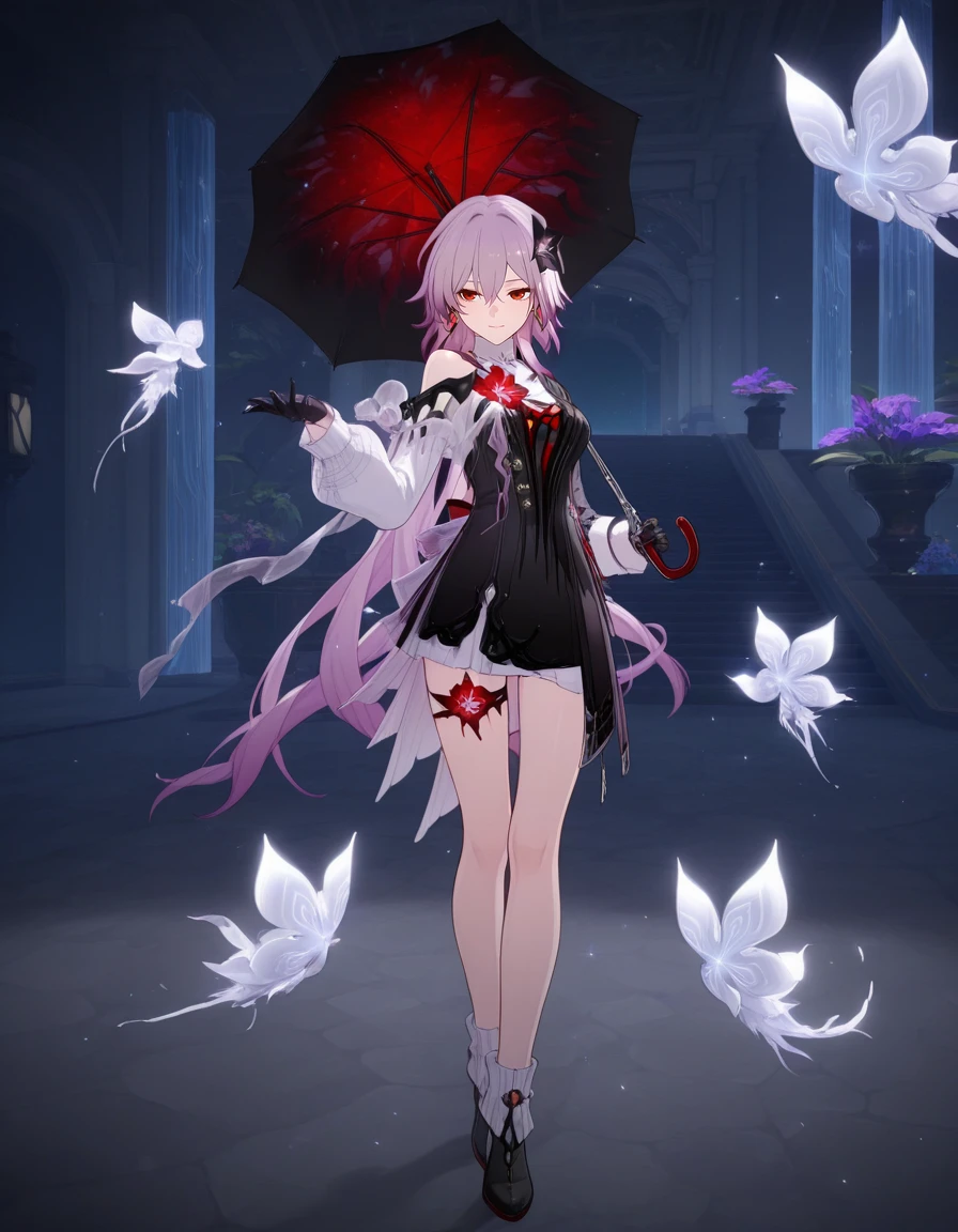 mai_evernight_(honkai_star_rail),long_hair,pink_hair,red_eyes,hair_ornament,black_dress,long_sleeves,black_gloves,thigh_strap, black_footwear