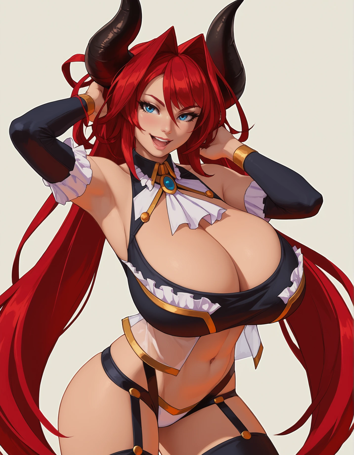 tsunokoeu03, huge breasts, hair intakes, cleavage cutout, blue eyes, garter straps, black horns, red hair, black thighhighs, clothing cutout, bare shoulders,frills, split ponytail, detached collar, micro panties, black elbow gloves, sidelocks, black crop top, white ascot