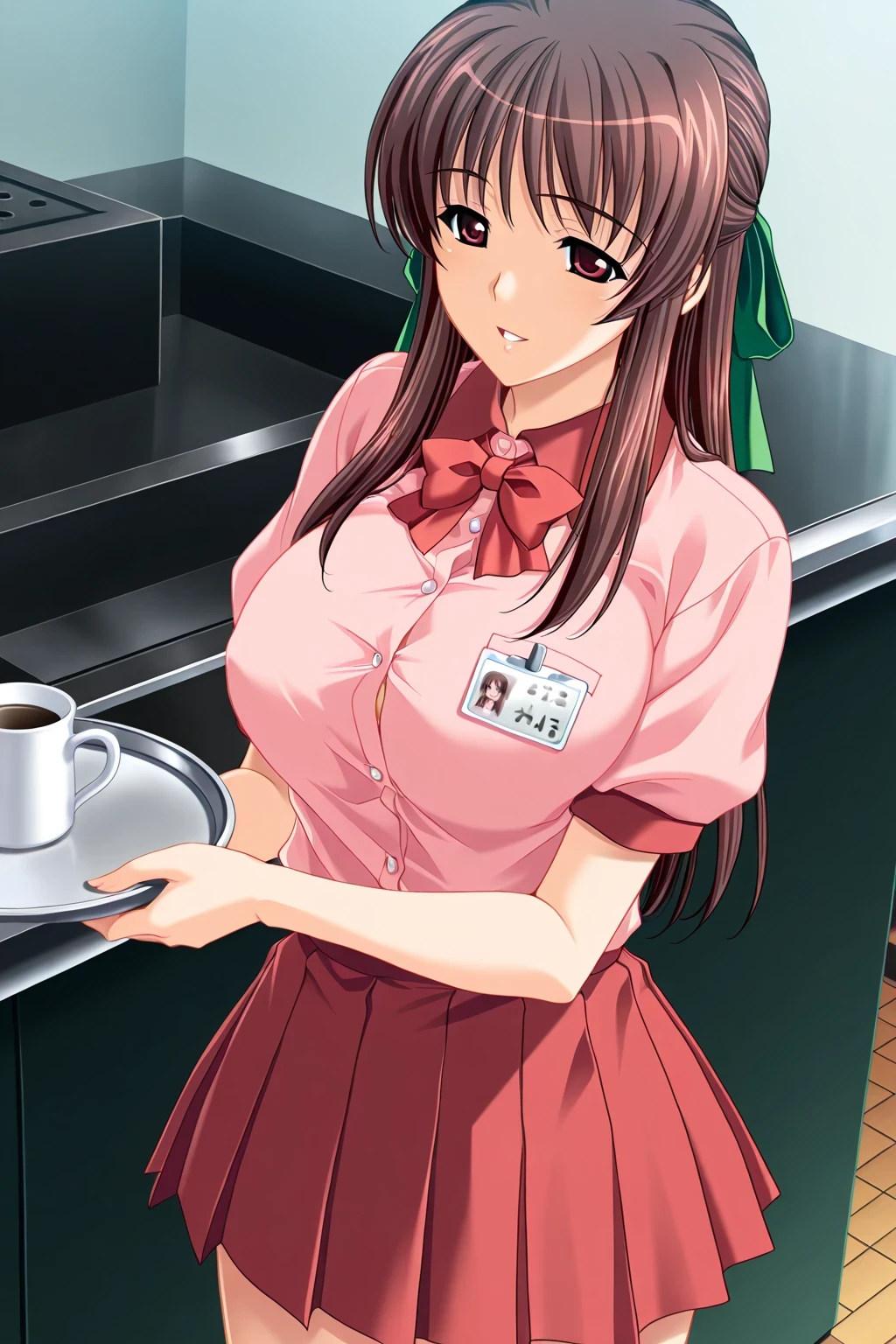 Ayase Mitsuki,Game Style,2000s style,Brown hair,Long hair,Green hair ribbon,Big Breasts,red eyes,