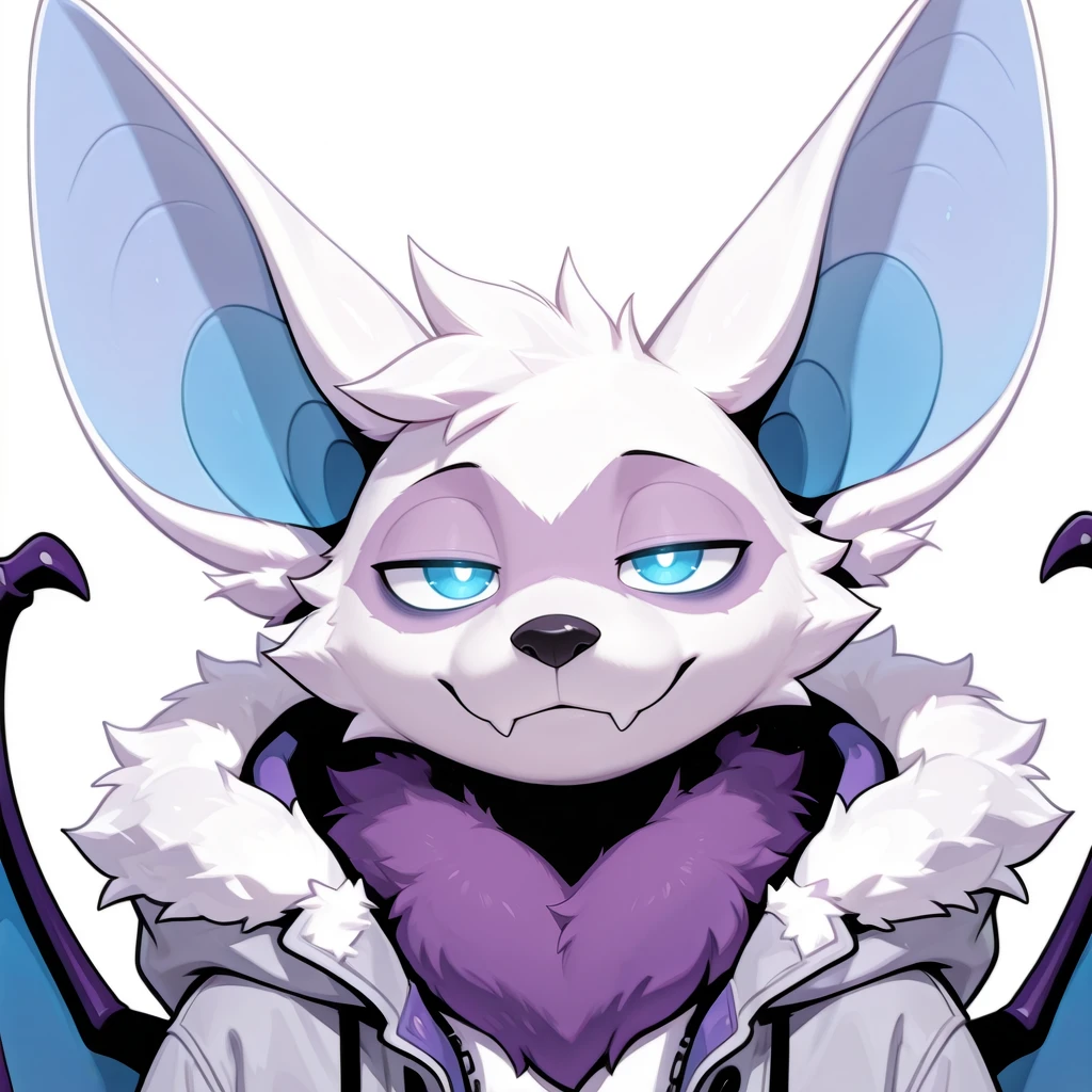 wings, purple face, blue inner ears, digitigrade, white body, raccoon tail, 4 digits, white pupils, bat ears, purple striped fur, glowing eyes, blue eyes, raccoon tail, furry male, fangs, white arms, white head, purple face, white ears, white thighs, large ears, black nose, blue wings, blue hands, blue feet, purple tuft, purple neck fur, toe claws,