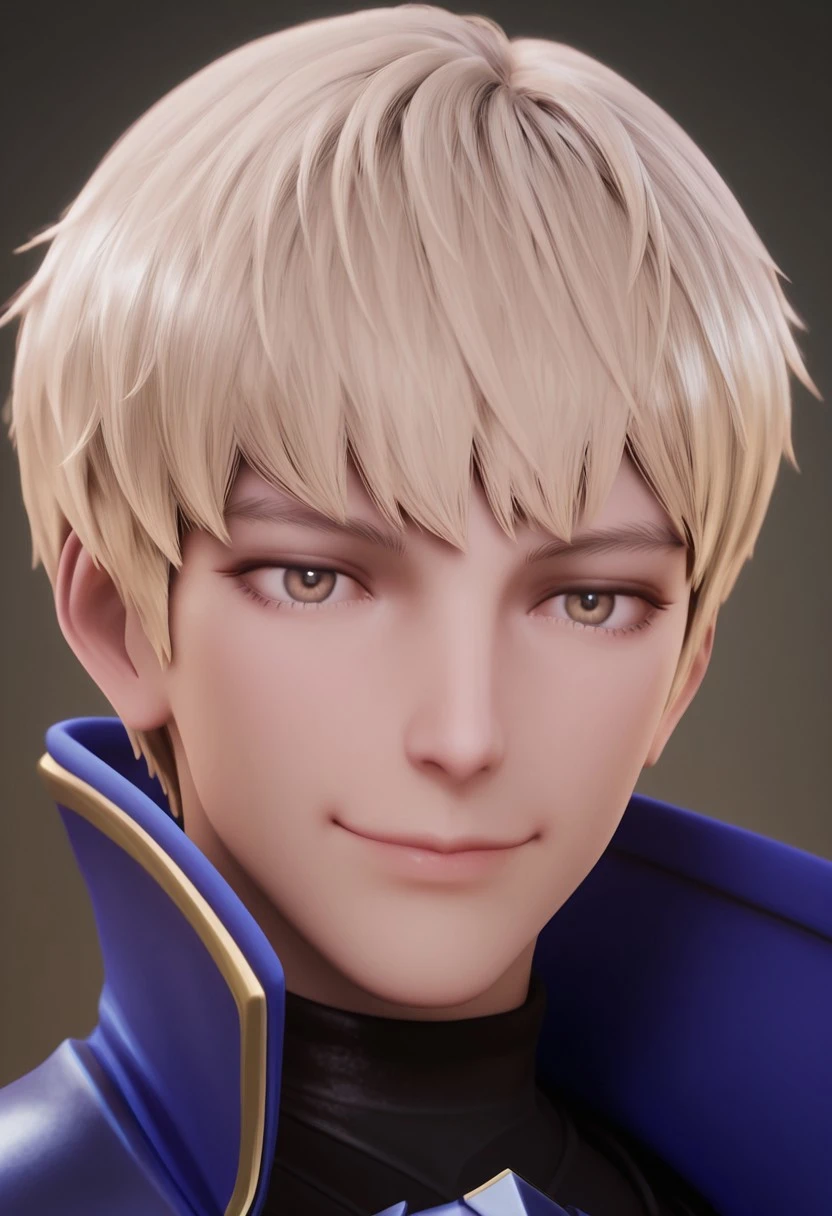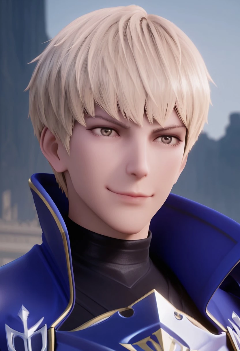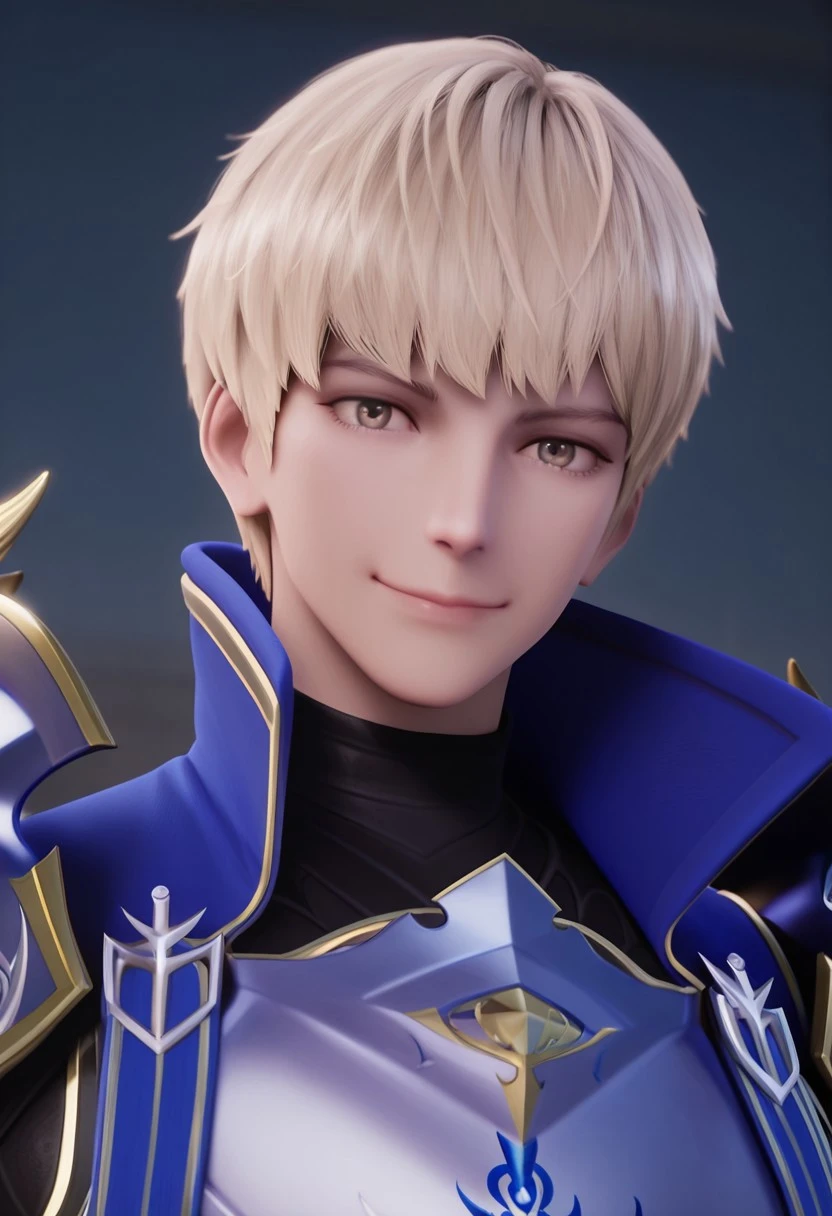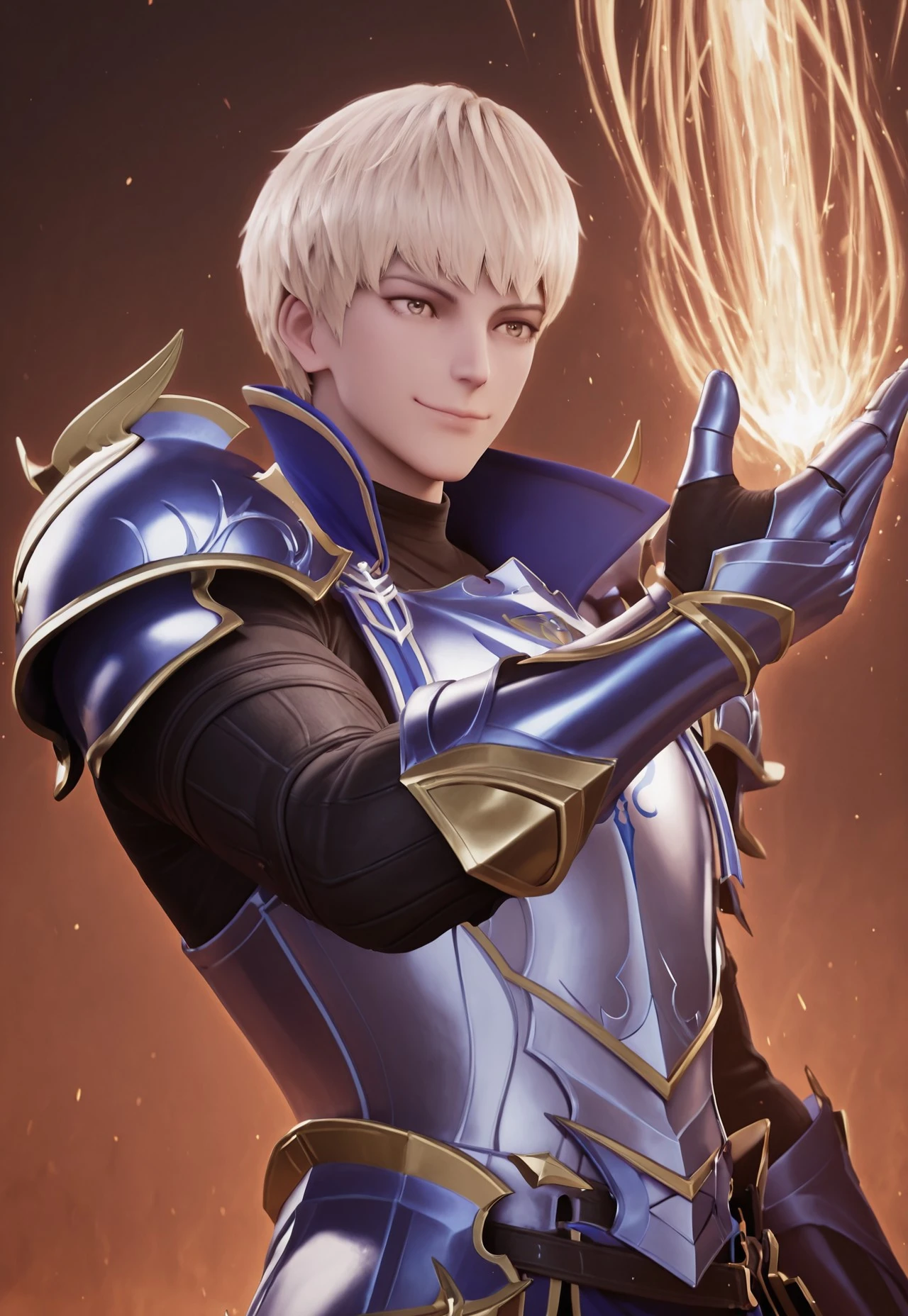 1boy, male focus, solo, brown eyes, blonde hair, black shirt, blue armor, high collar, shoulder armor, gauntlets, black pants, armored boots,