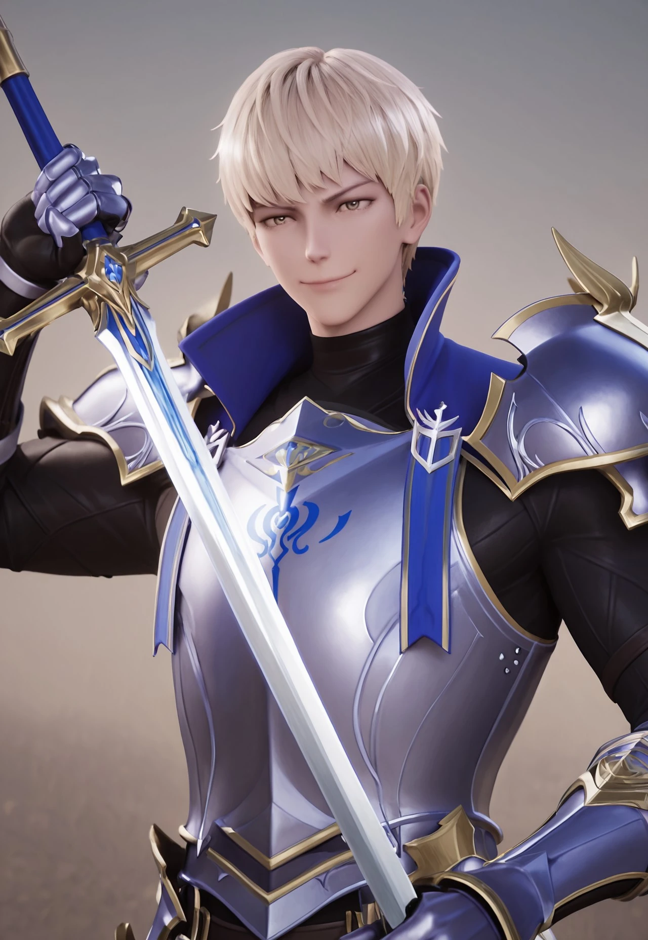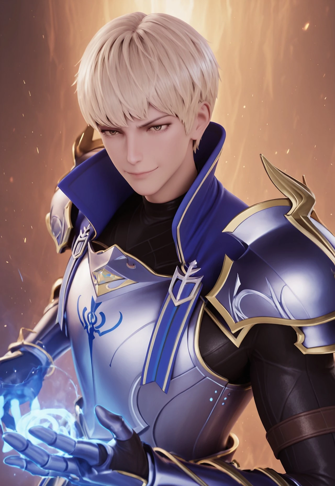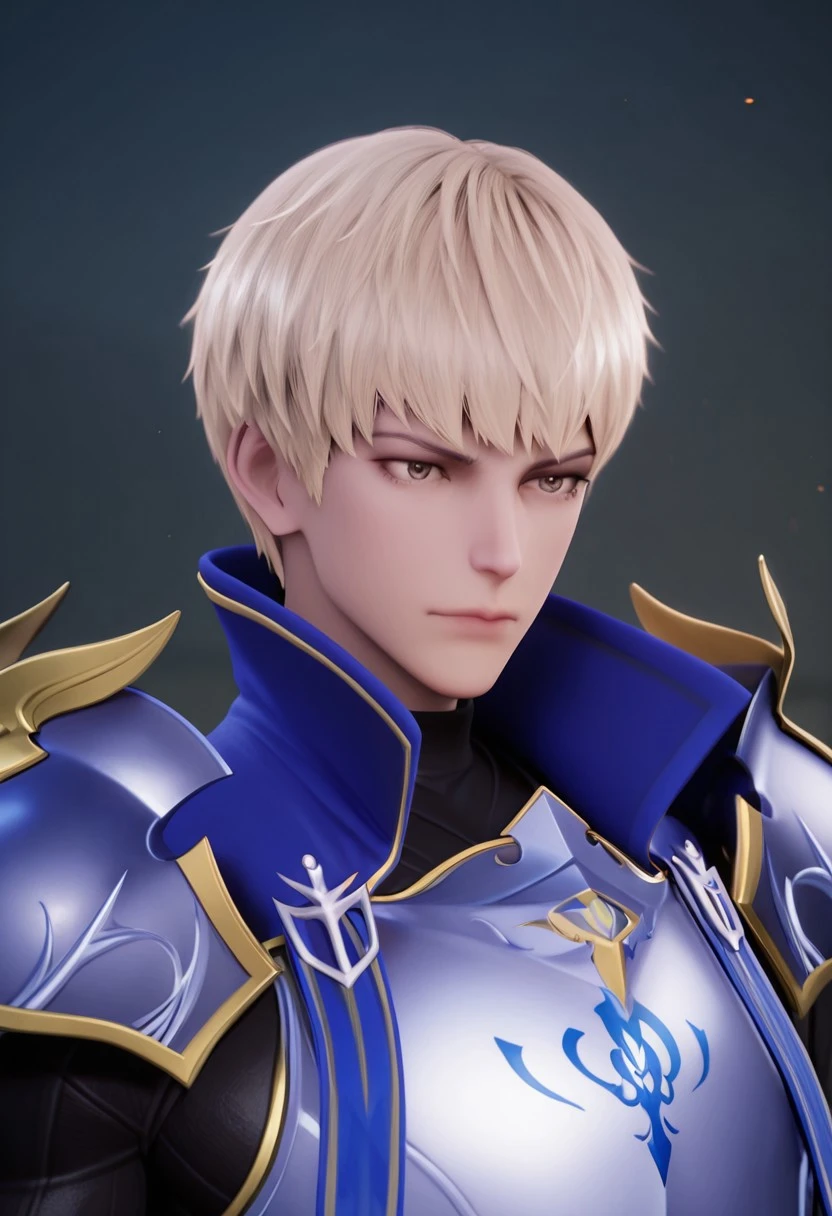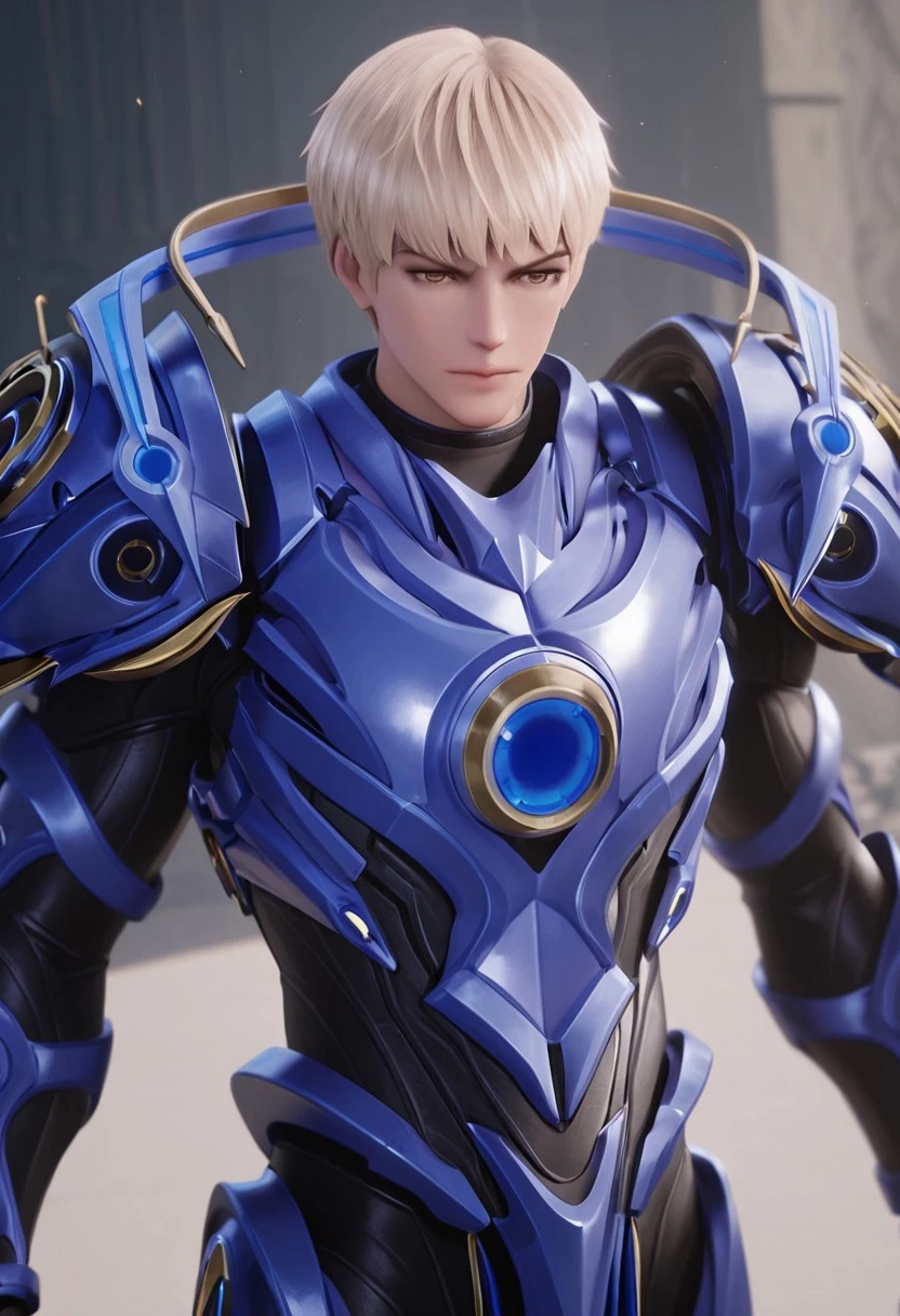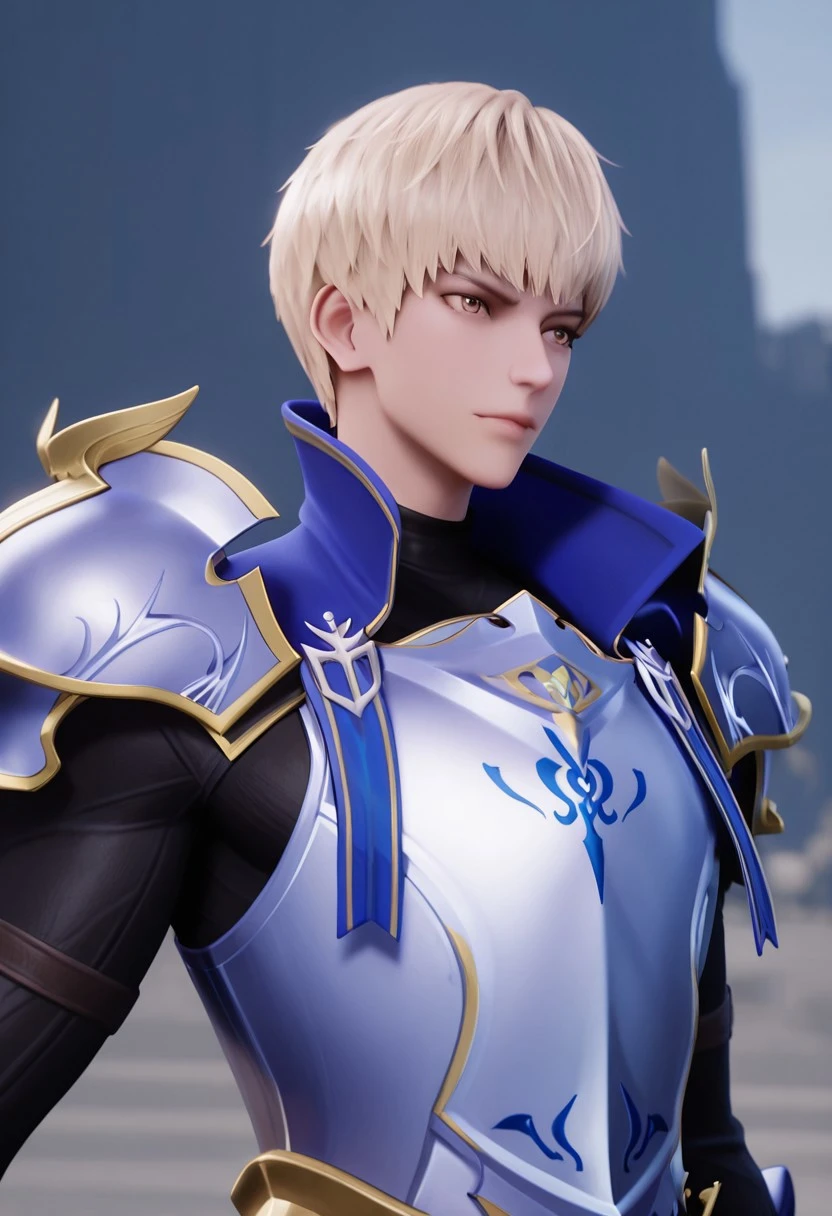 1boy, male focus, solo, brown eyes, blonde hair, black bodysuit, full armor, blue armor, pauldrons, gauntlets, armored boots,