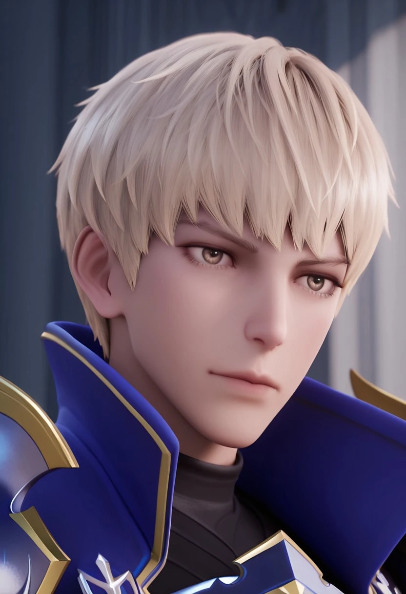 1boy, male focus, solo, brown eyes, blonde hair, gold armor, pauldrons, blue cape, gauntlets, armored boots,