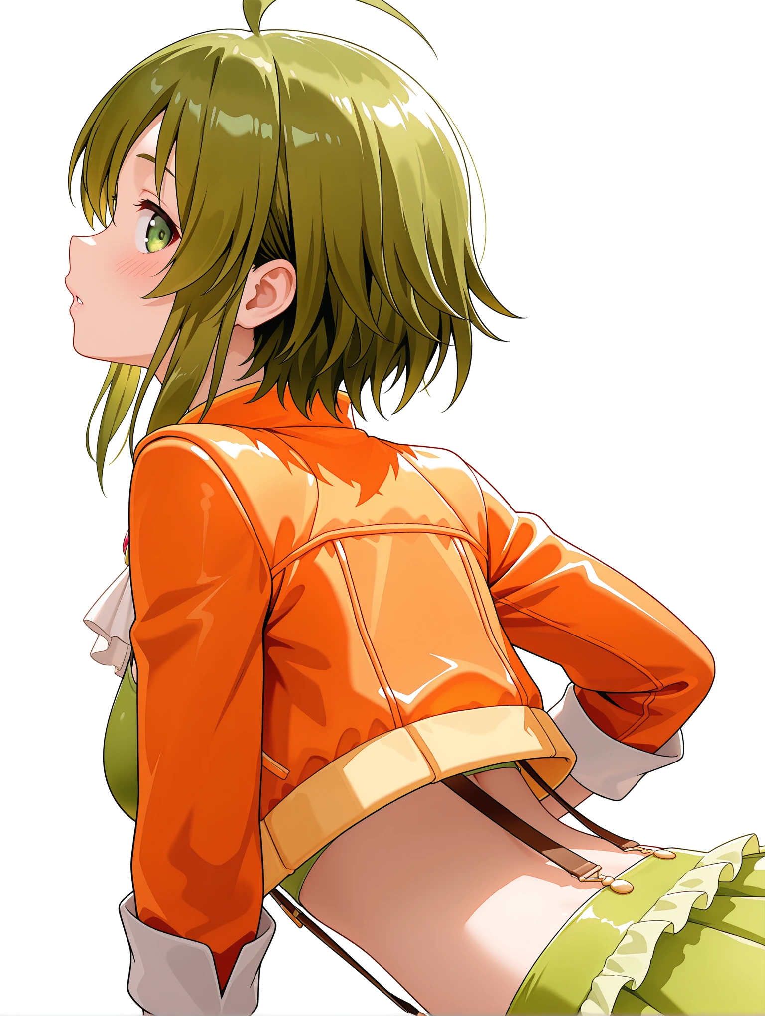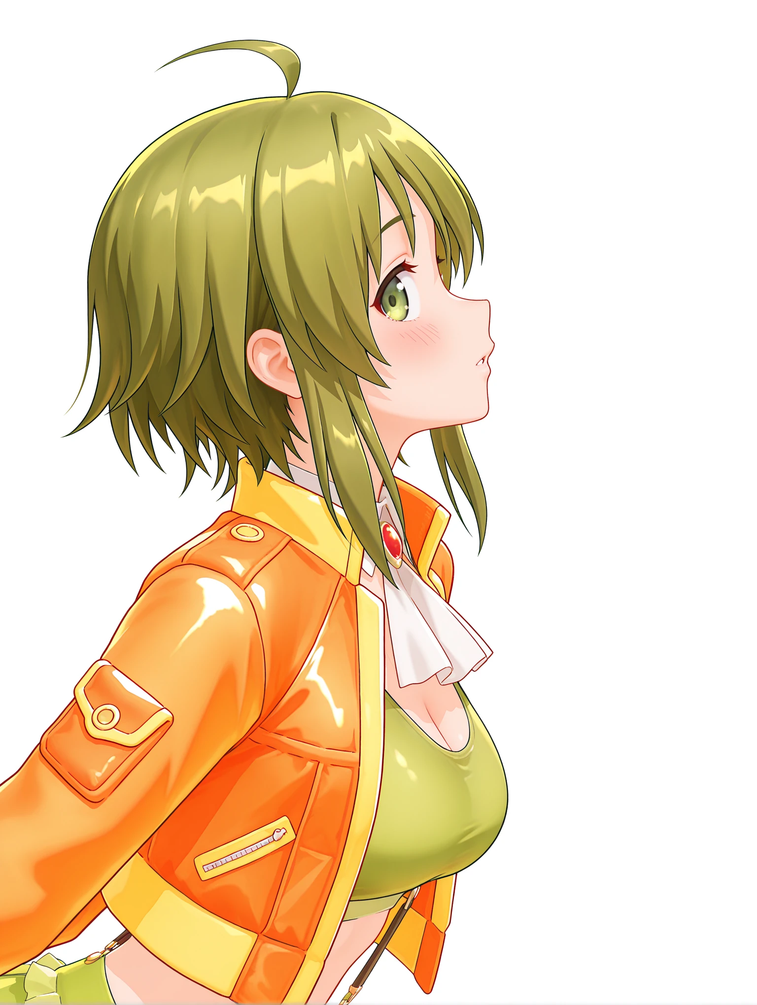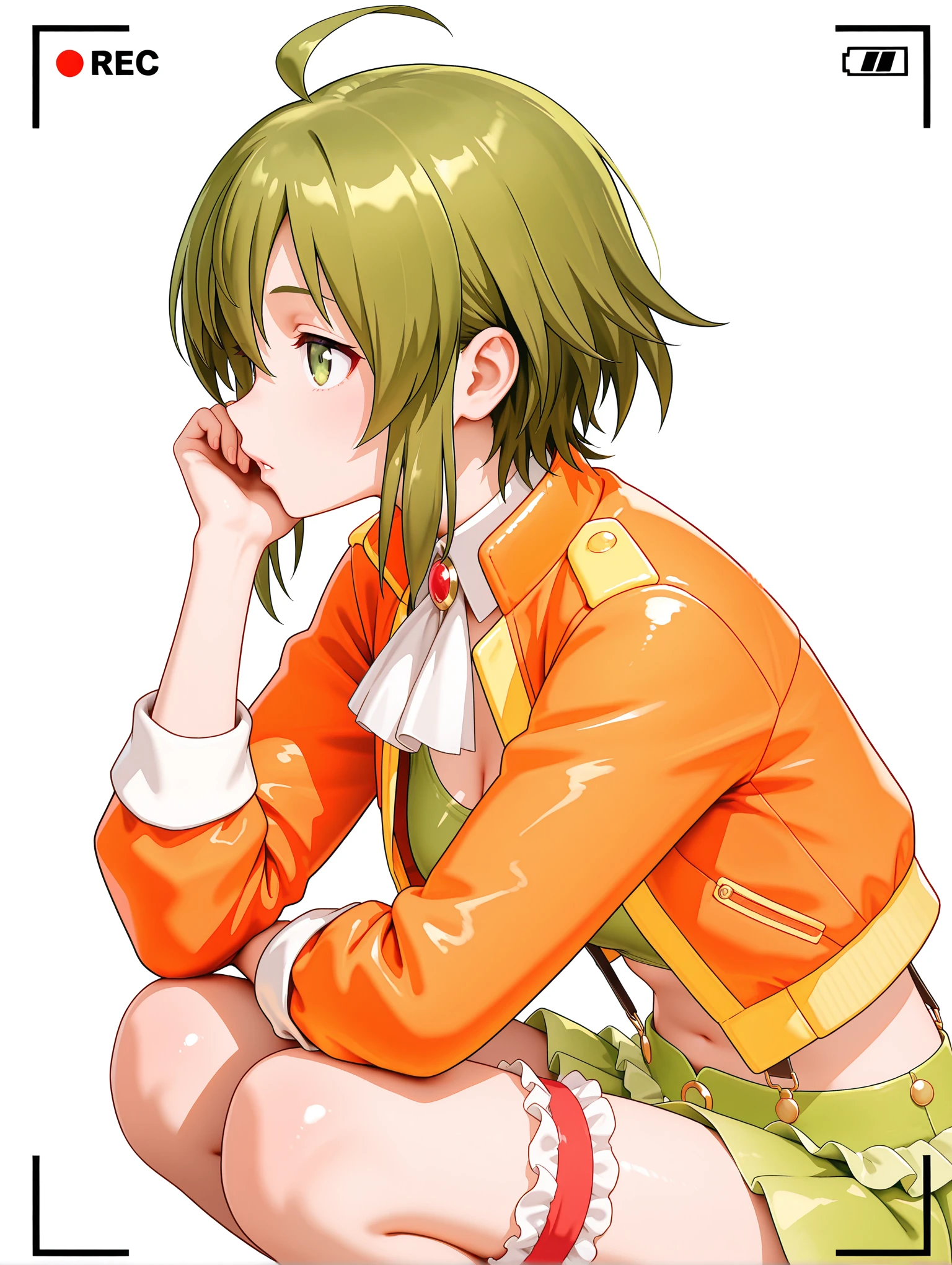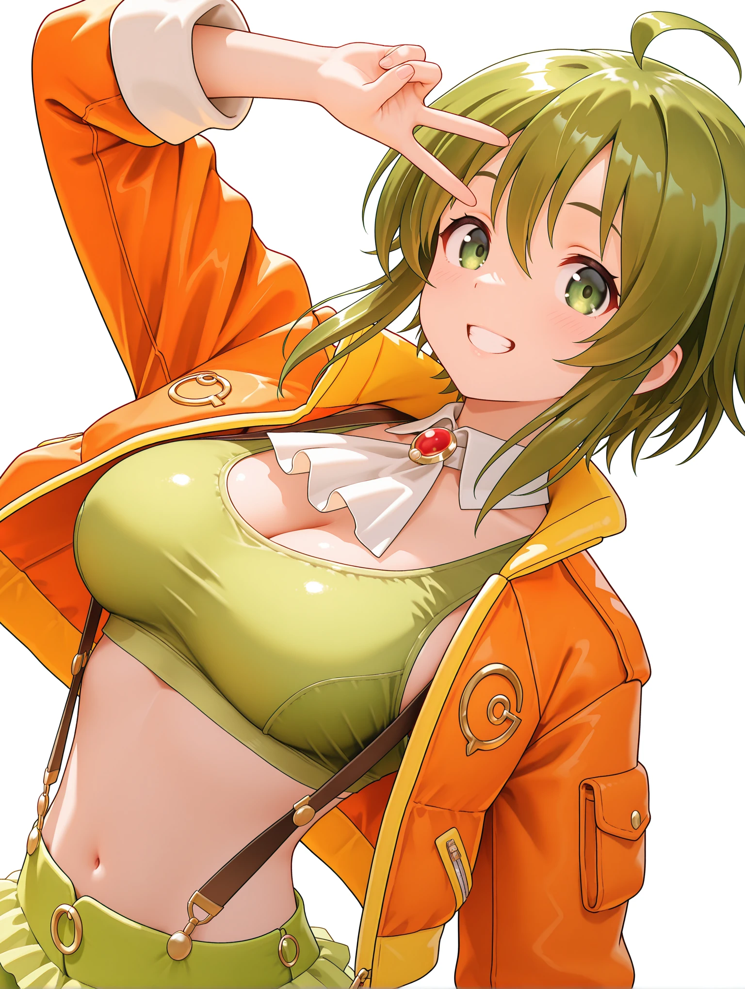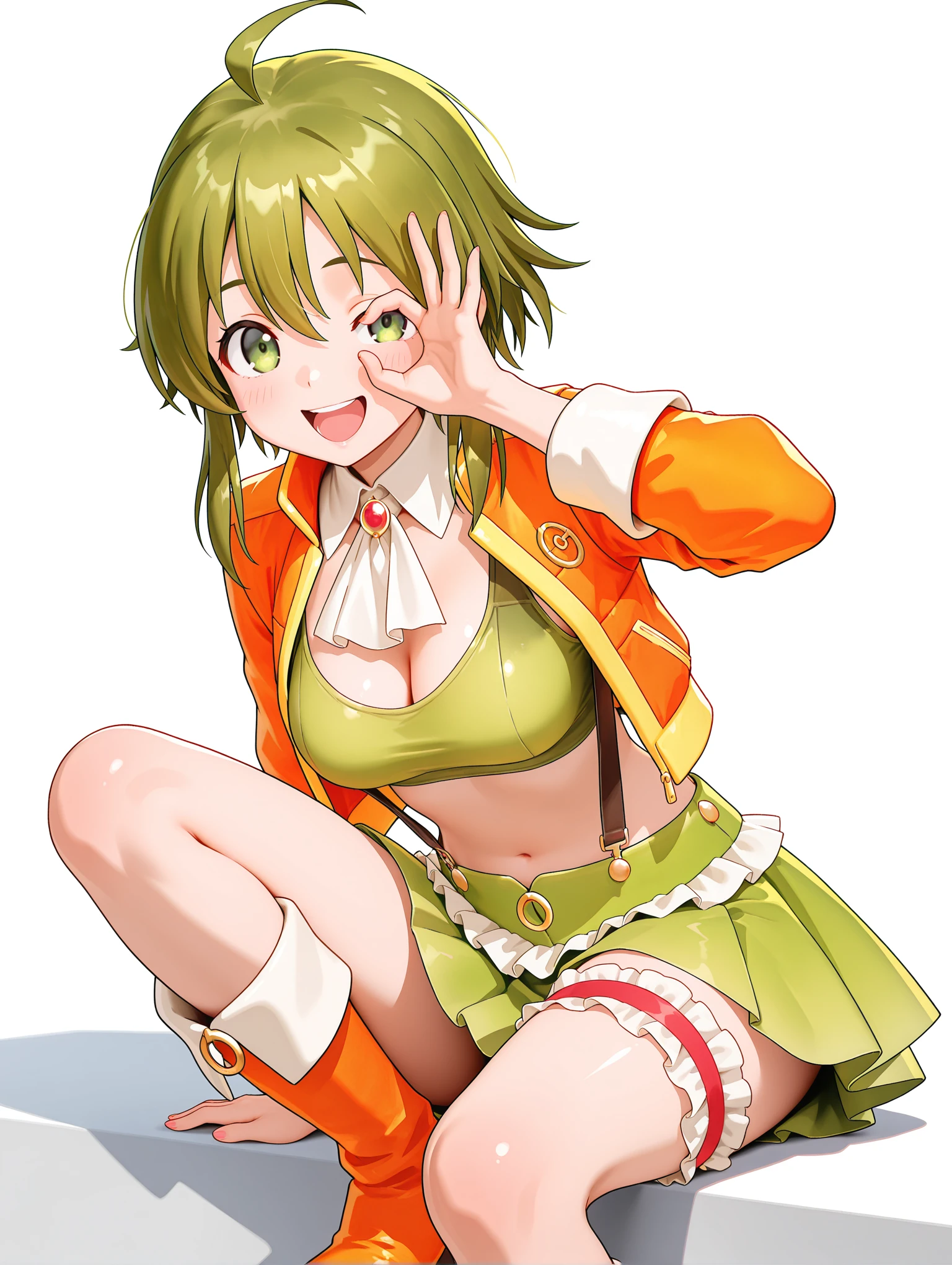 g_clothes,white ascot,brooch,open jacket,orange jacket,green sports bra,crop_top,suspender_skirt,bridal garter,orange footwear,boots,