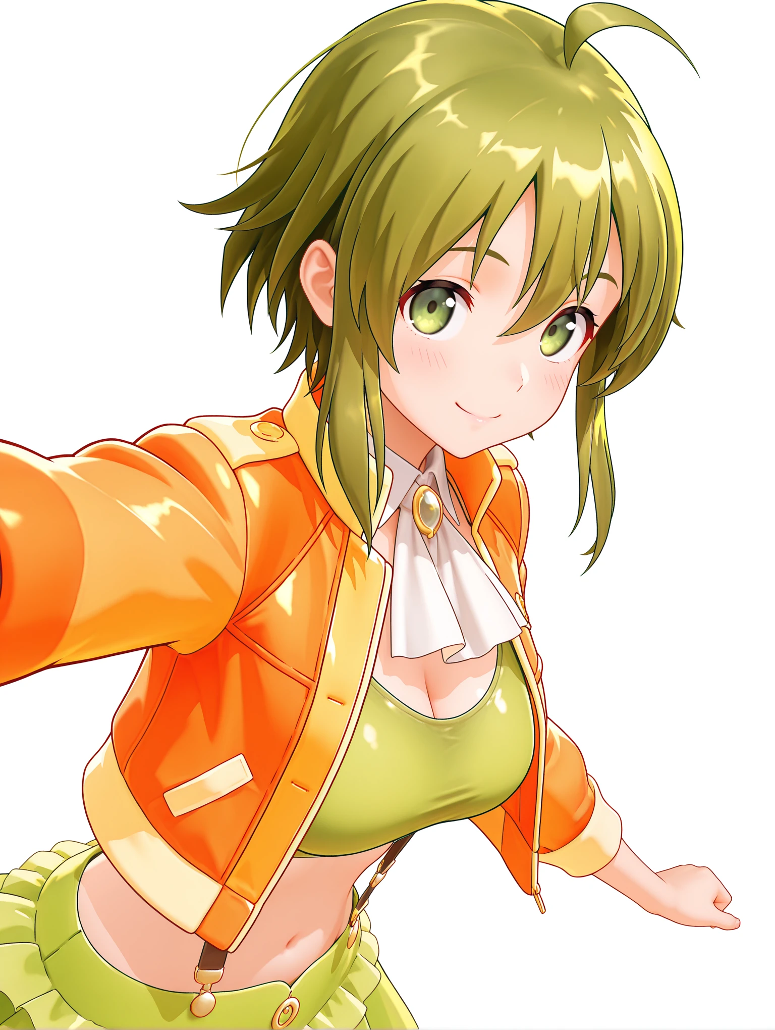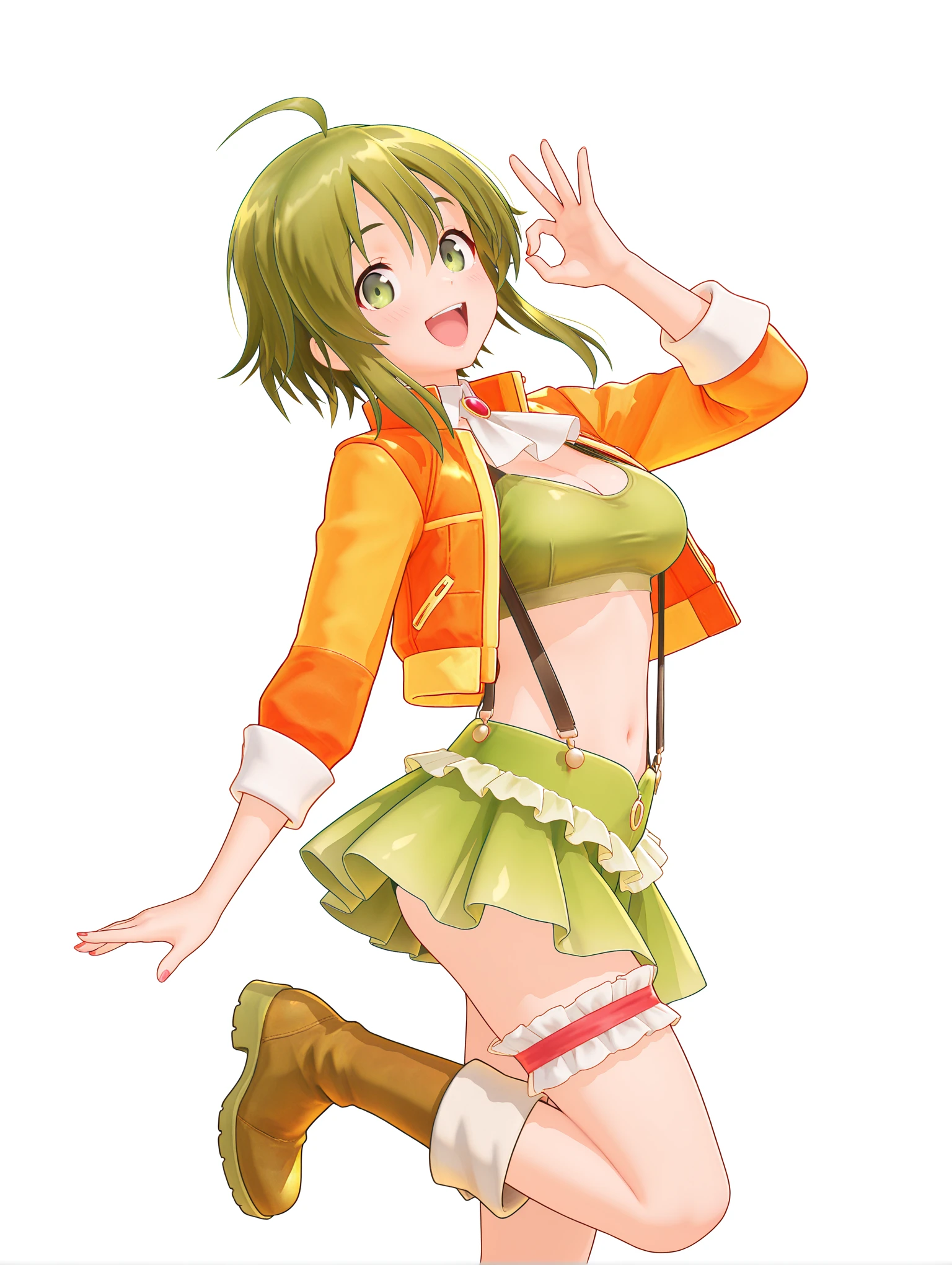 衣装 ・g_clothes,white ascot,brooch,open jacket,orange jacket,green sports bra,crop_top,suspender_skirt,bridal garter,orange footwear,boots,