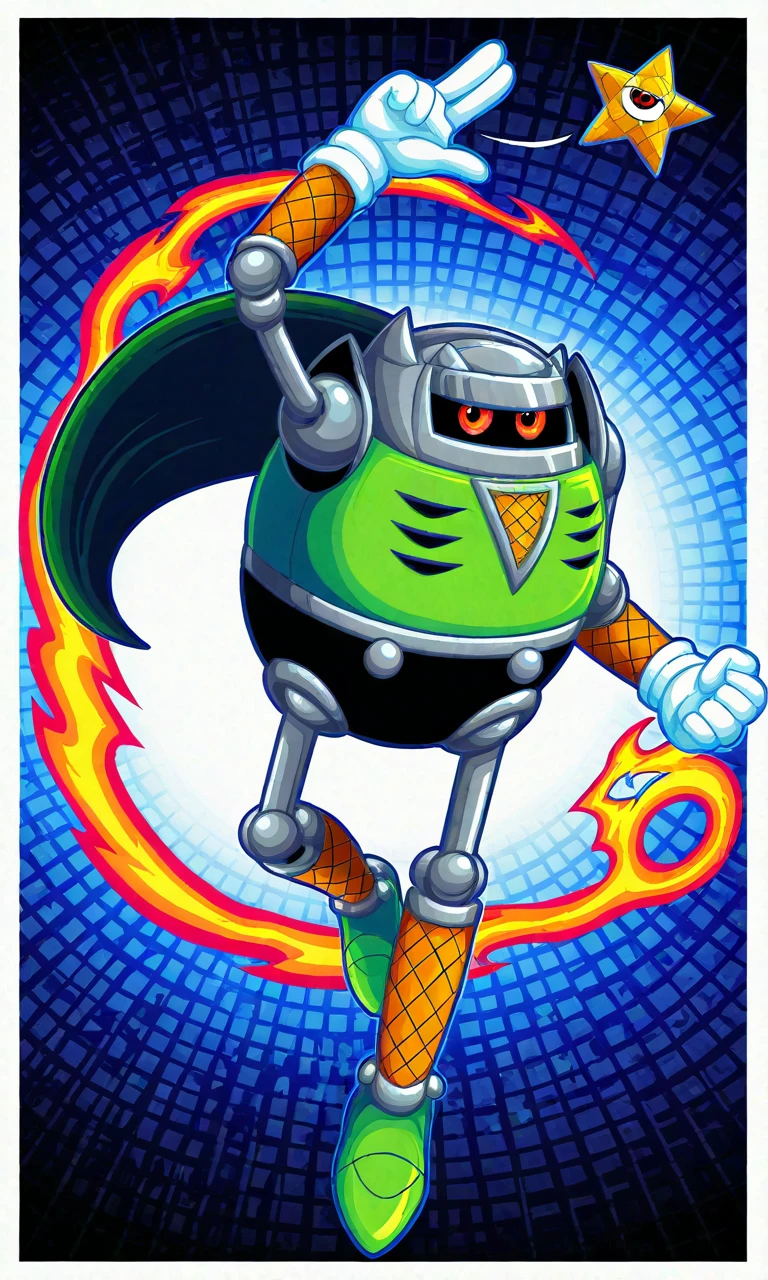 HeavyShinobi, 1boy, robo, mecha, fully egg-shaped humanoid robot, ninja, green haori, yellow-triangular cross-pattern chest piece, black bottom torso, red eyes, gray appendages, green zōri-like forefeet, dark green scarf