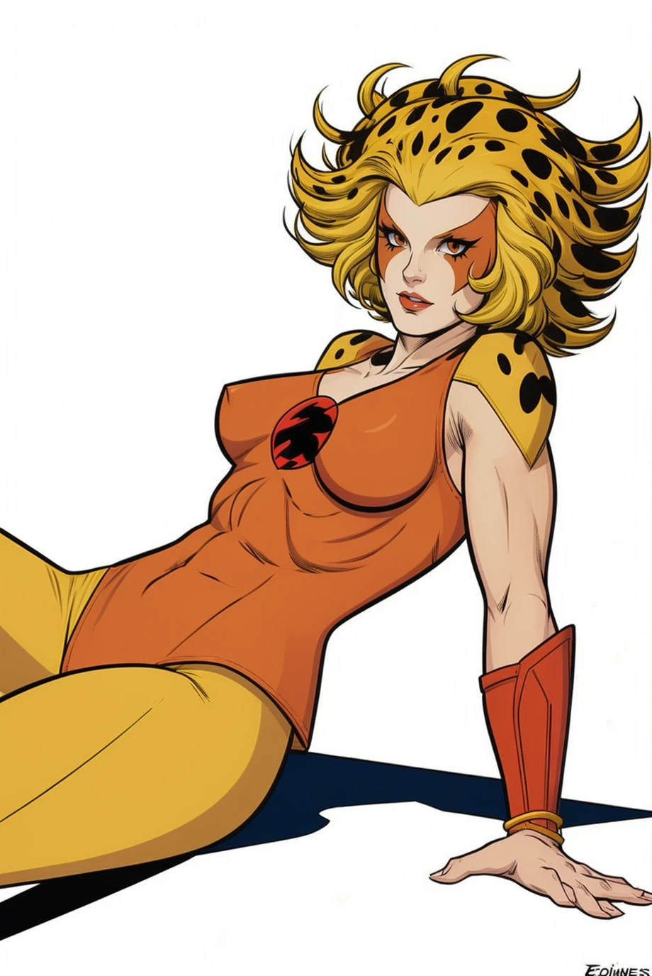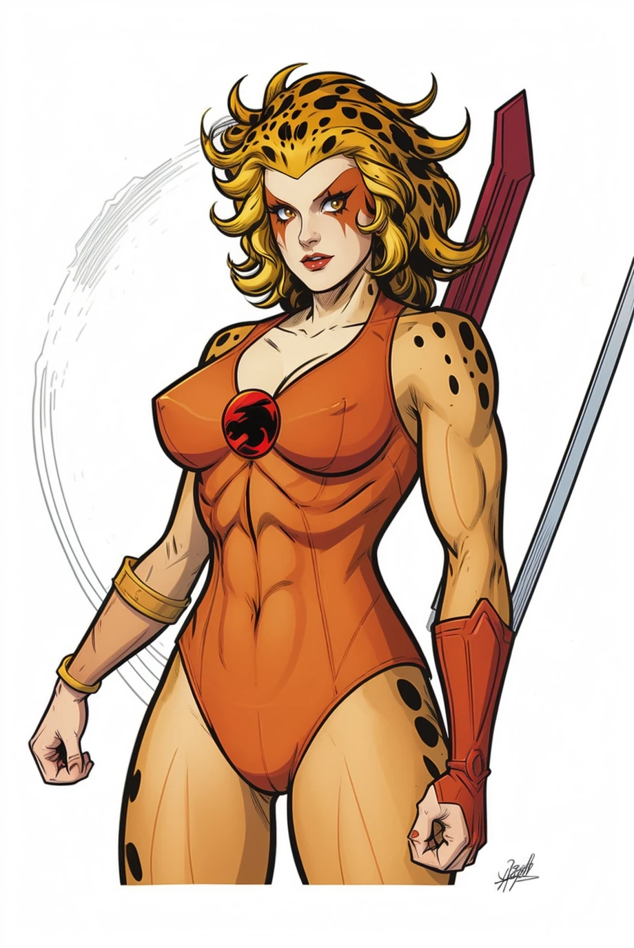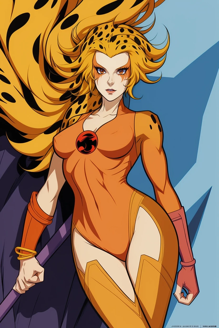 ๐๐ Trigger: CheetaraQuiron character, <lora:quiron_Cheetara_v2_lora:1.0>, retro artstyle, cartoon, facepaint, skintight bodysuit, makeup, leotard, muscle body, abs, muscle legs