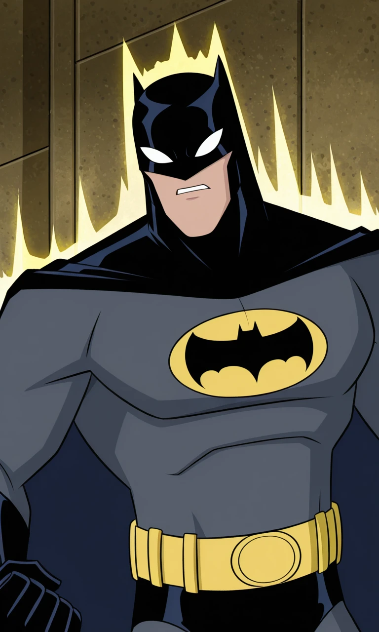 The_Batman2004,1boy,solo,male focus,white eyes,no pupils,grey ,black cape,black gloves,yellow utility belt,superhero