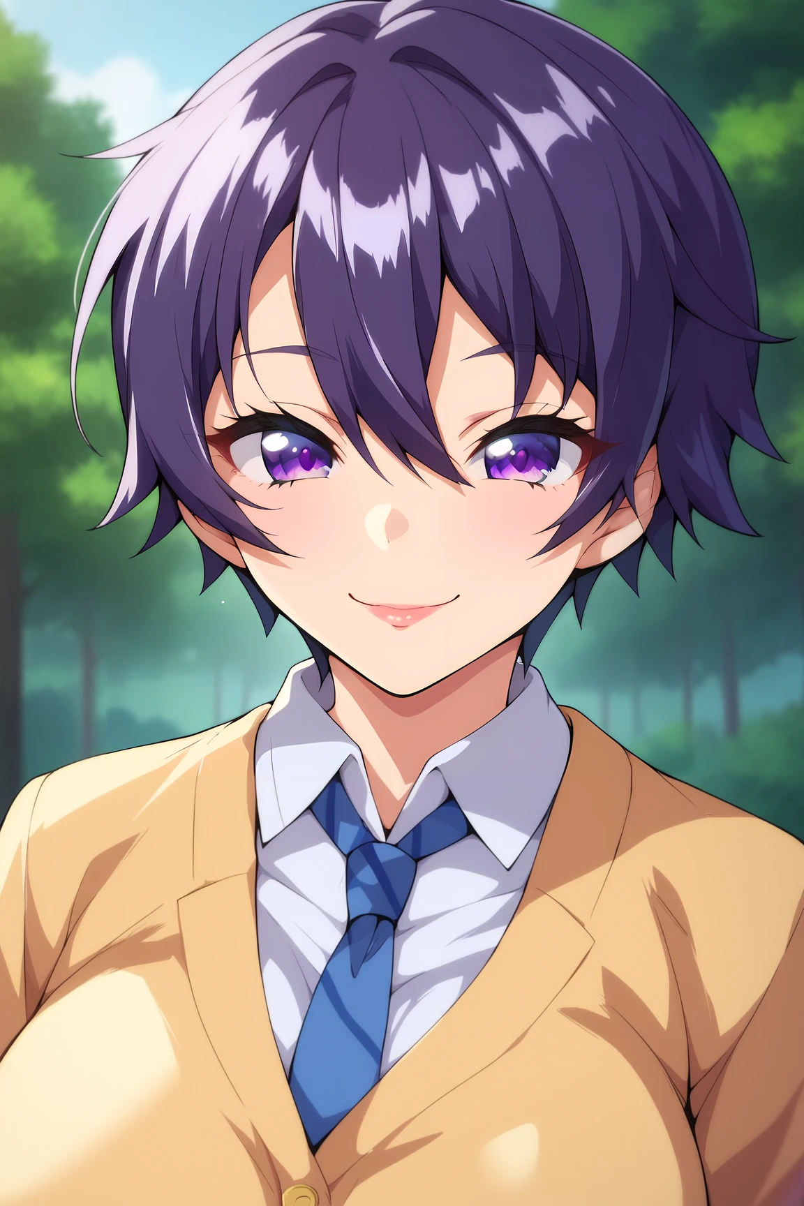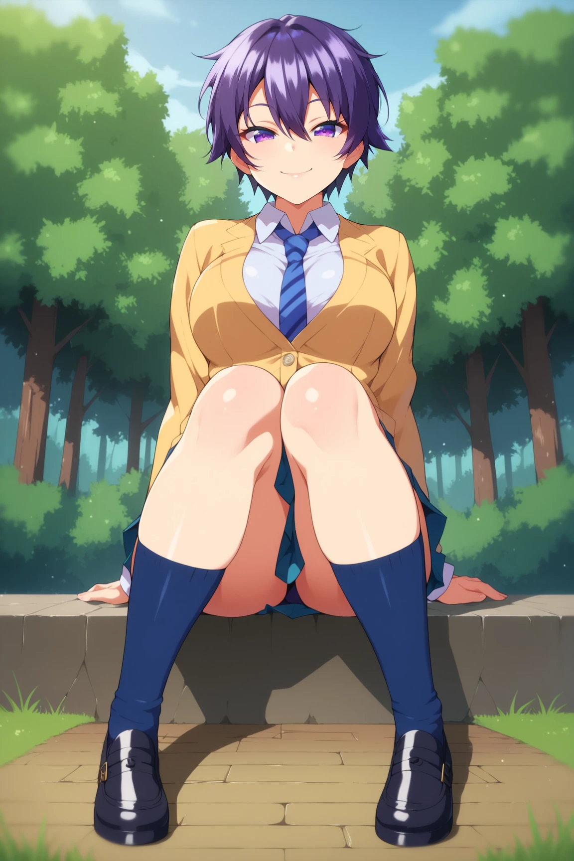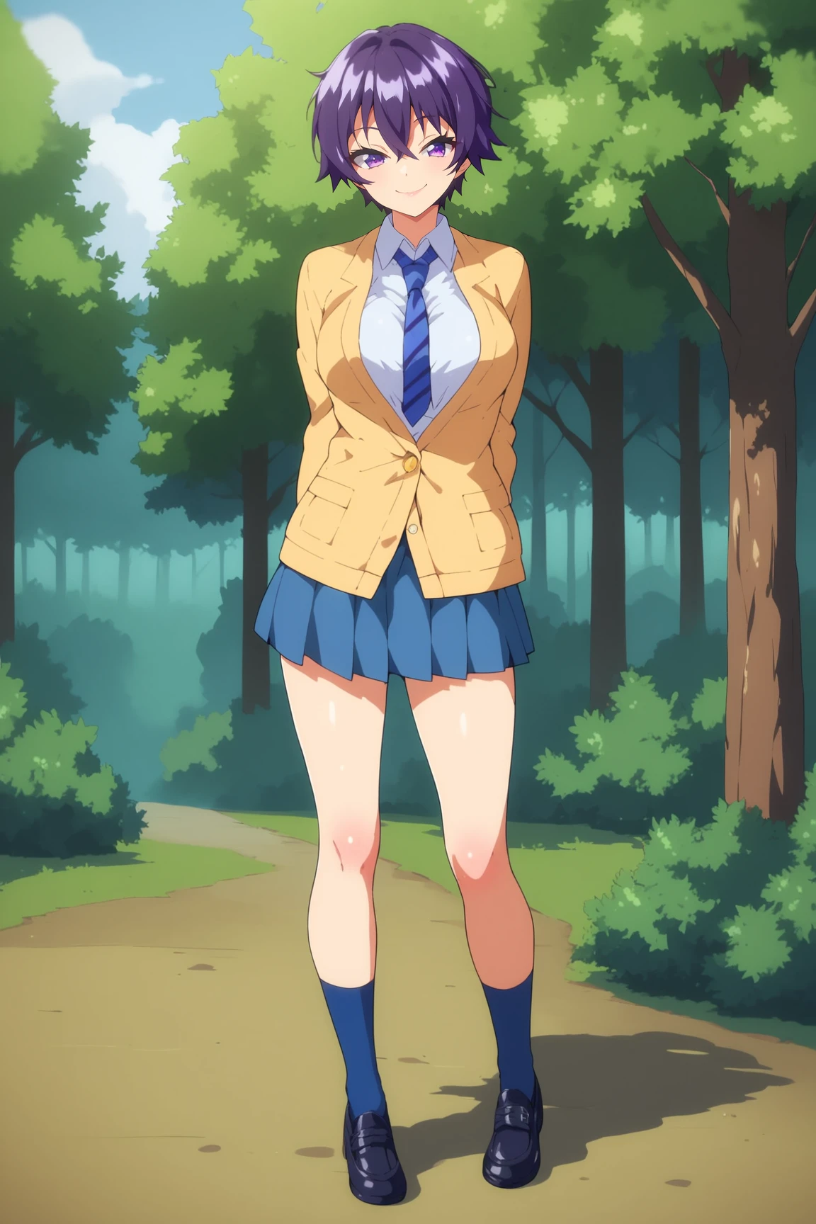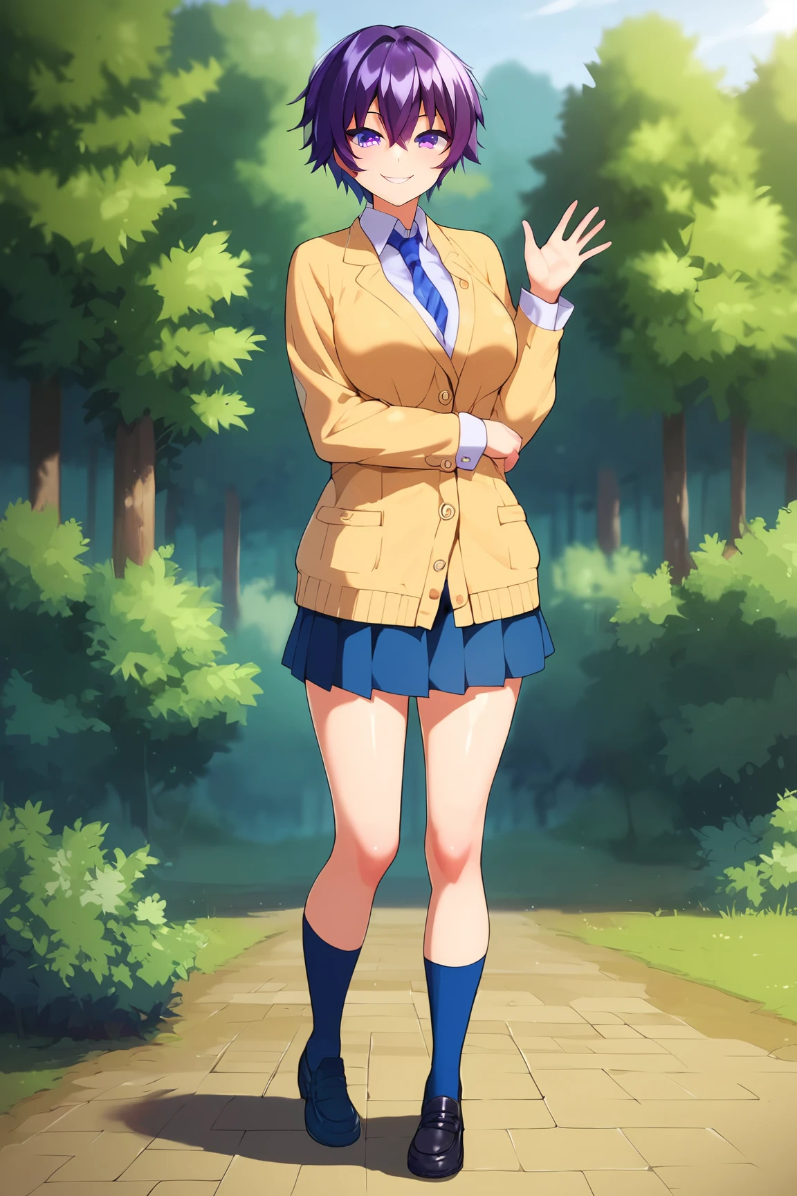 ➜ MakotoHimemiyaMKNXL, purple eyes, purple hair, short hair, hair between eyes, large breasts, school uniform, yellow jacket, (closed jacket), blue necktie, white shirt, blue skirt, blue socks, black shoes]--|======[ 💗 My Settings: 💗 ]======|--[