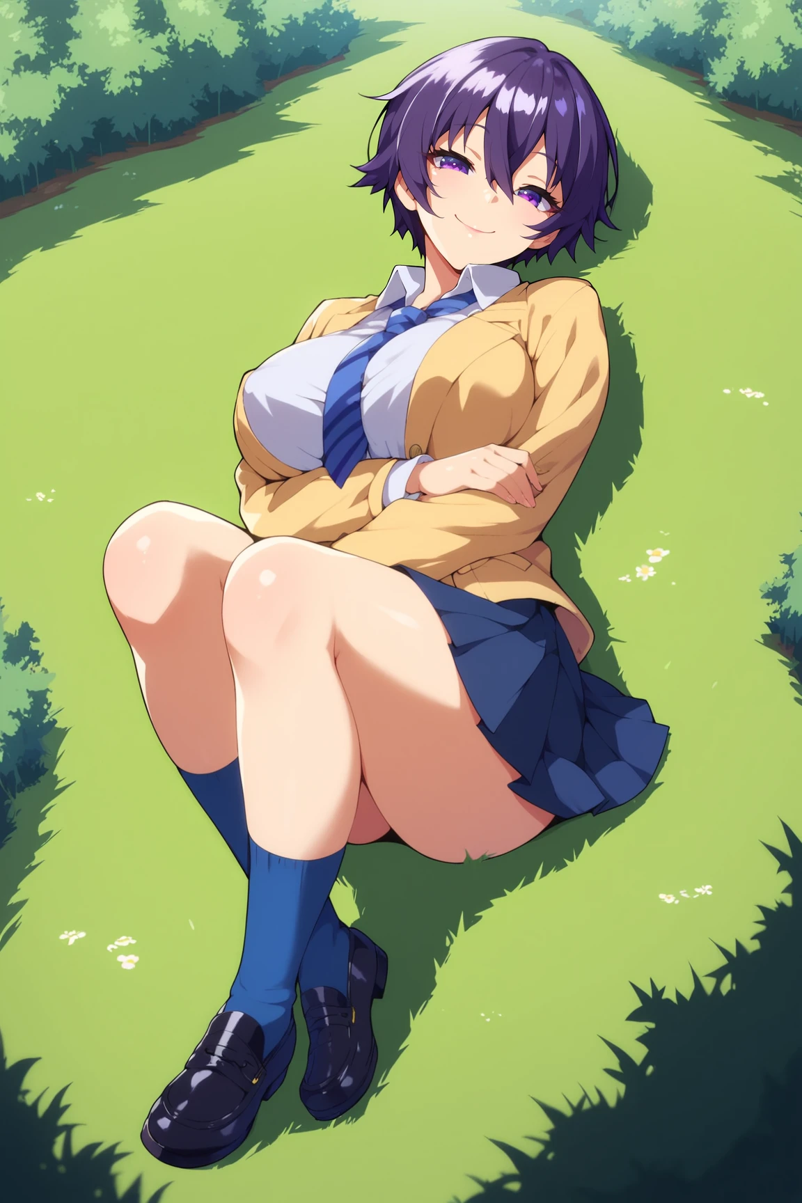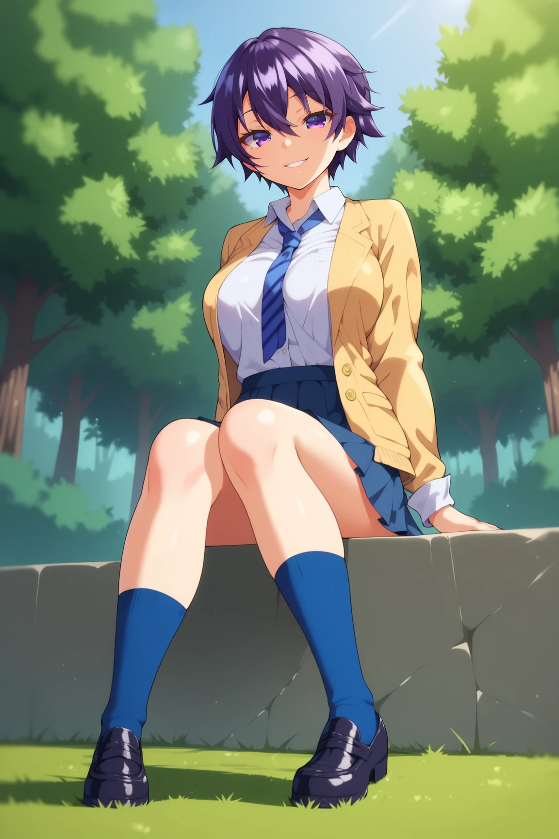 MakotoHimemiyaMKNXL, purple eyes, purple hair, short hair, hair between eyes, large breasts, school uniform, yellow jacket, (closed jacket), blue necktie, white shirt, blue skirt, blue socks, black shoes