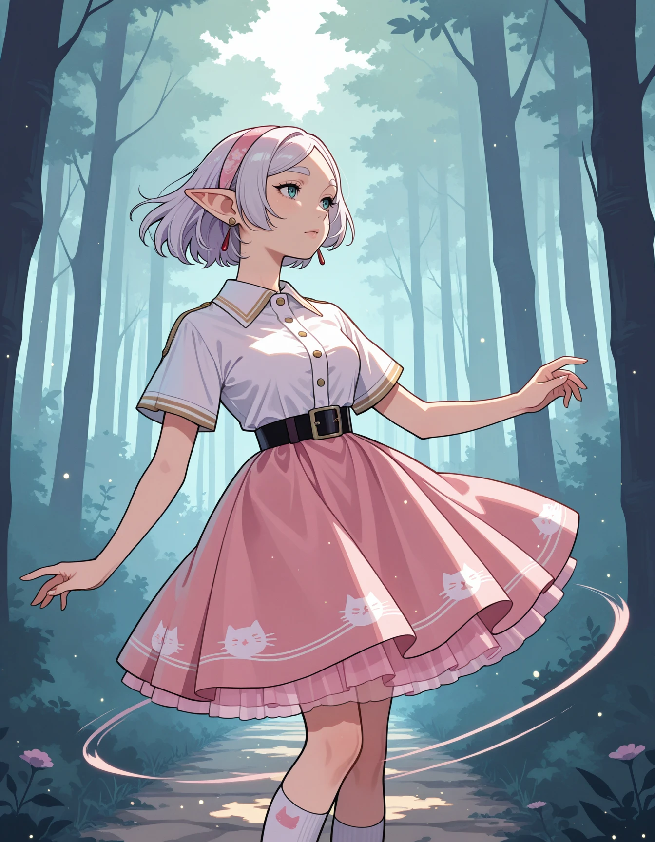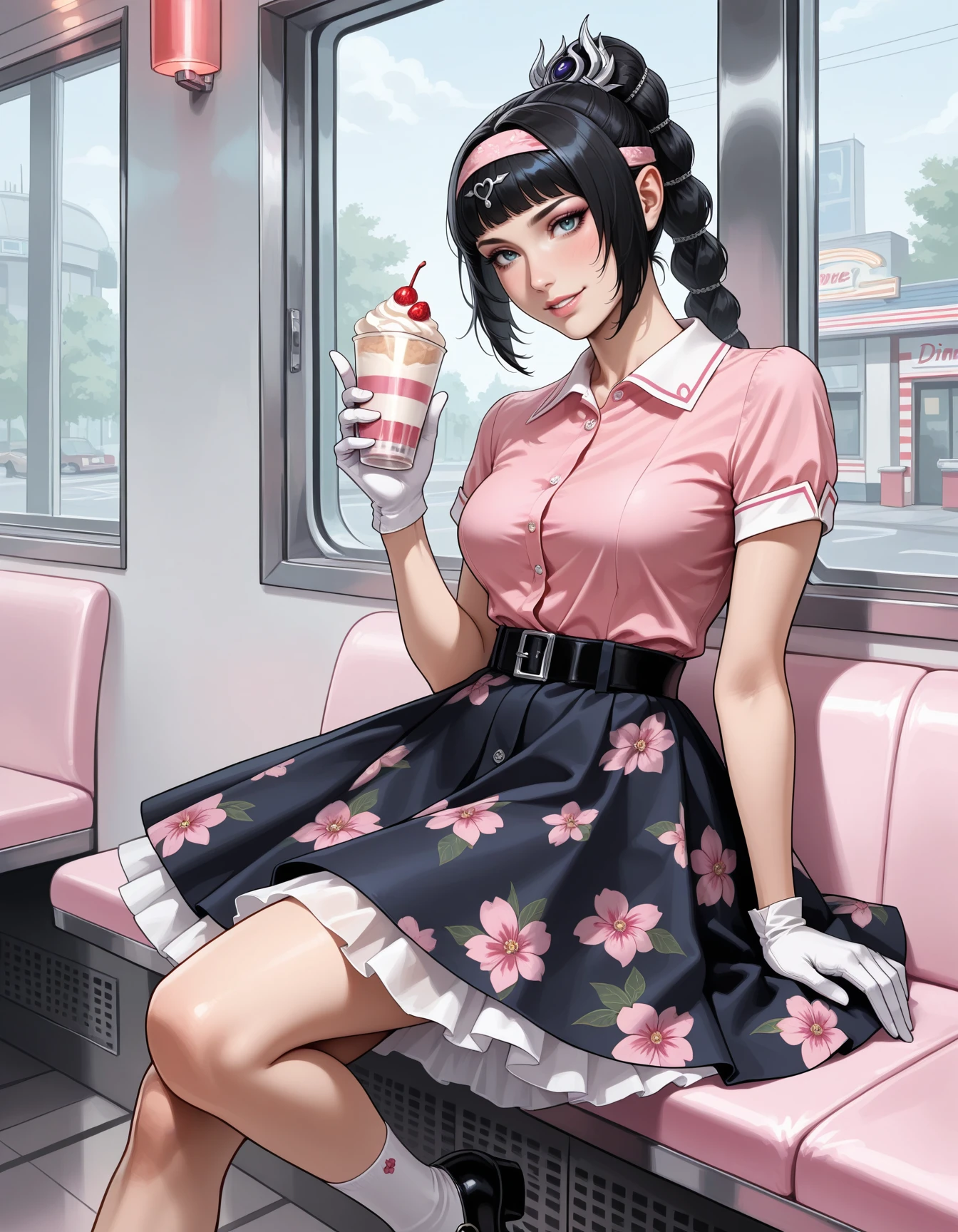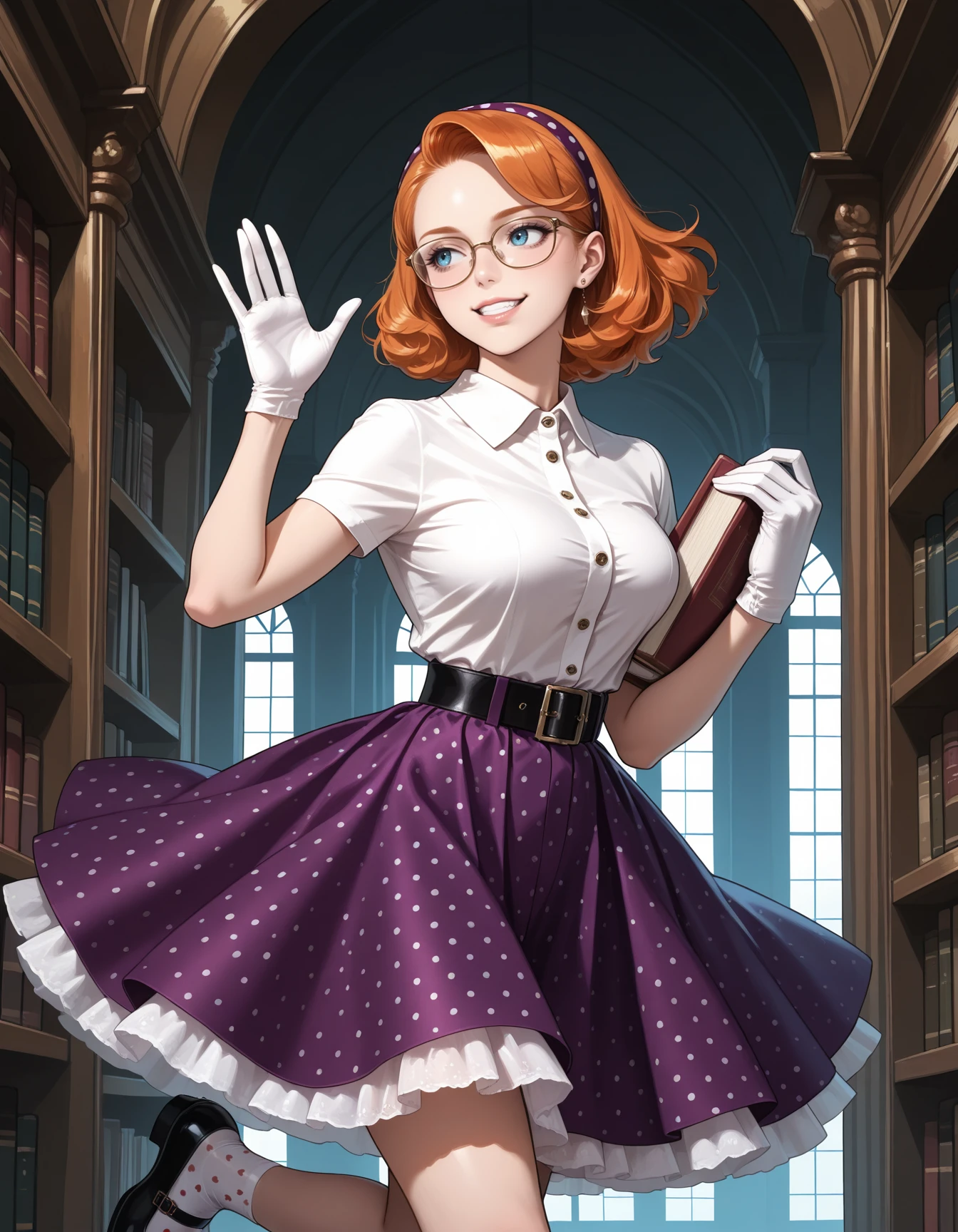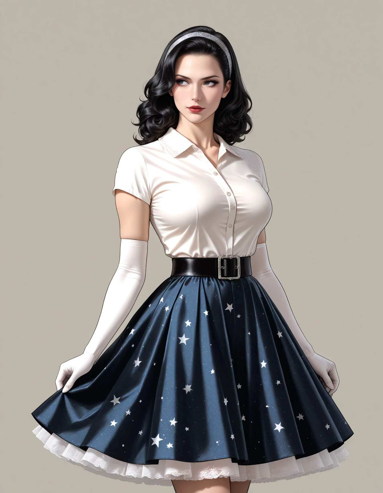 shirt, skirt, underskirt, voluminous skirt, crinoline, belt, short sleeves, shirt collar, vintage hair, socks, mary janes, gloves
