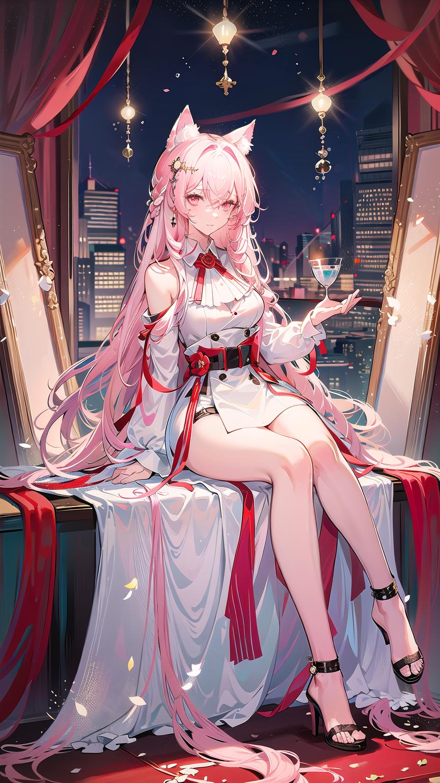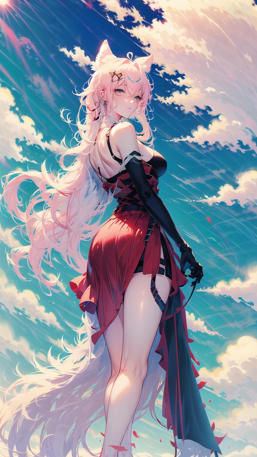 -->プロンプト:pozëmka&typewriter, pink eyes, wolf ears, wolf girl, animal ears, black bra, animal ear fluff, thigh strap, red skirt, underwear, high-waist skirt, pelvic curtain