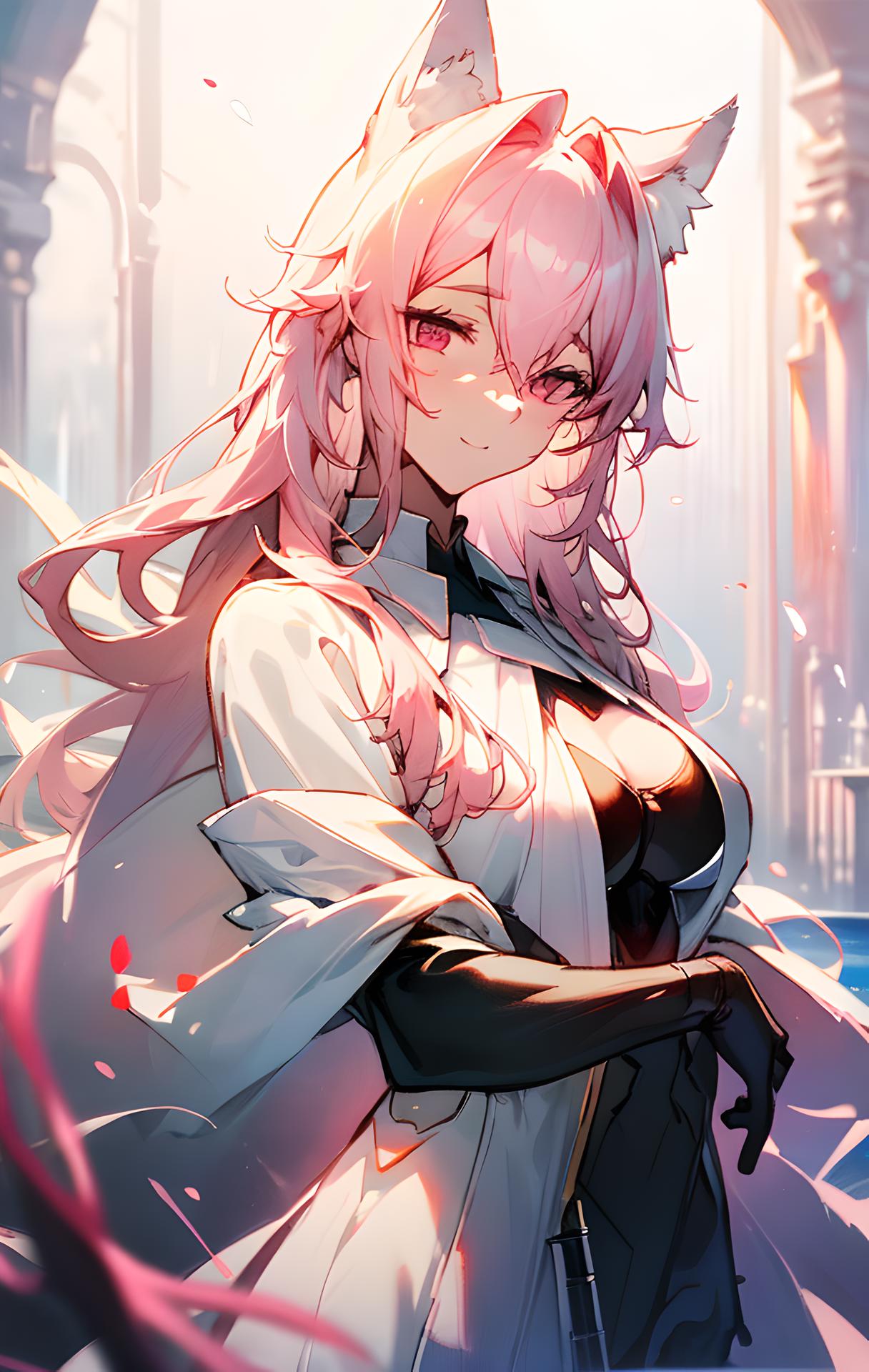 1girl, pink hair, solo, breasts, animal ears, long hair, wolf ears, pink eyes, (thight suit:1.5), hair between eyes, animal ear fluff <lora:PozëmkaV1.0:0.8>,pozëmka&typewriter, upper body,