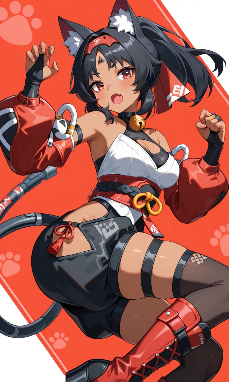 Nekomiya Mana (Zenless Zone Zero), short hair, black hair, red eyes, ponytail, medium breasts, hairband, skin fang, cat ears, animal ear fluff, dark-skinned female, cat tail, cat girl, forehead mark, red hairband, two tails, forehead jewel, mechanical tail, sidelocks, fangs, thighs, bare shoulders, detached sleeves, puffy sleeves, black thighhighs, thigh strap, black shorts, bridal gauntlets, jingle bell, neck bell, black gloves, fingerless gloves, corset, hip vent, clothing cutout, knee boots, puffy shorts, red boots, red sleeves, sleeveless shirt, red bodysuit, red ninja