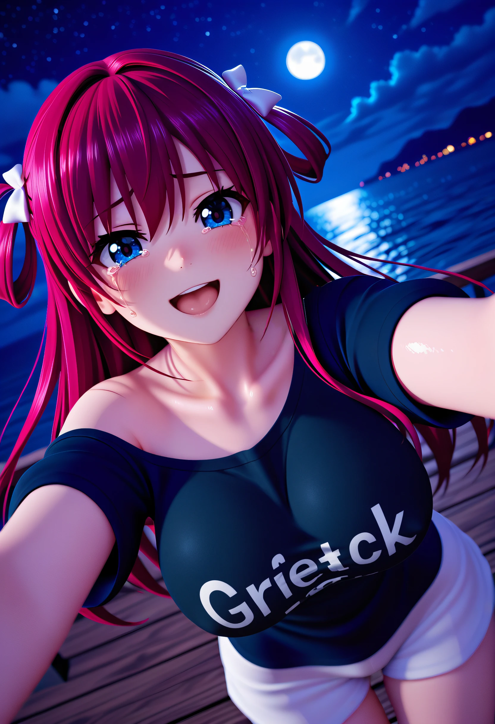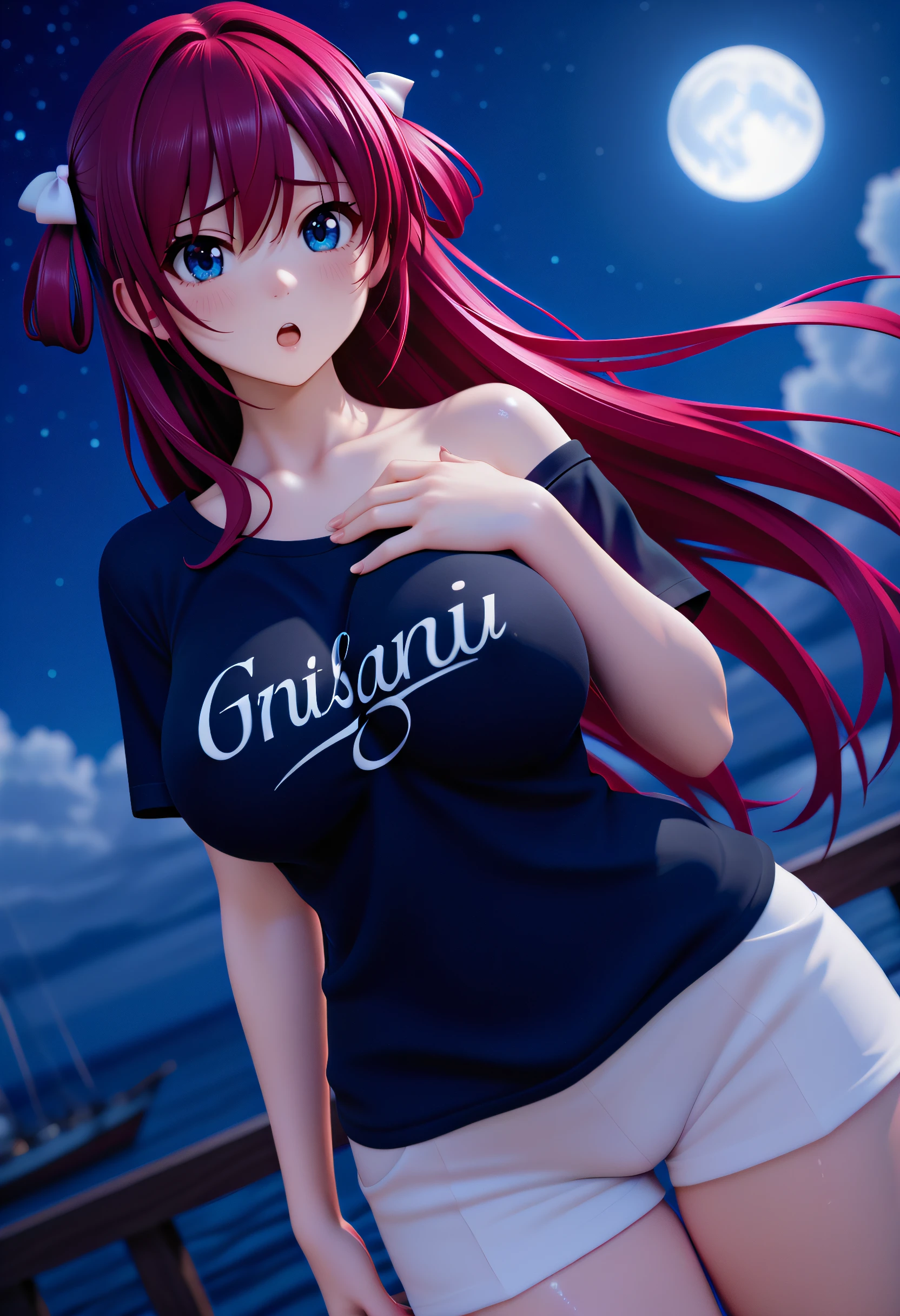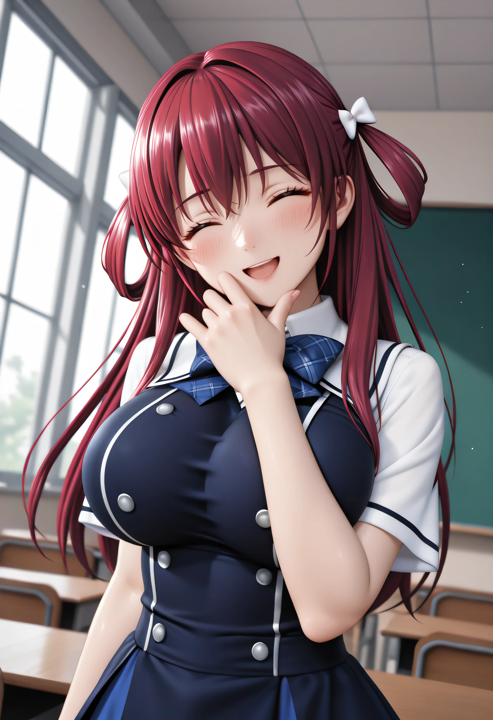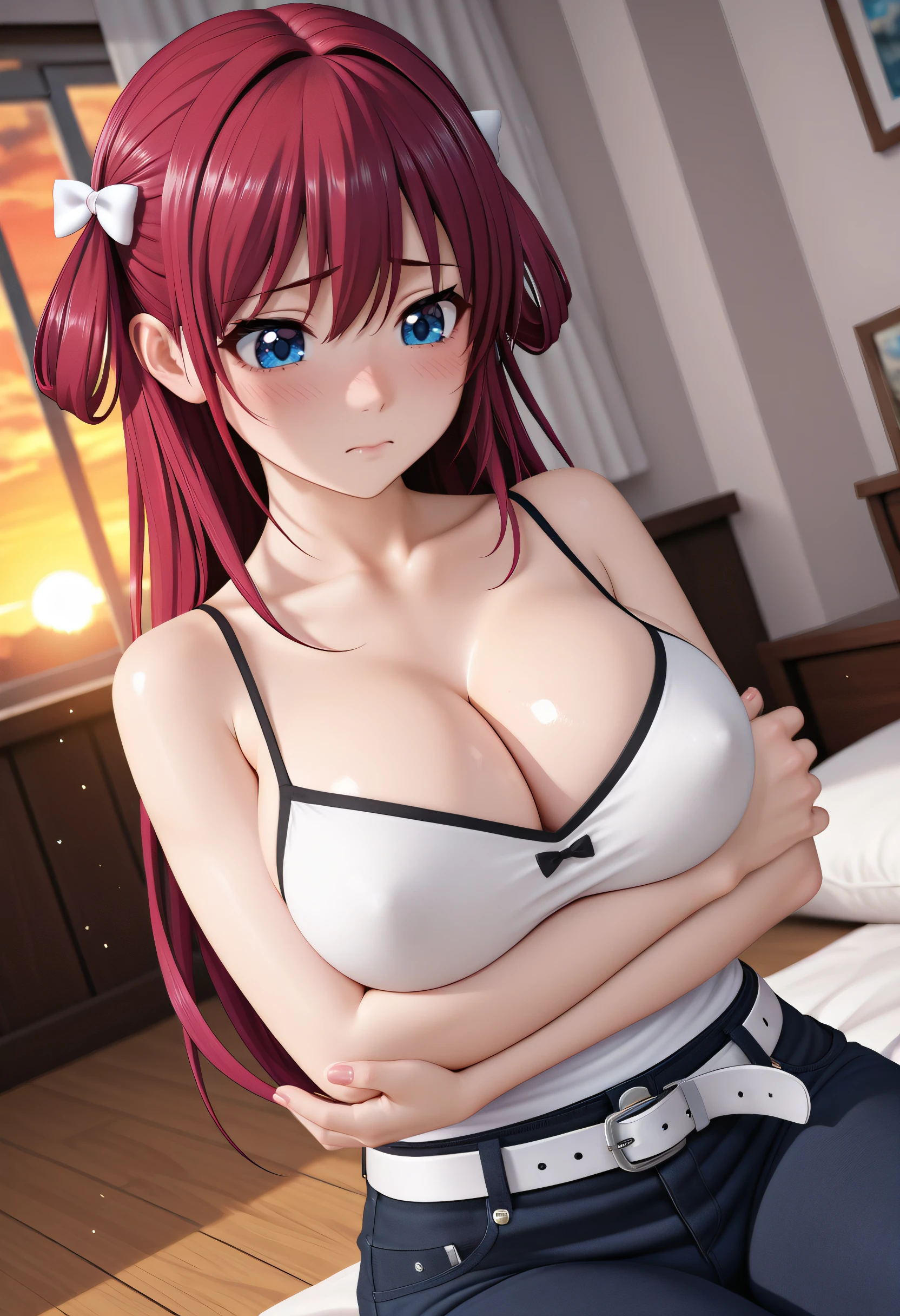 Main Prompt: suou amane (grisaia), 1girl, solo, long hair, red hair, bangs, large breasts, blue eyes, two side up, hair bow, white bow, hair rings,