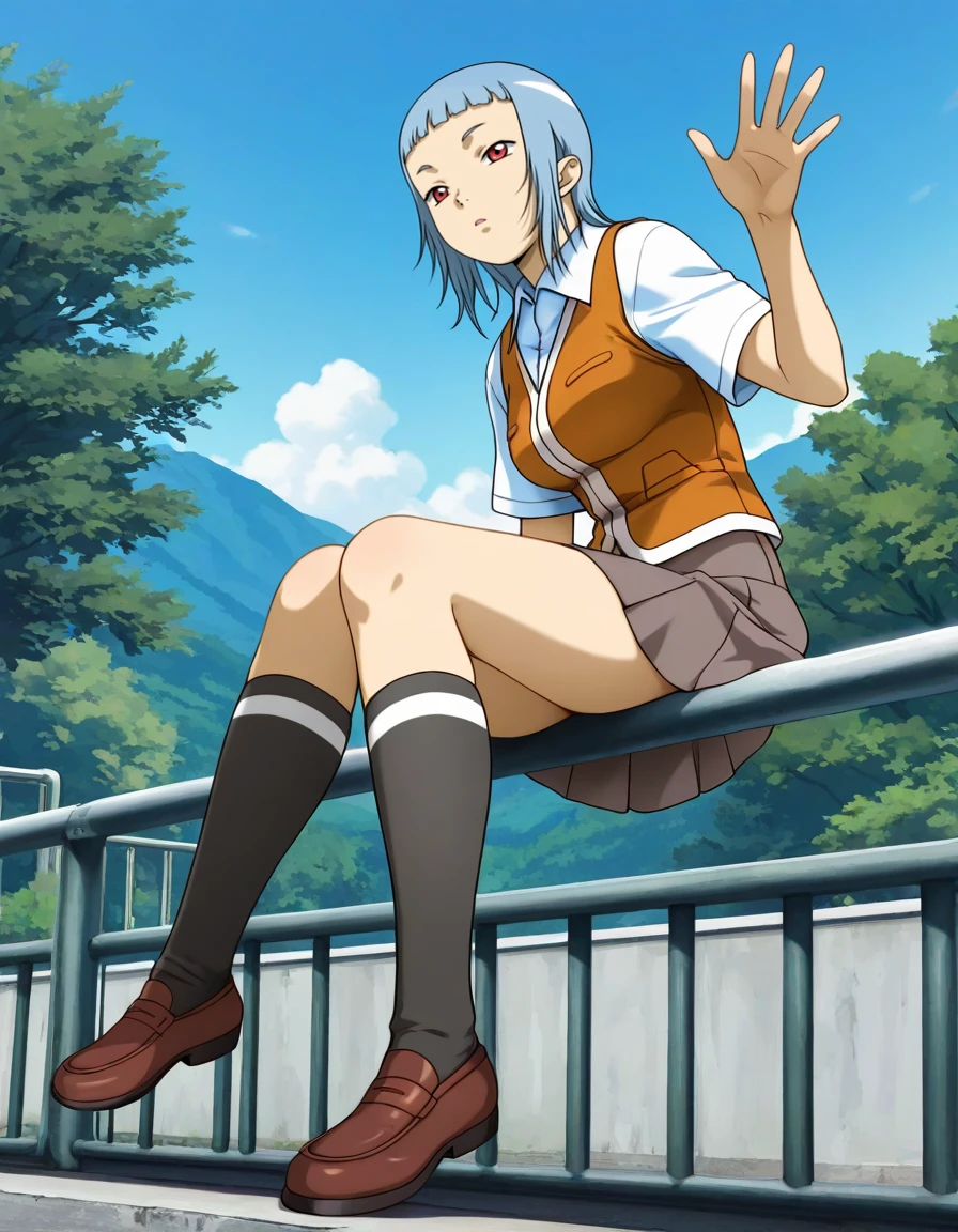 school uniform, white collared shirt, orange vest, short sleeves, grey pleated skirt, kneehighs, brown loafers