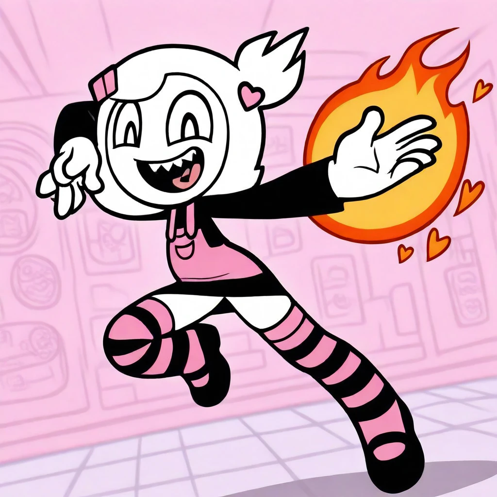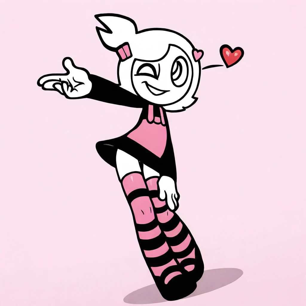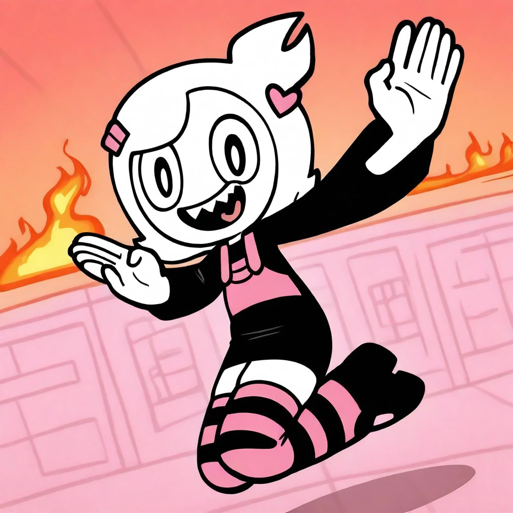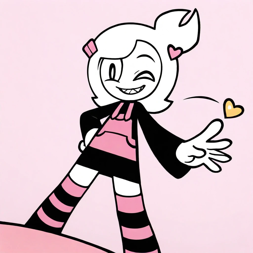 detailed, shading, masterpieces, amazing quality, best quality, newest, Cartoon-style, 1girl, solo, , adult, mature, thick lineart, big oval eyes, short white hair with side tuft, pink hair clip, heart pin, black shirt with long sleeves, pink-striped overalls, black skirt, mary janes, black-and-pink striped thigh-highs, simple bold shading,
