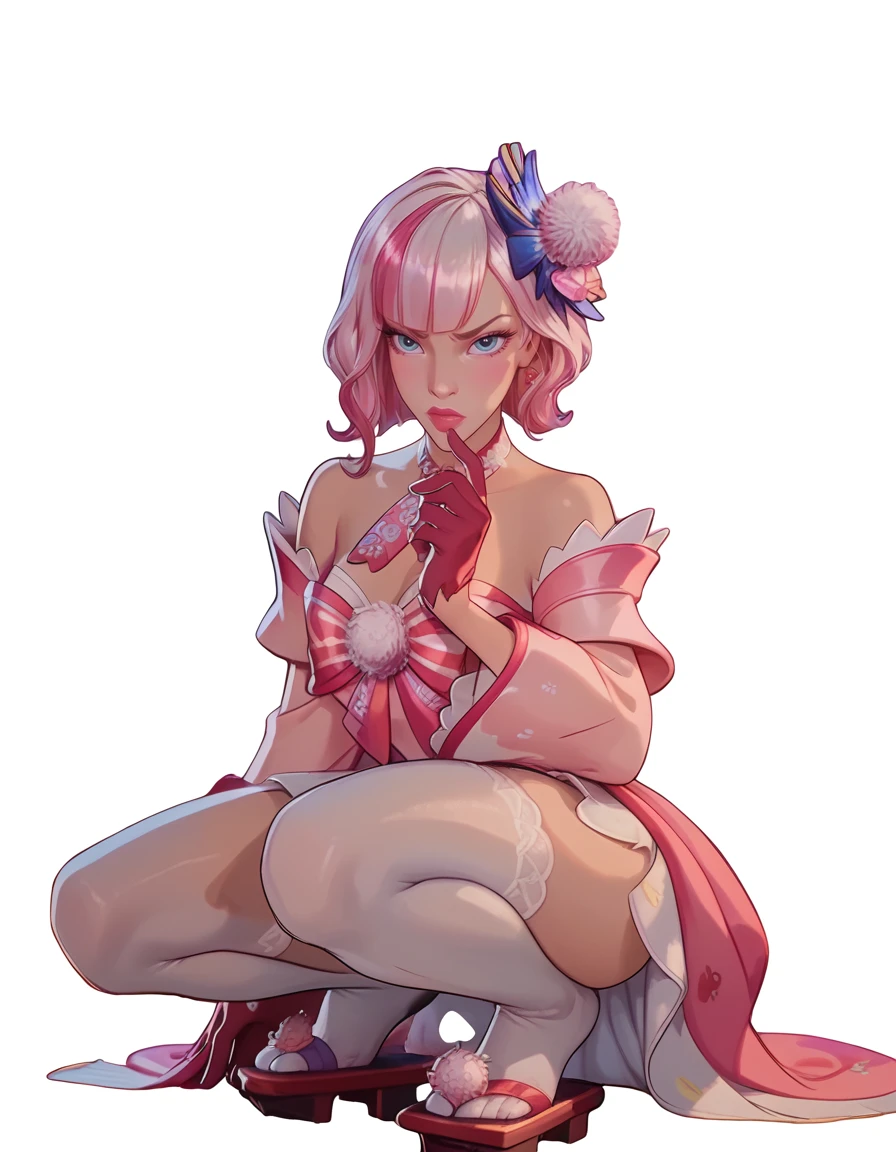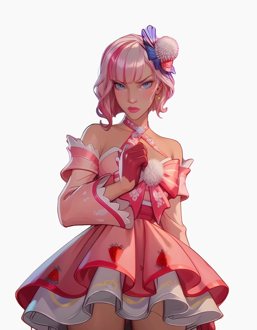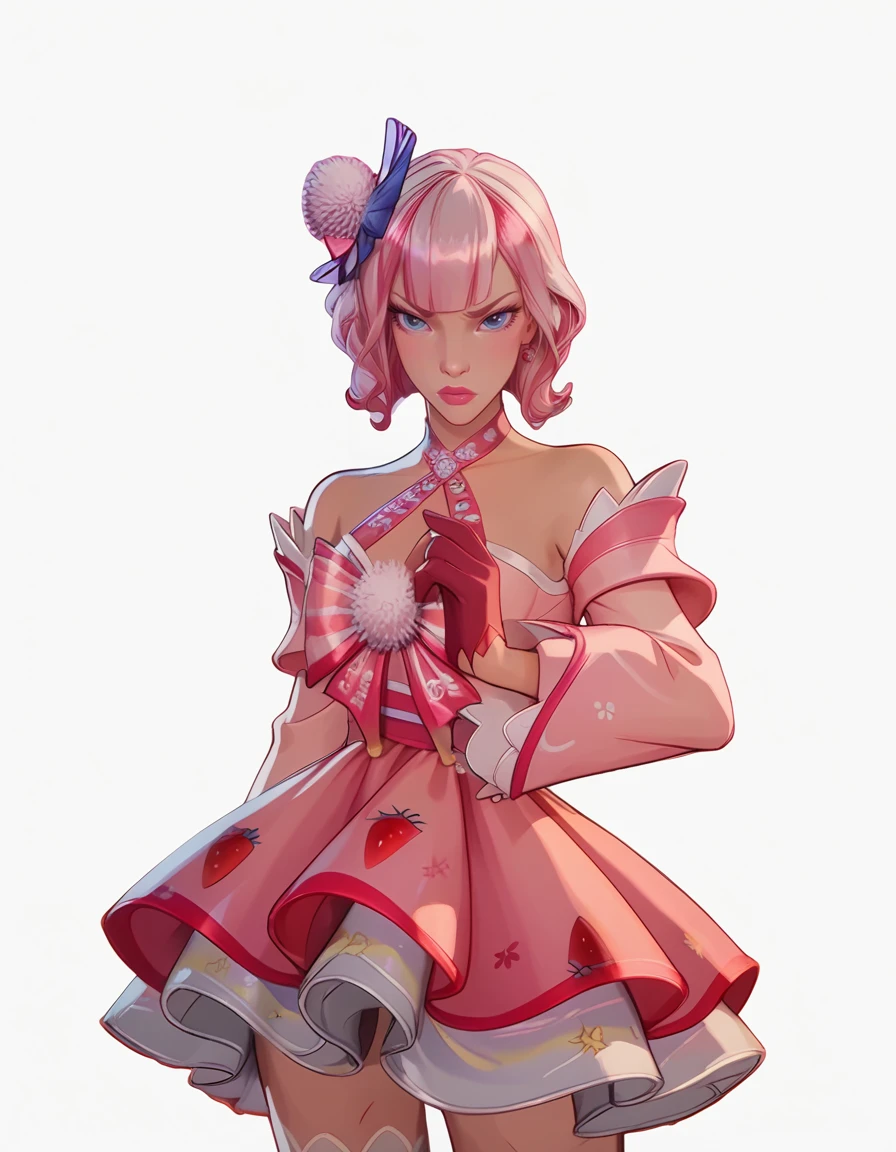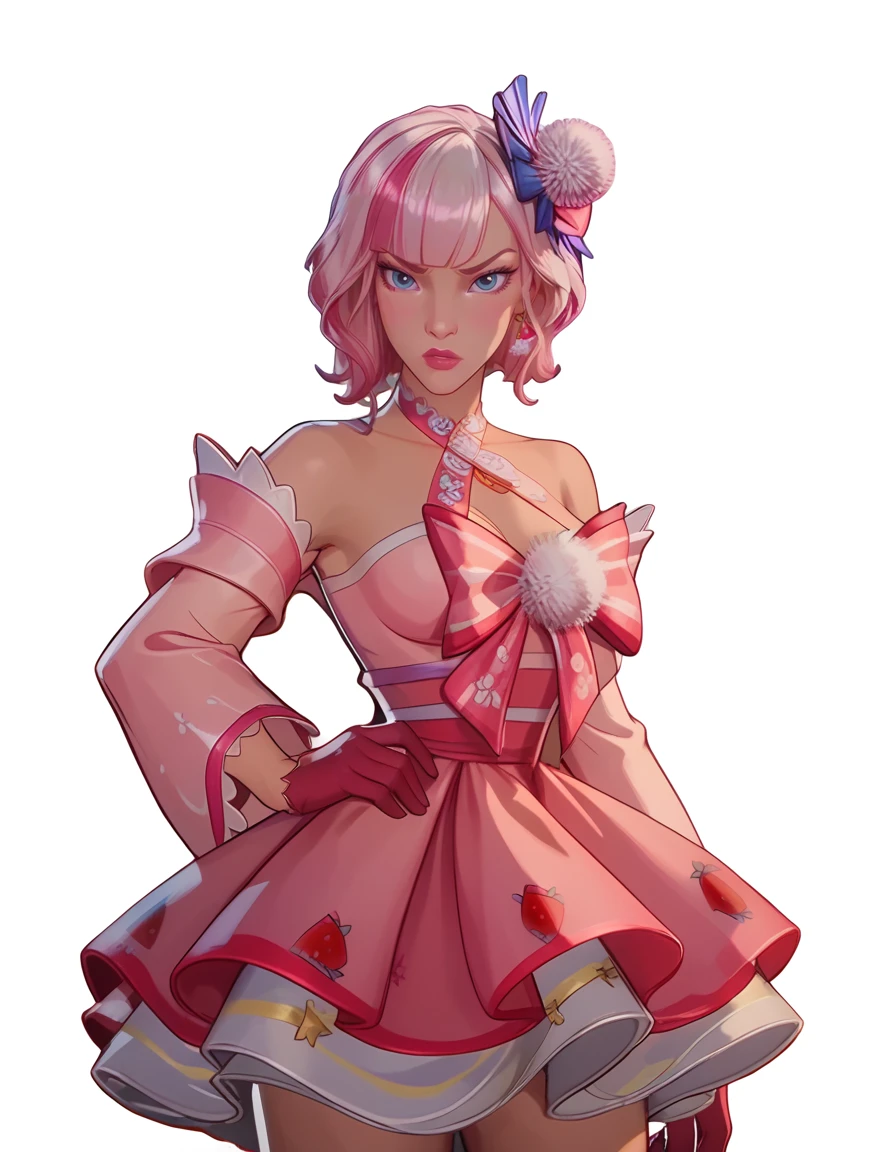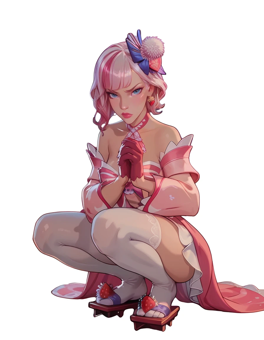 multicolored hair, white and pink hair, bangs, short hair, white fuzzball on head, pink mini dress, large pink sleeves, pink gloves, off shoulder dress, large pink bow on chest, strawberry decorations, white stockings, geta sandals,