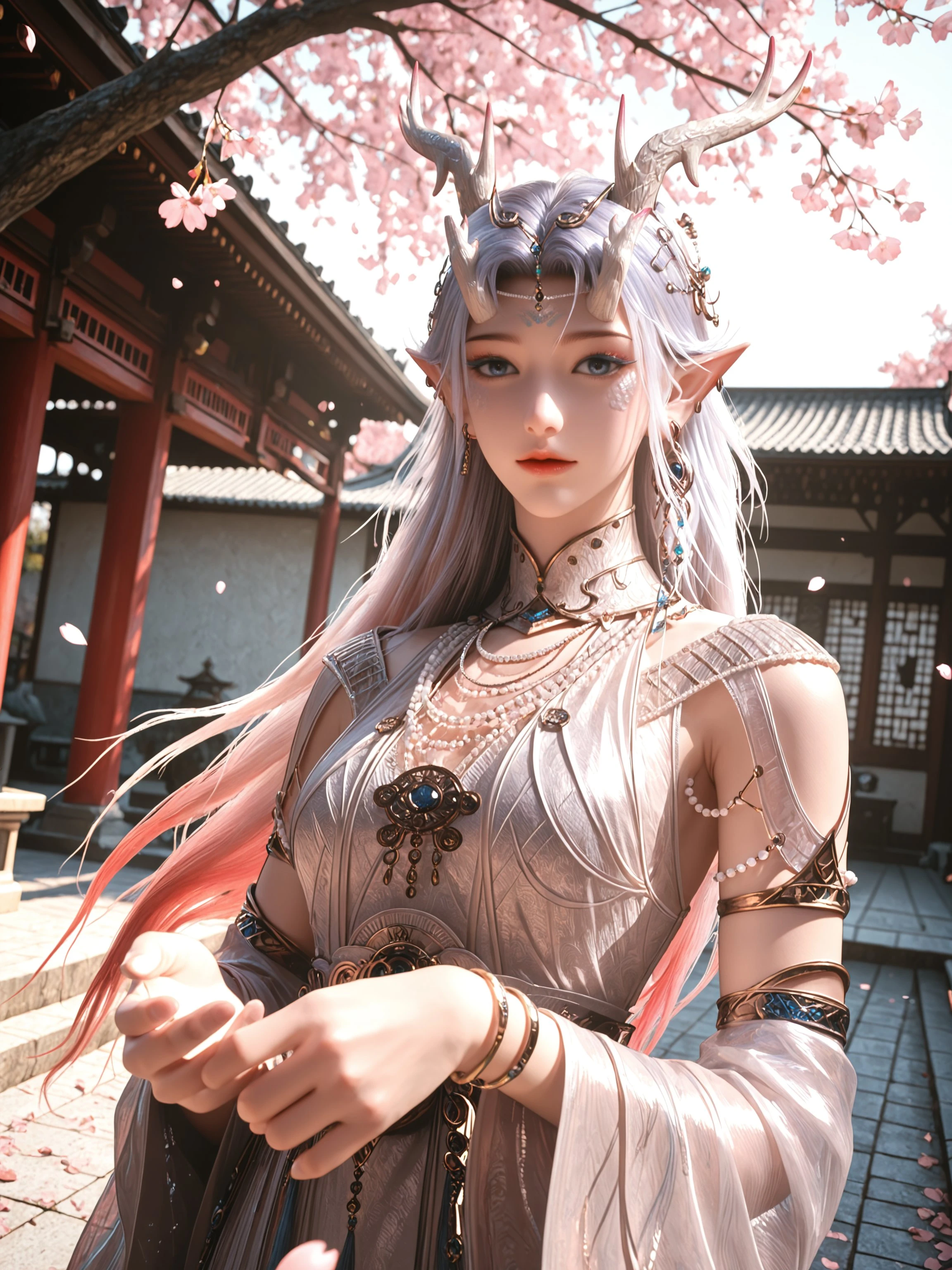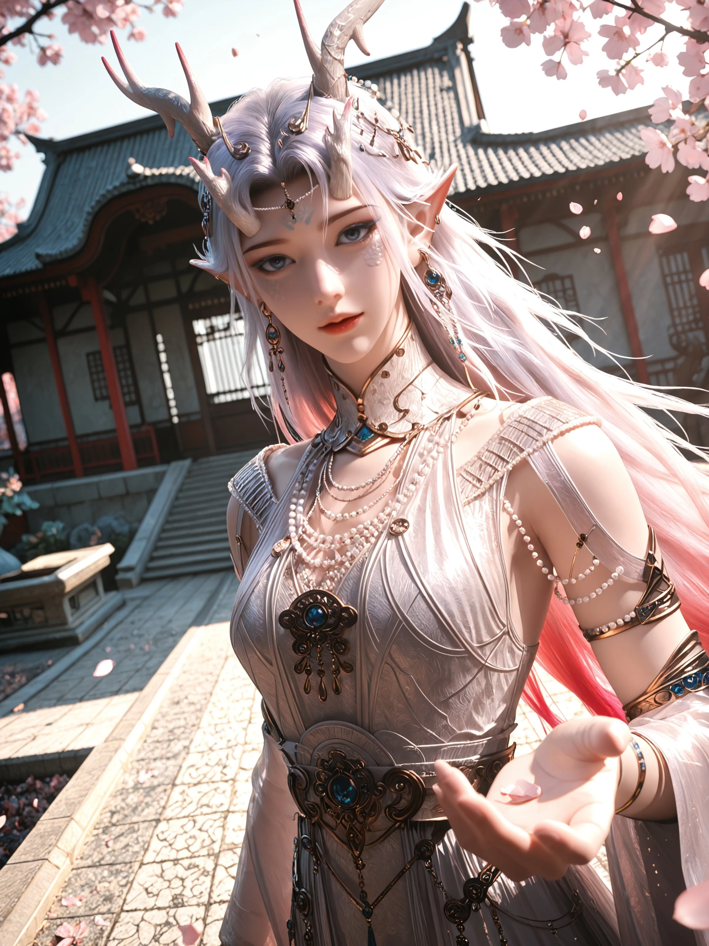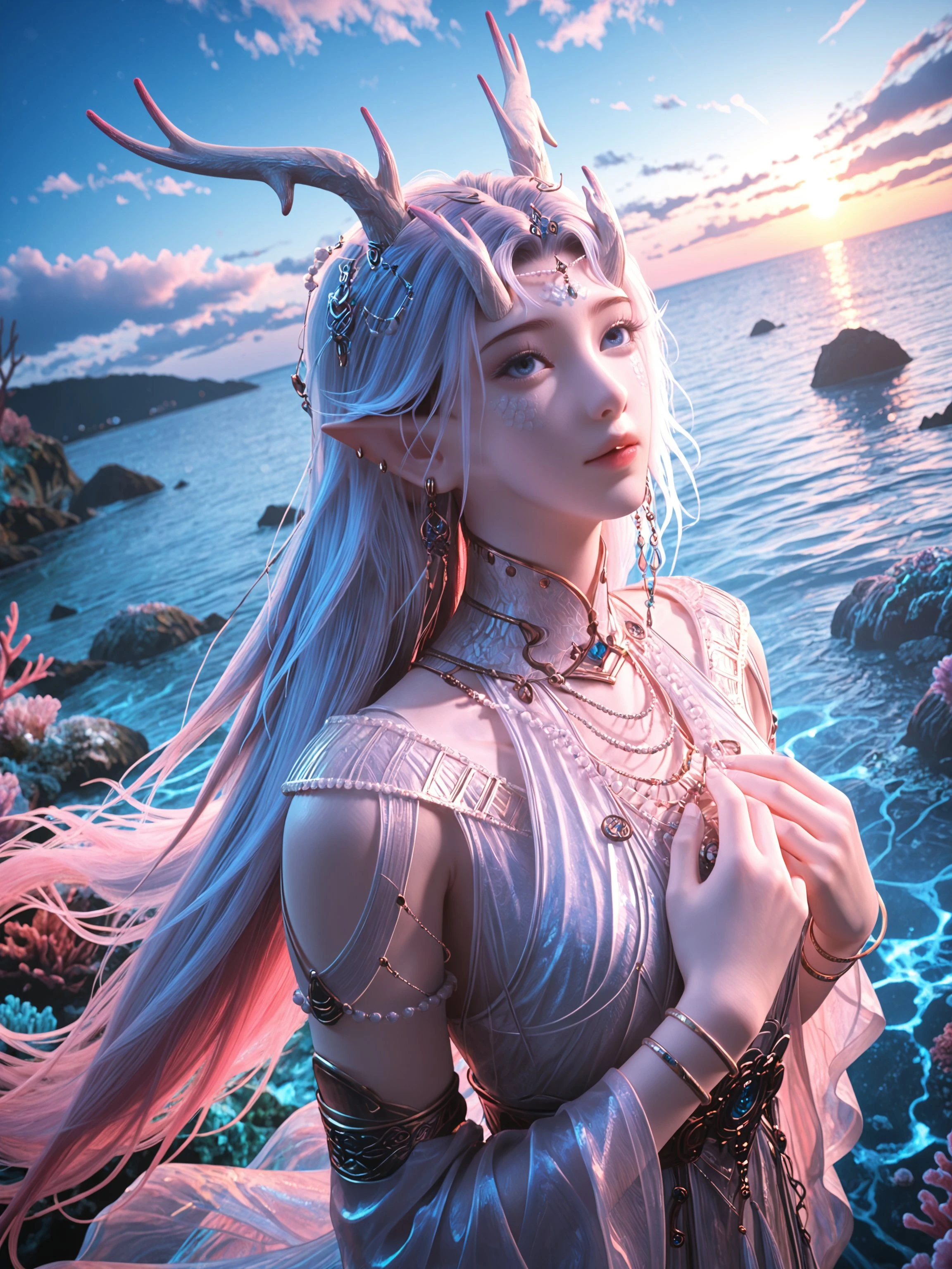 1girl,jewelry,solo,pointy ears,horns,long hair,dress,bracelet,antlers,detached sleeves,earrings,necklace,armlet,multicolored hair,blue eyes,dragon horns,dragon girl,