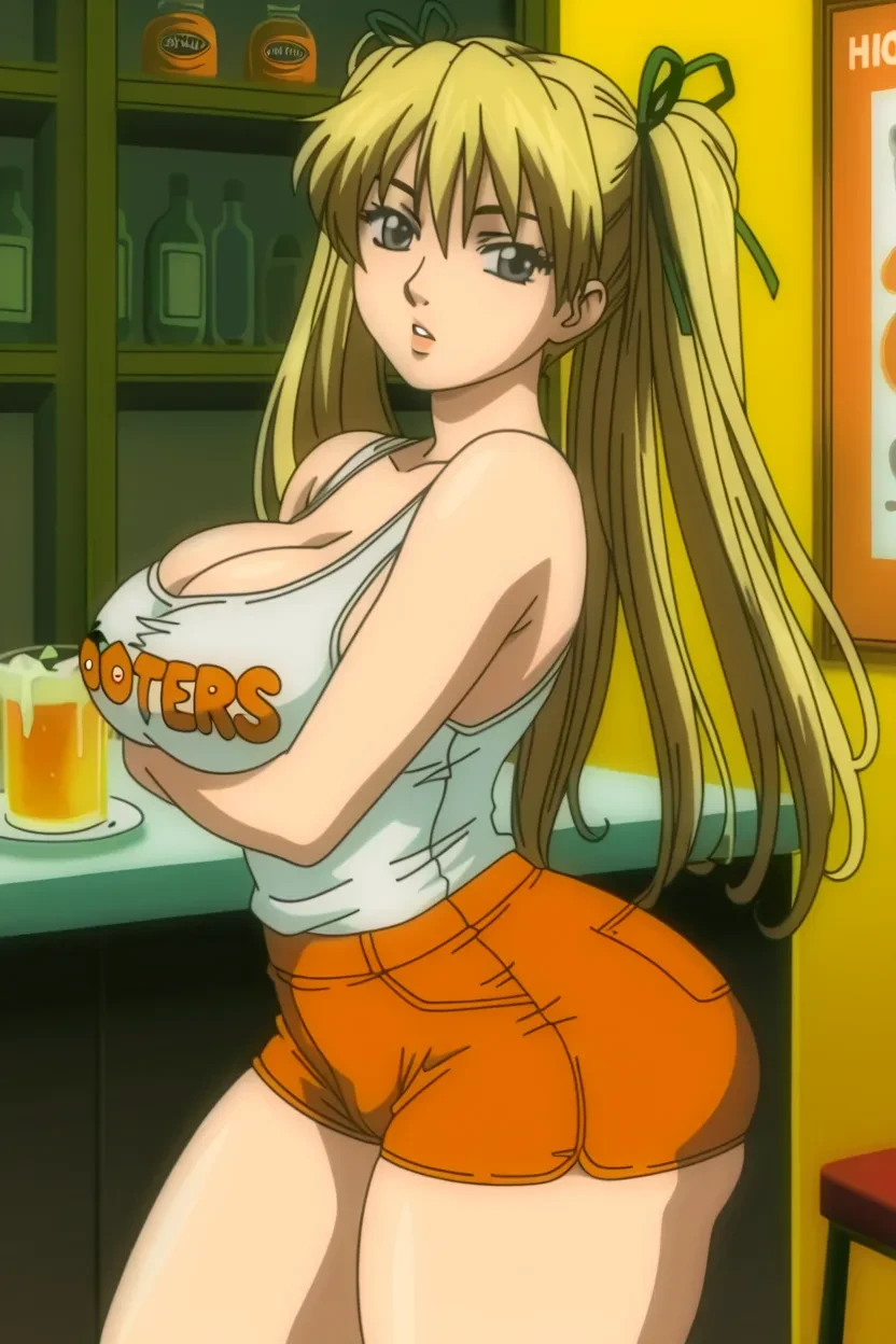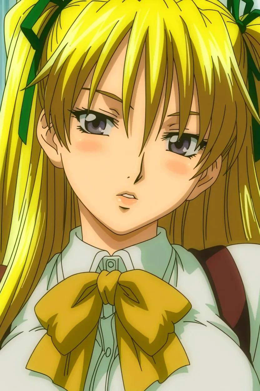 1girl, Kirishima (Stringendo+Accelerando Ultimatum Sera), twin tails, long hair, hair ribbon, blonde_hair, grey eyes, glossy lips, thick full lips, massive breasts, HD, 4k, High-Resolution, superb quality, no flaws, digitally remastered, clean animation, uncensored