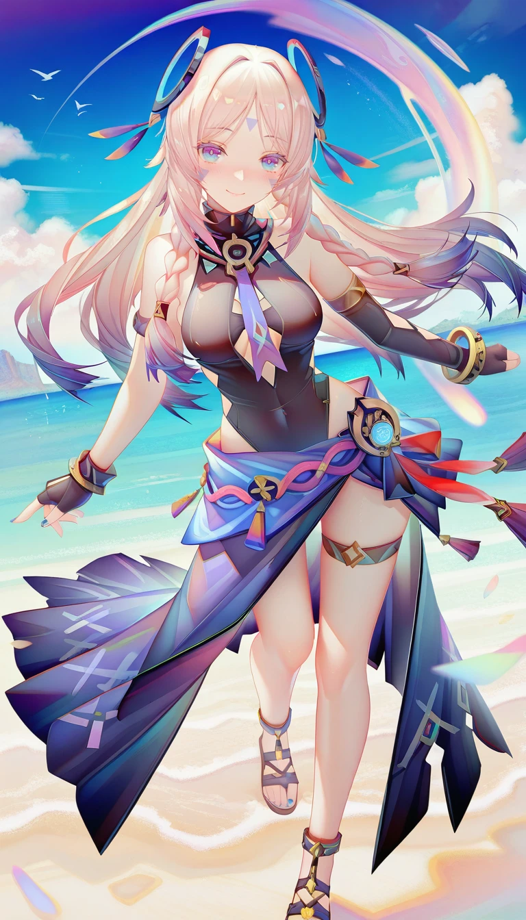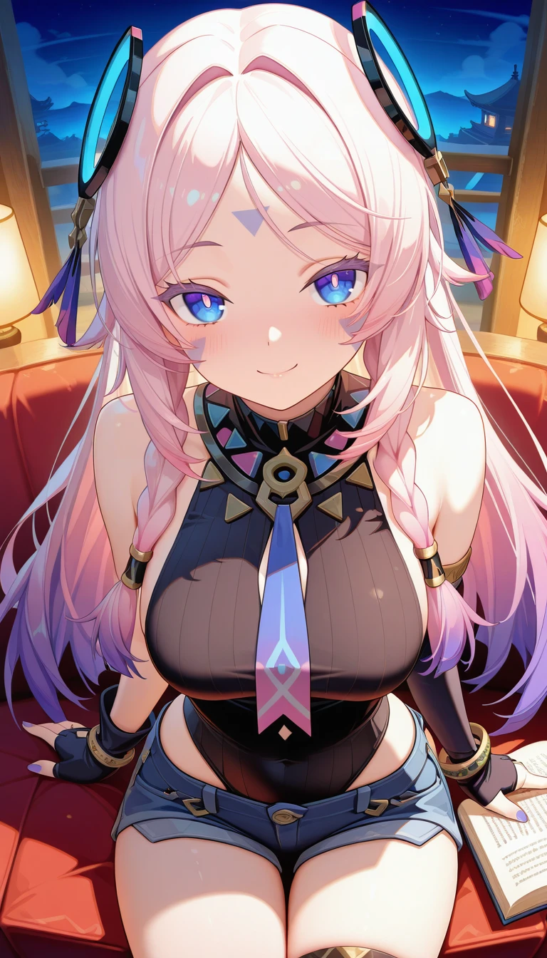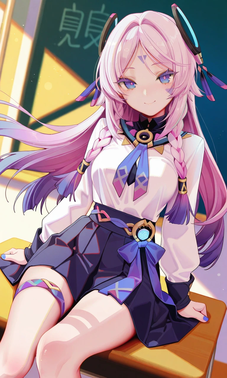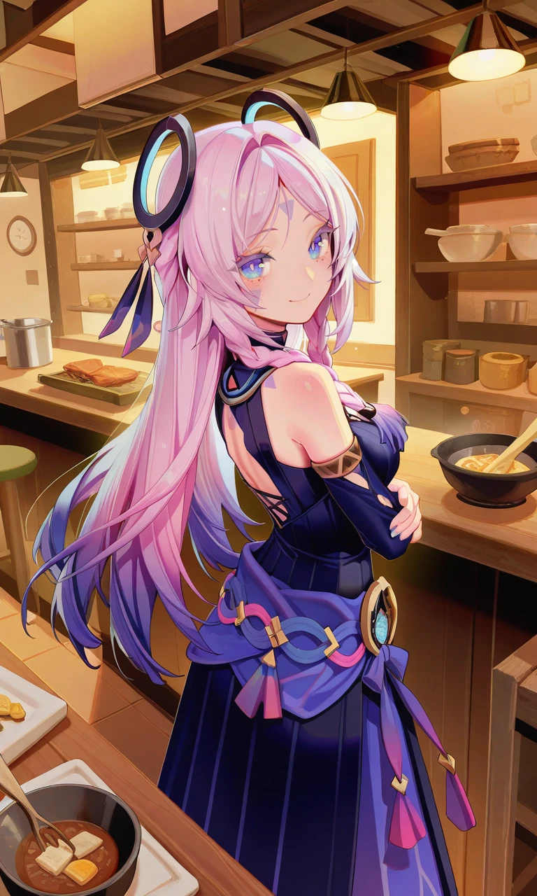 tj_citlali,long hair,double braid,blue eyes,bright pupils,face mark,ring hair ornament,lavender eyelashes,gradient hair,multicolored hair,pink hair,purple hair,hair intakes,parted bangs,