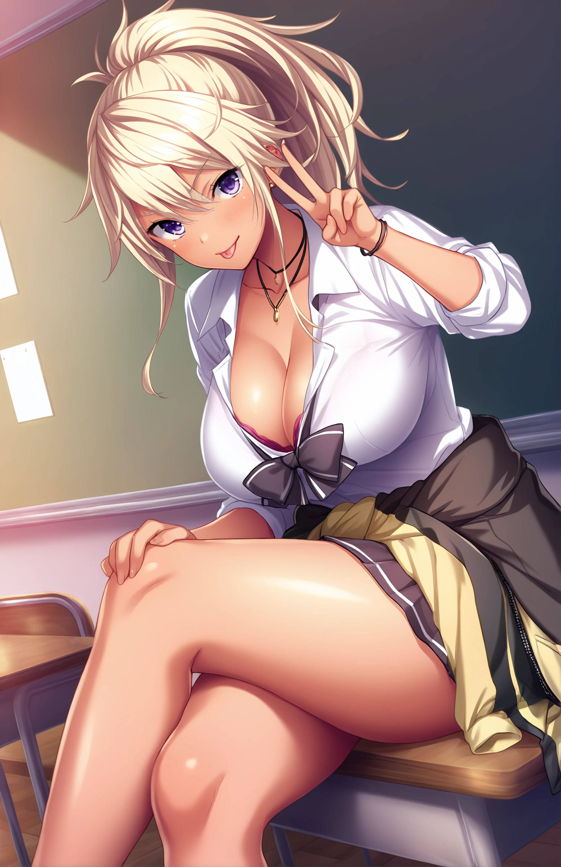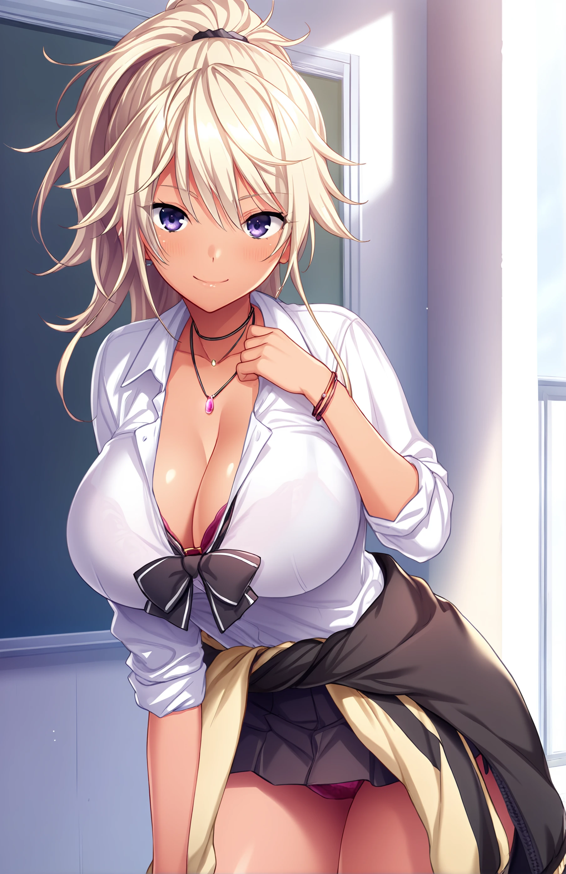RokudouAsami, long hair, breasts, skirt, blonde hair, large breasts, shirt, bow, cleavage, jewelry, underwear, school uniform, purple eyes, ponytail, pleated skirt, dark skin, black skirt, necklace, bra, sweater, dark-skinned female, clothes around waist, jacket around waist, sweater around waist