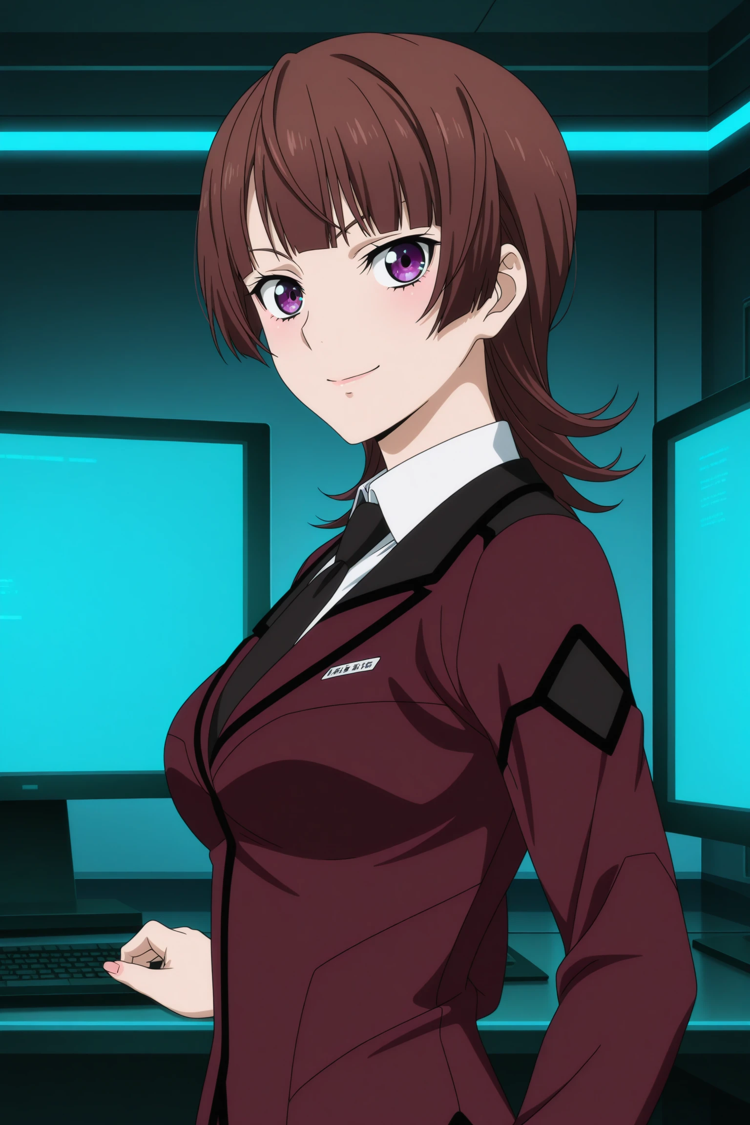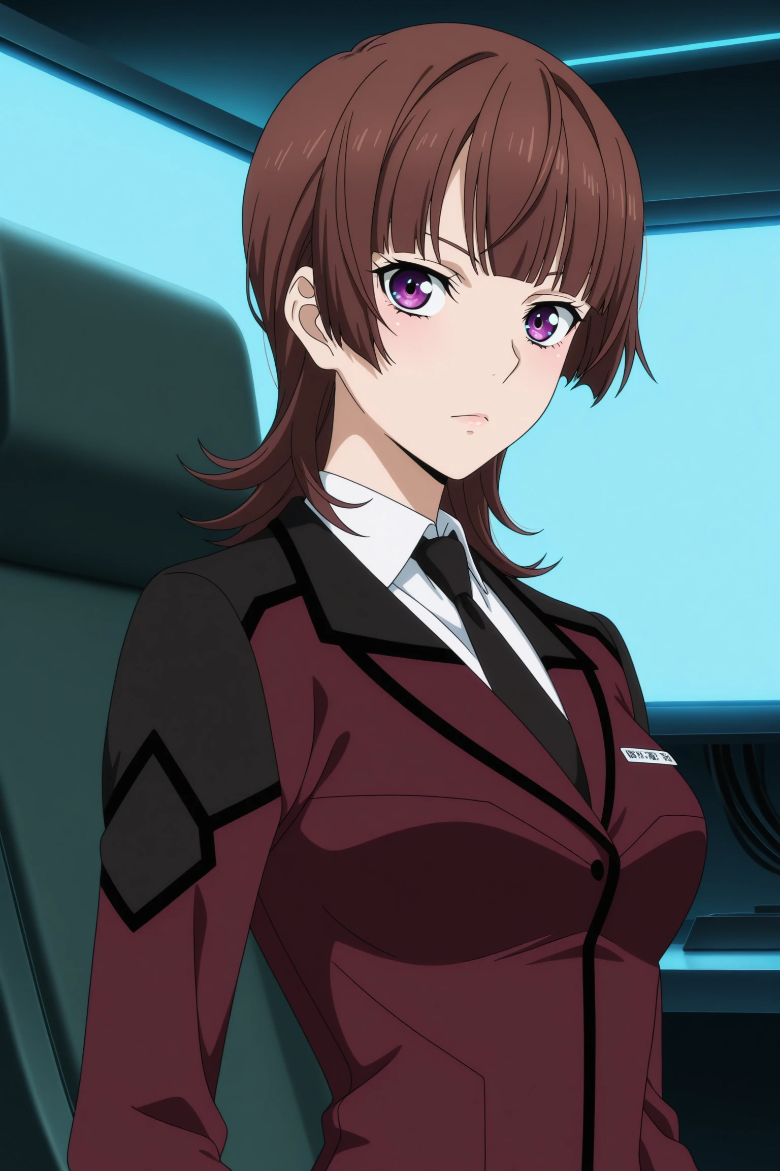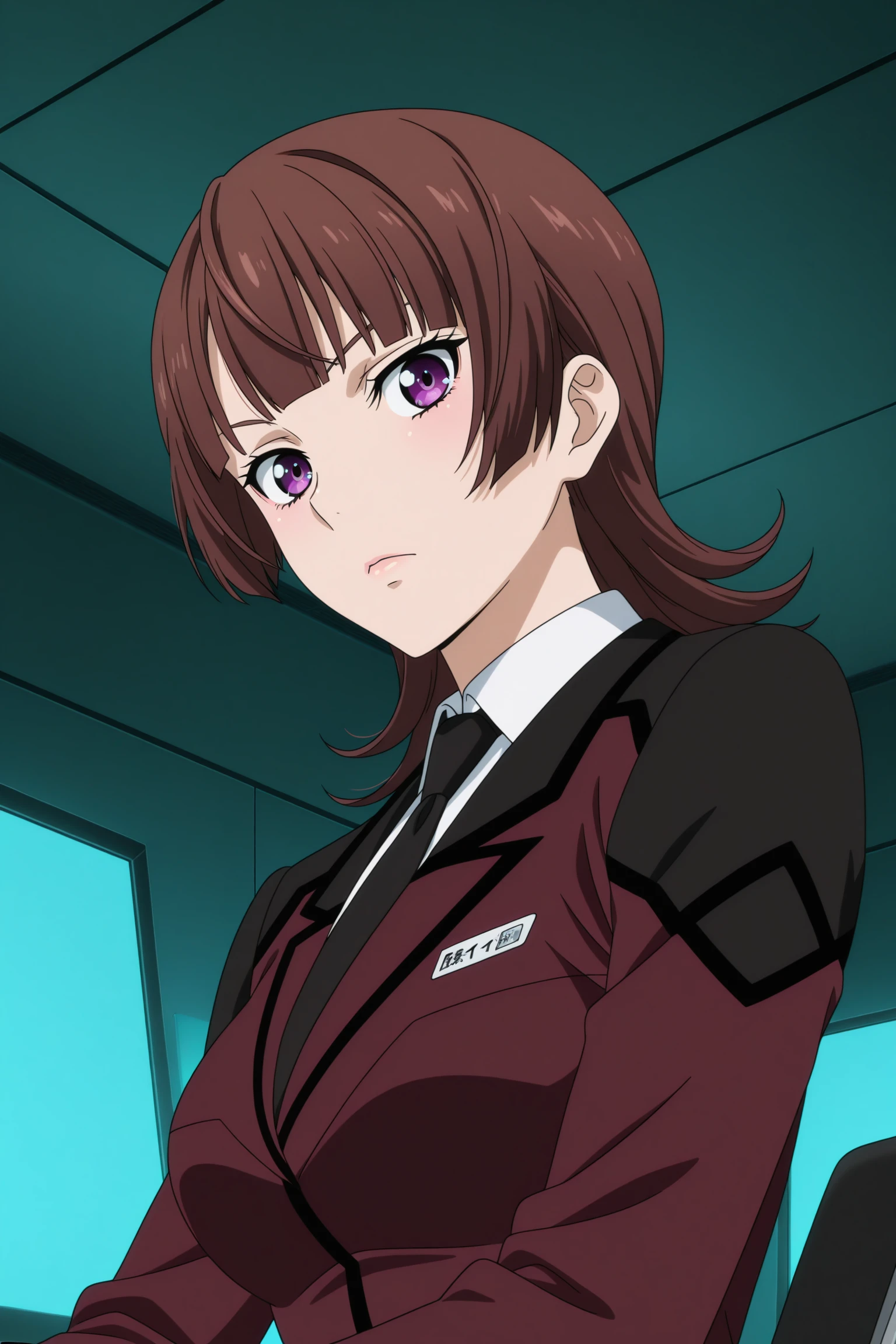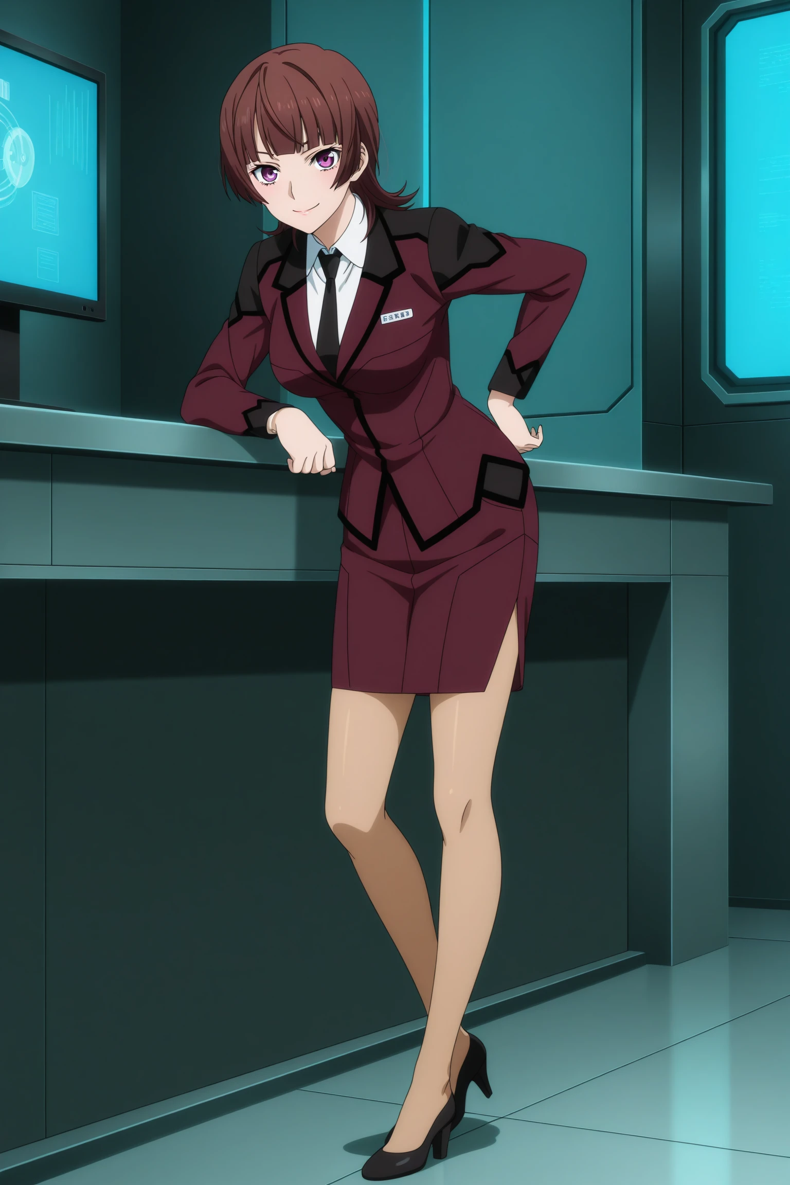 kazari asami, brown hair, medium hair, purple eyes, suit, military uniform, white shirt, collared shirt, purple jacket, name tag, black necktie, purple skirt, pencil skirt, brown pantyhose, black footwear, high heelsSuit from Season 2
