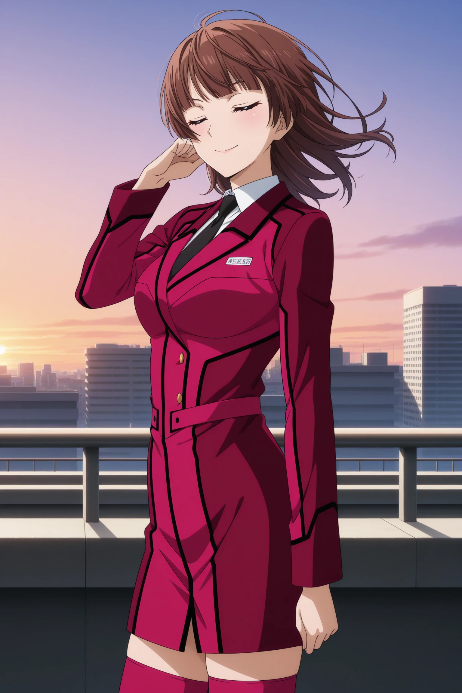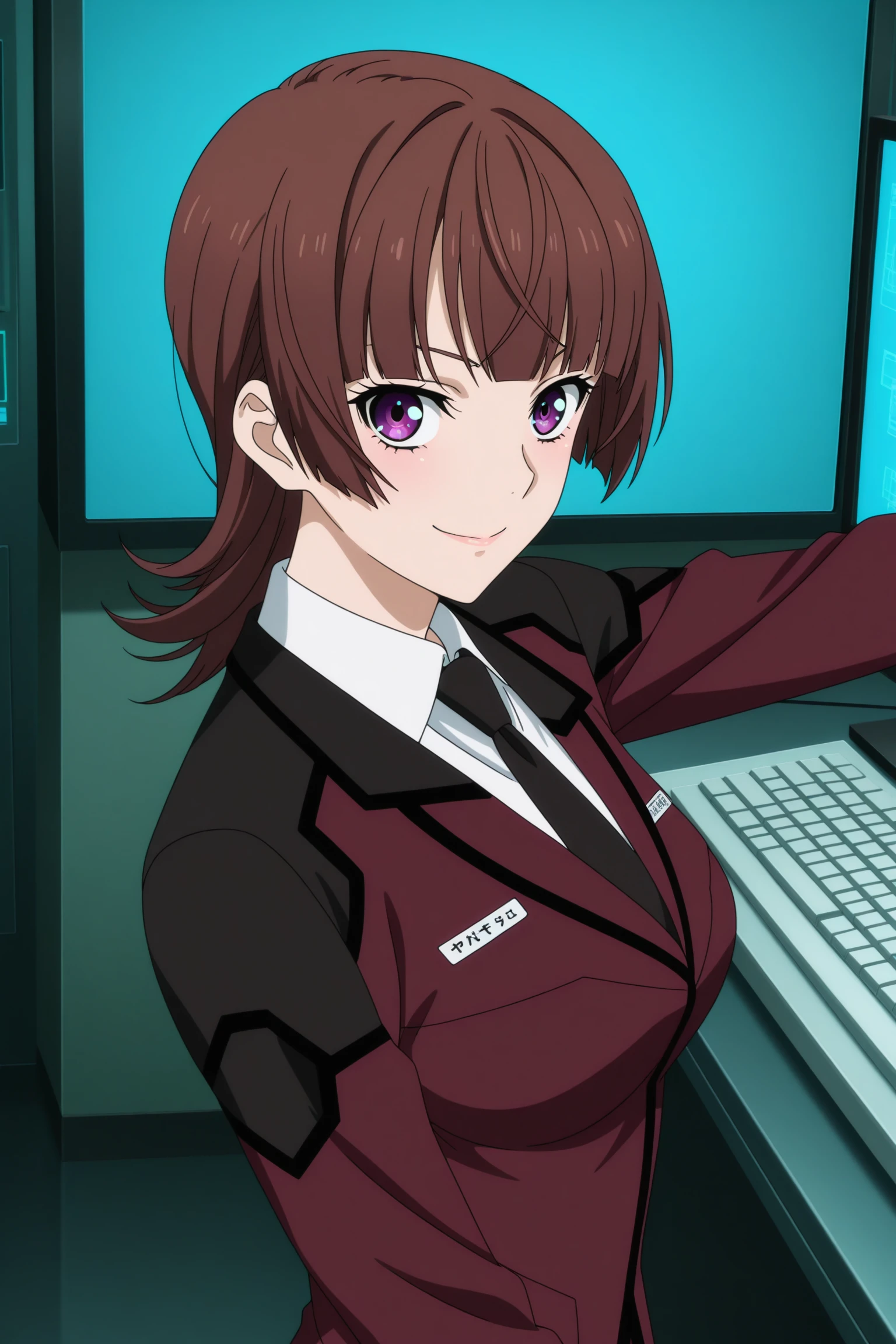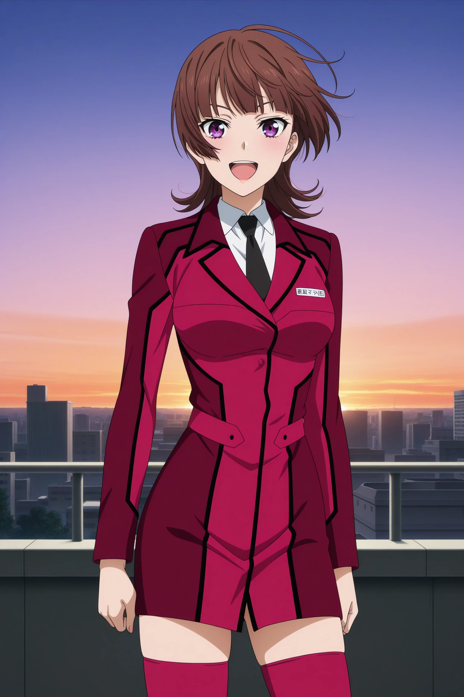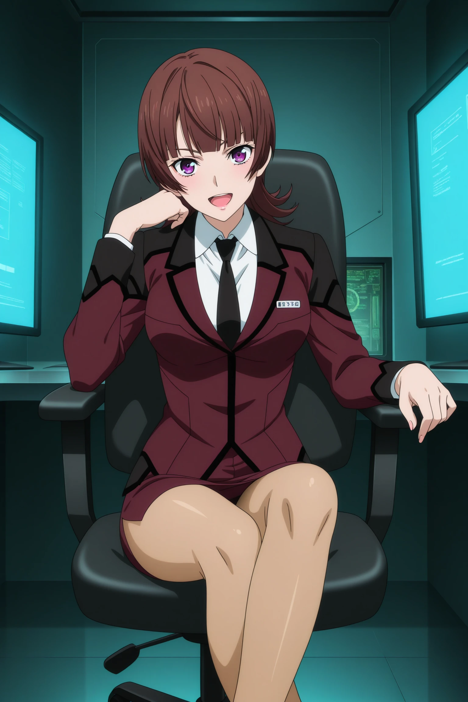 kazari asami, brown hair, medium hair, purple eyes, suit, military uniform, white shirt, collared shirt, purple jacket, name tag, black necktie, purple skirt, pencil skirt, brown pantyhose, black footwear, high heelsSuit from Season 2