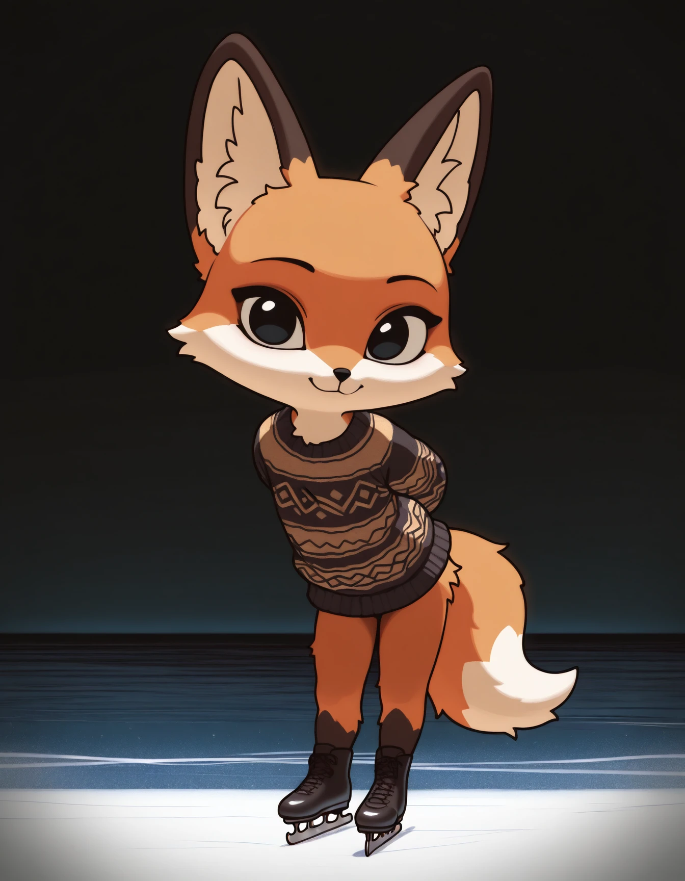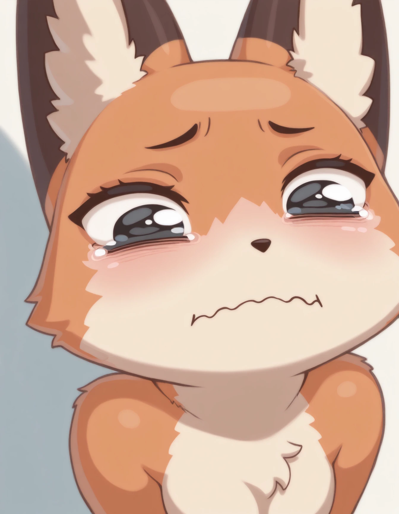Promt: cute, fluffy female fox with brown eyes, 2 ears on her head, long ears, pricked ears, raised ears, long eyelashes, fluffy tail.