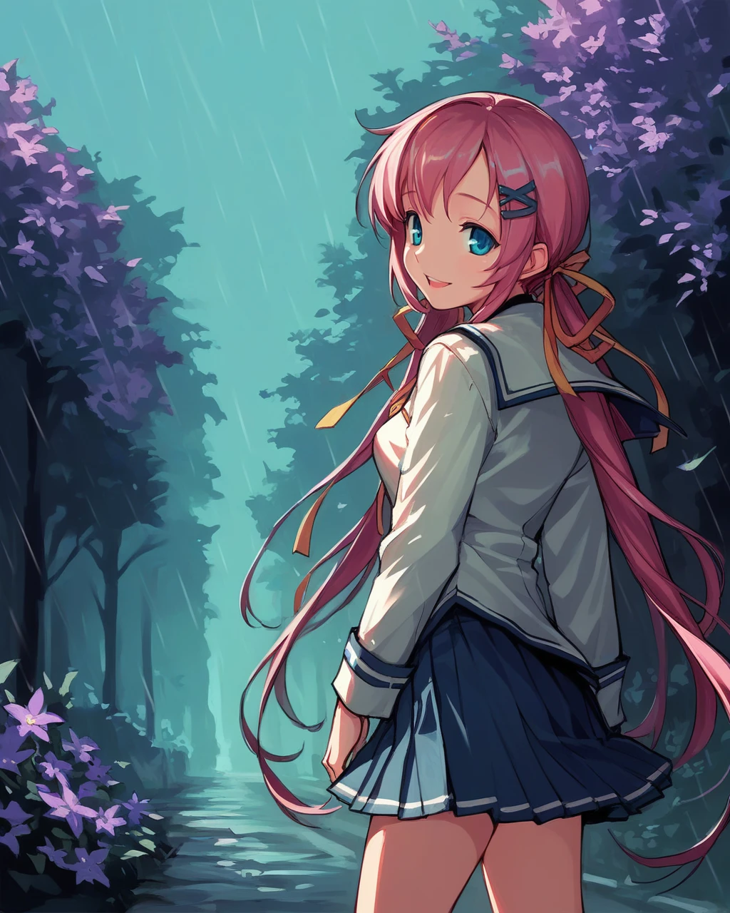 blue eyes, pink hair, long hair, twintails, hair ornament, hairclip, yellow ribbon, XI hair ornament,