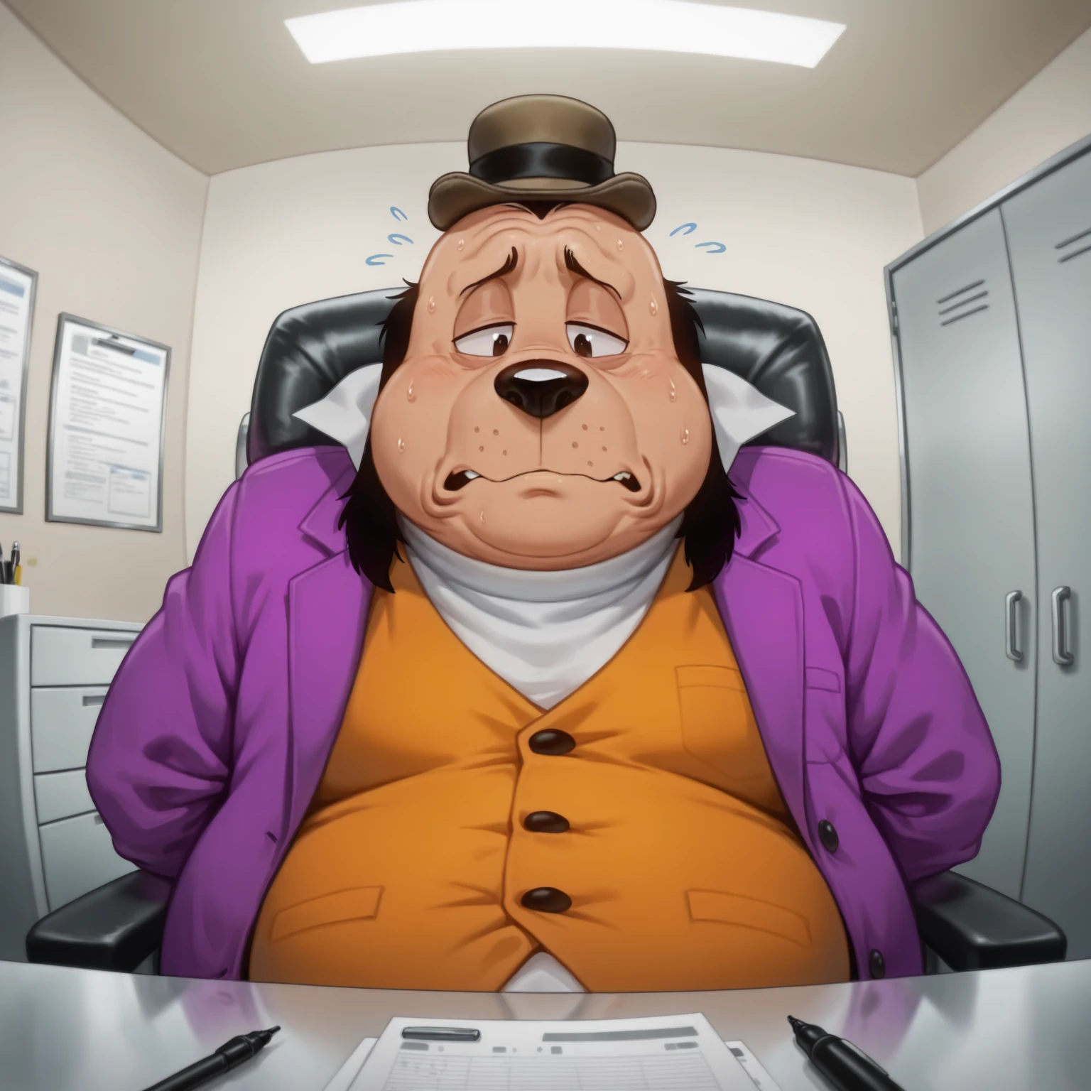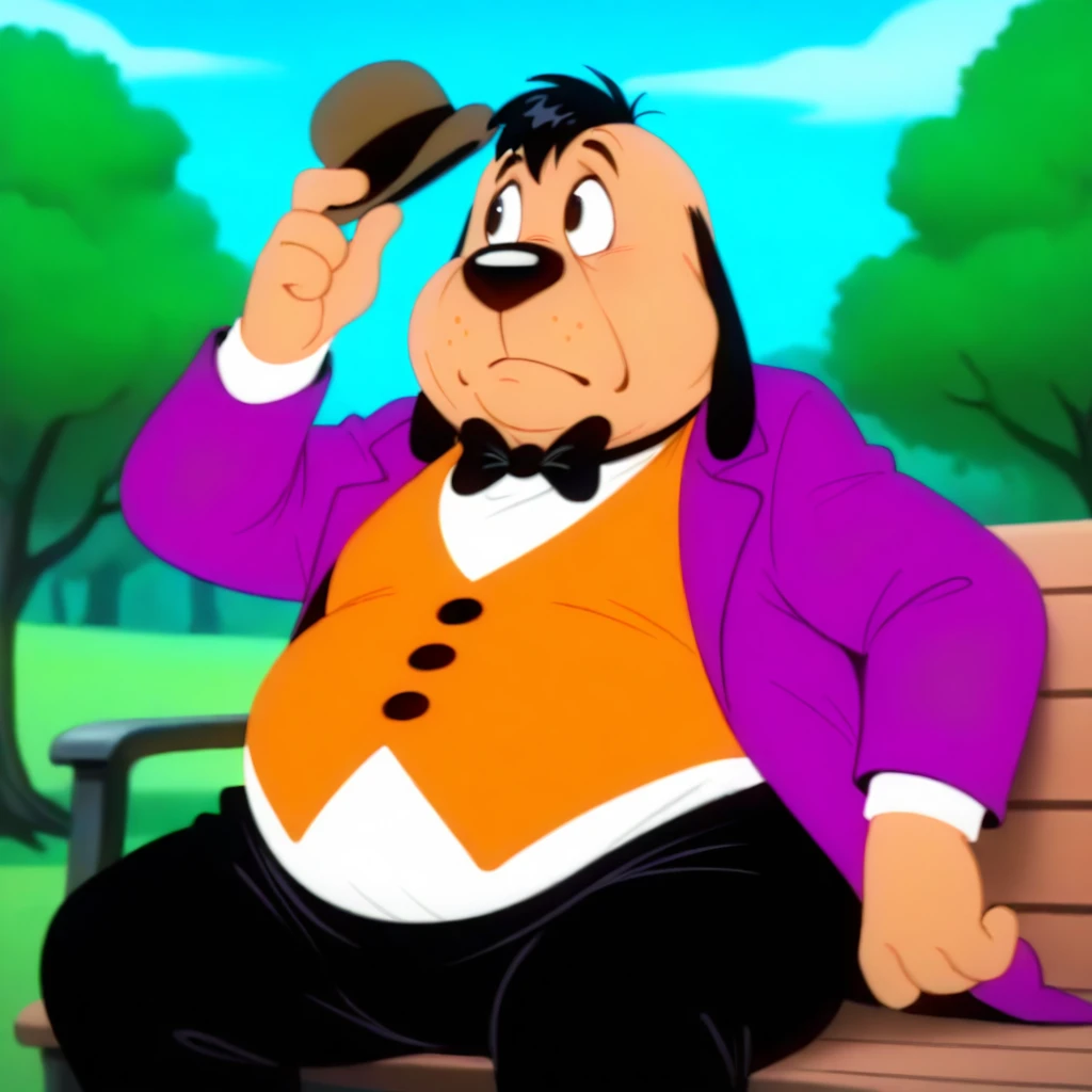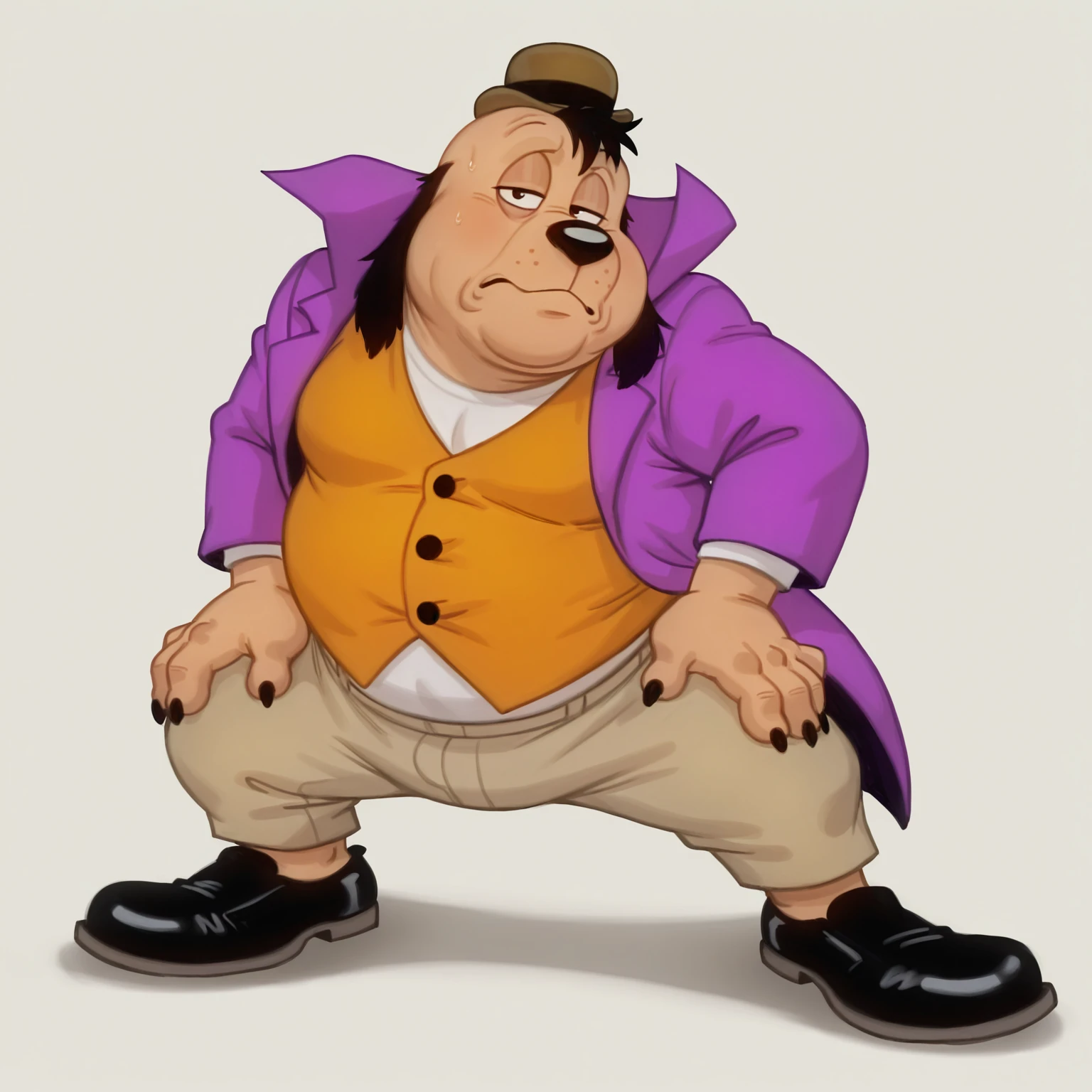 tags: cartoon dog, furry male, white skin, overweight, black hair, half-lidded eyes, balding, popped collar, tan pants, black shoes