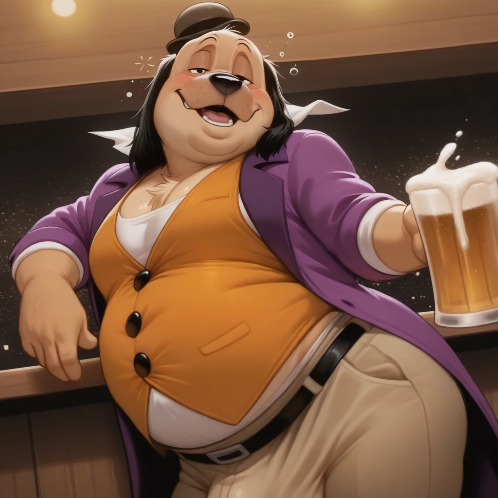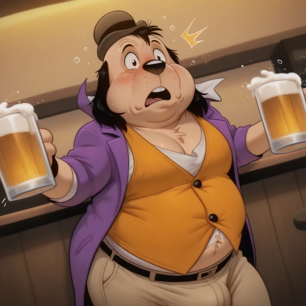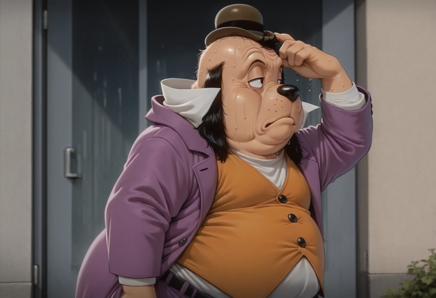 tags: cartoon dog, furry male, white skin, overweight, black hair, half-lidded eyes, balding, popped collar, tan pants, black shoes