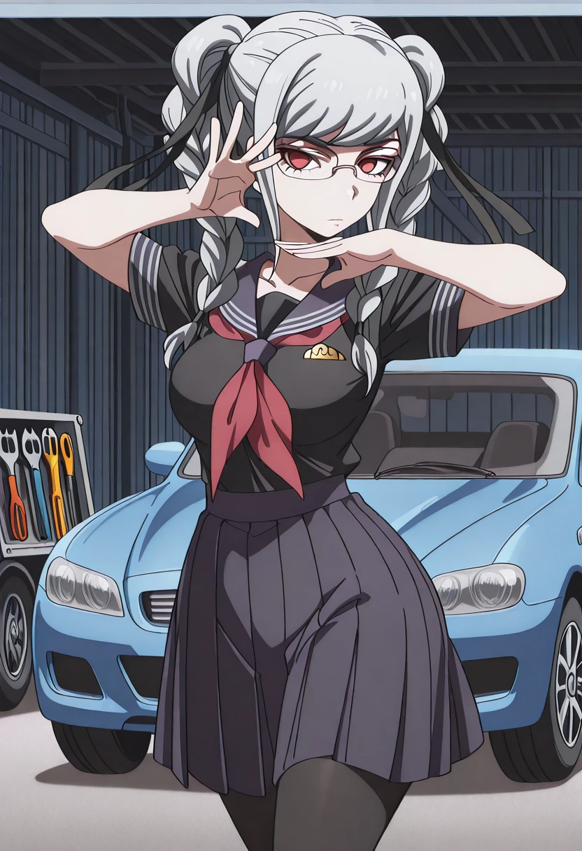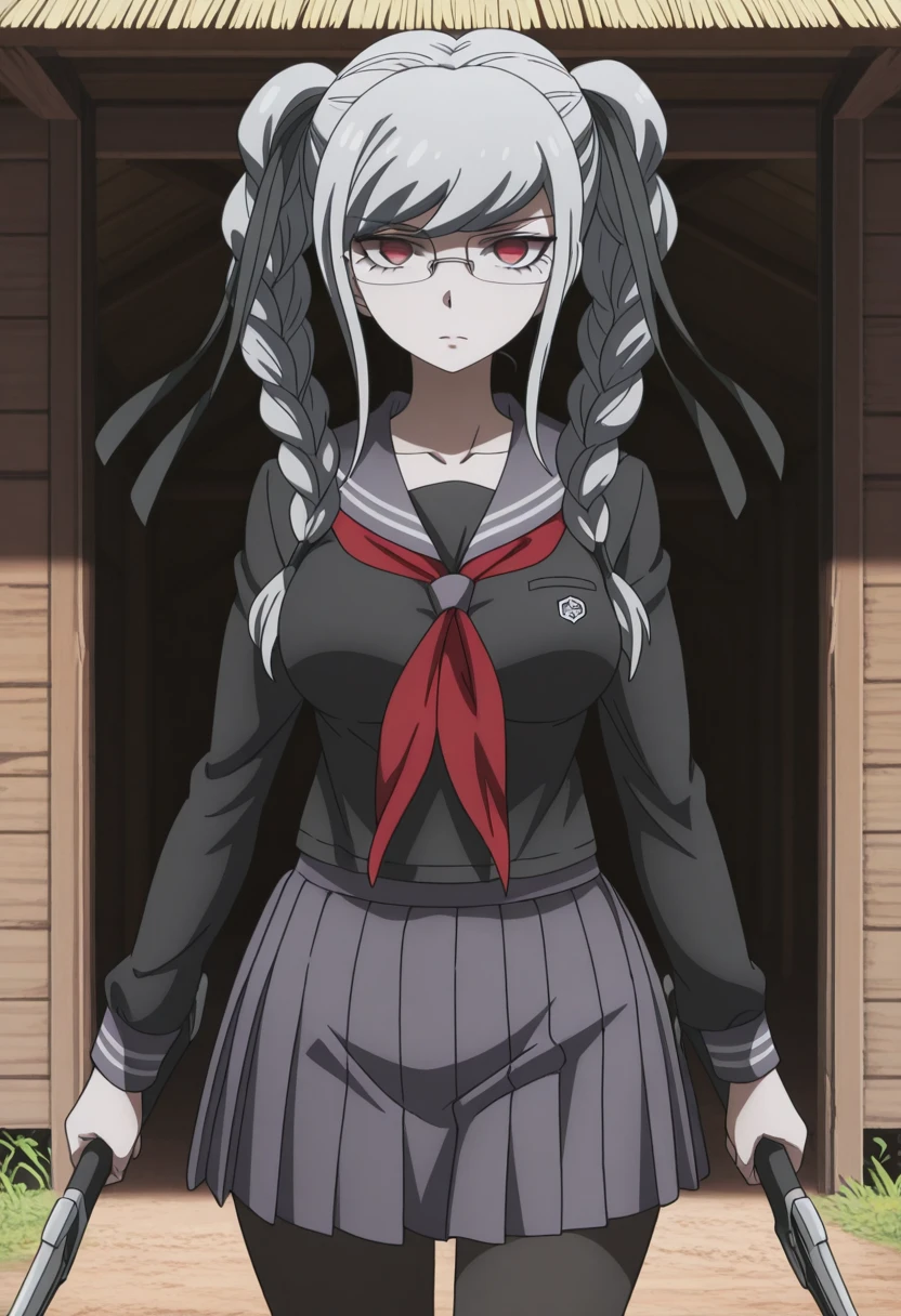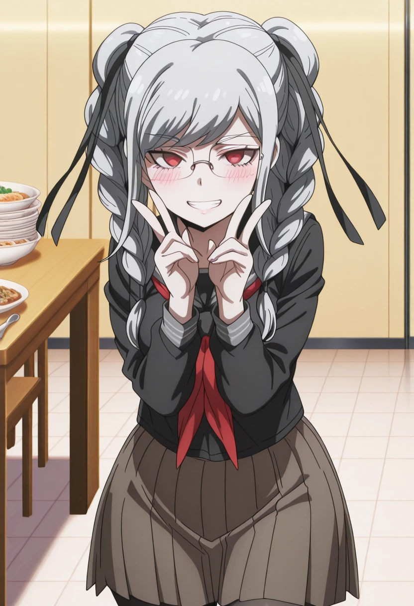 peko pekoyama, braid, long hair, red eyes, twin braids, glasses, white hair, mature female, medium breasts, anime screencap