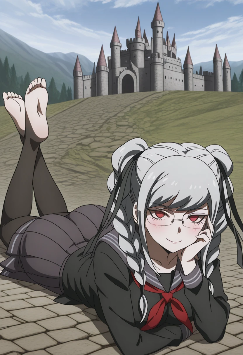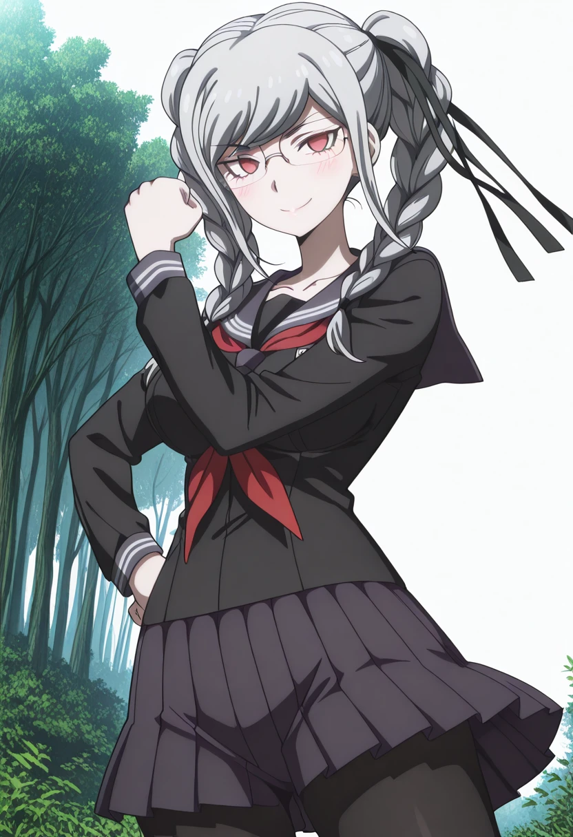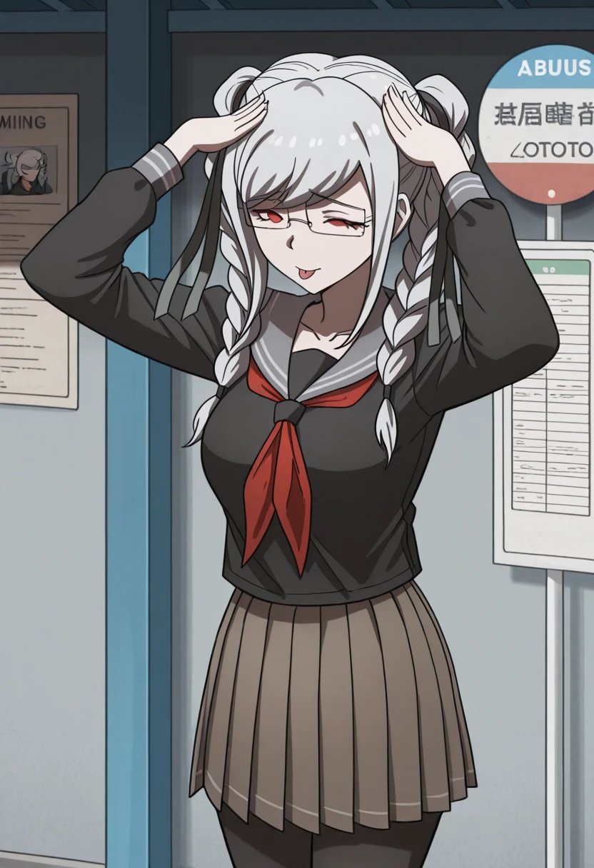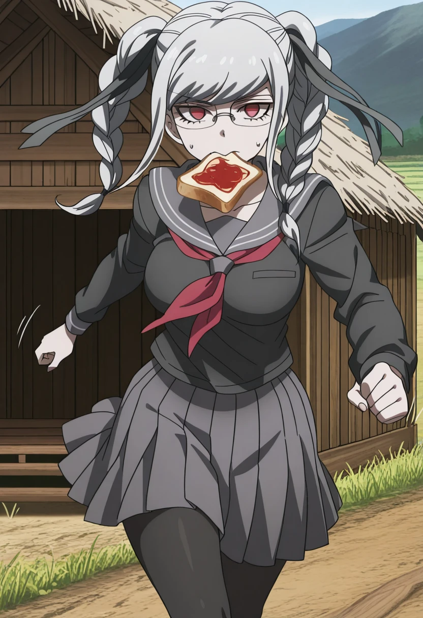 peko pekoyama, braid, long hair, red eyes, twin braids, glasses, white hair, mature female, medium breasts, anime screencap