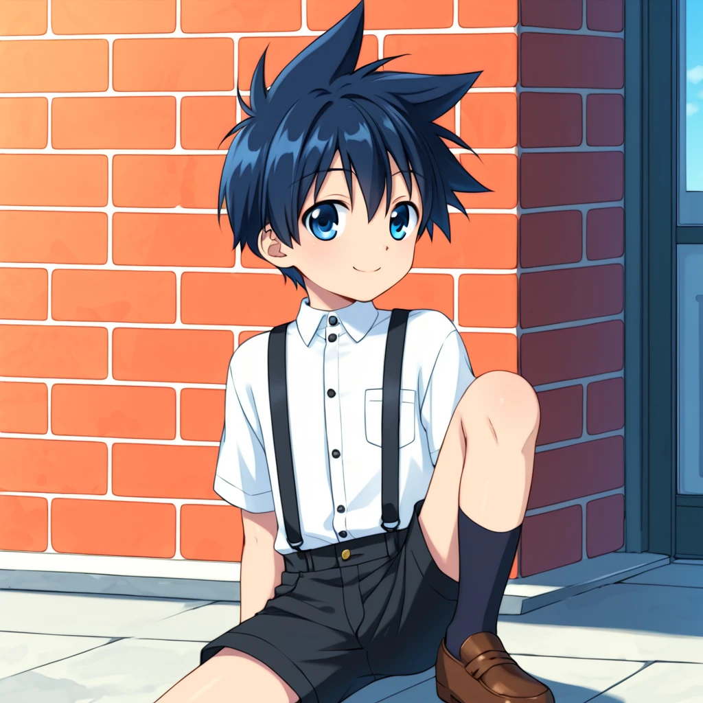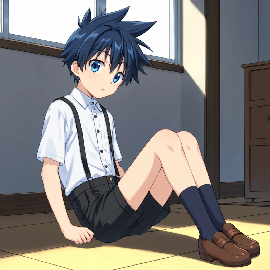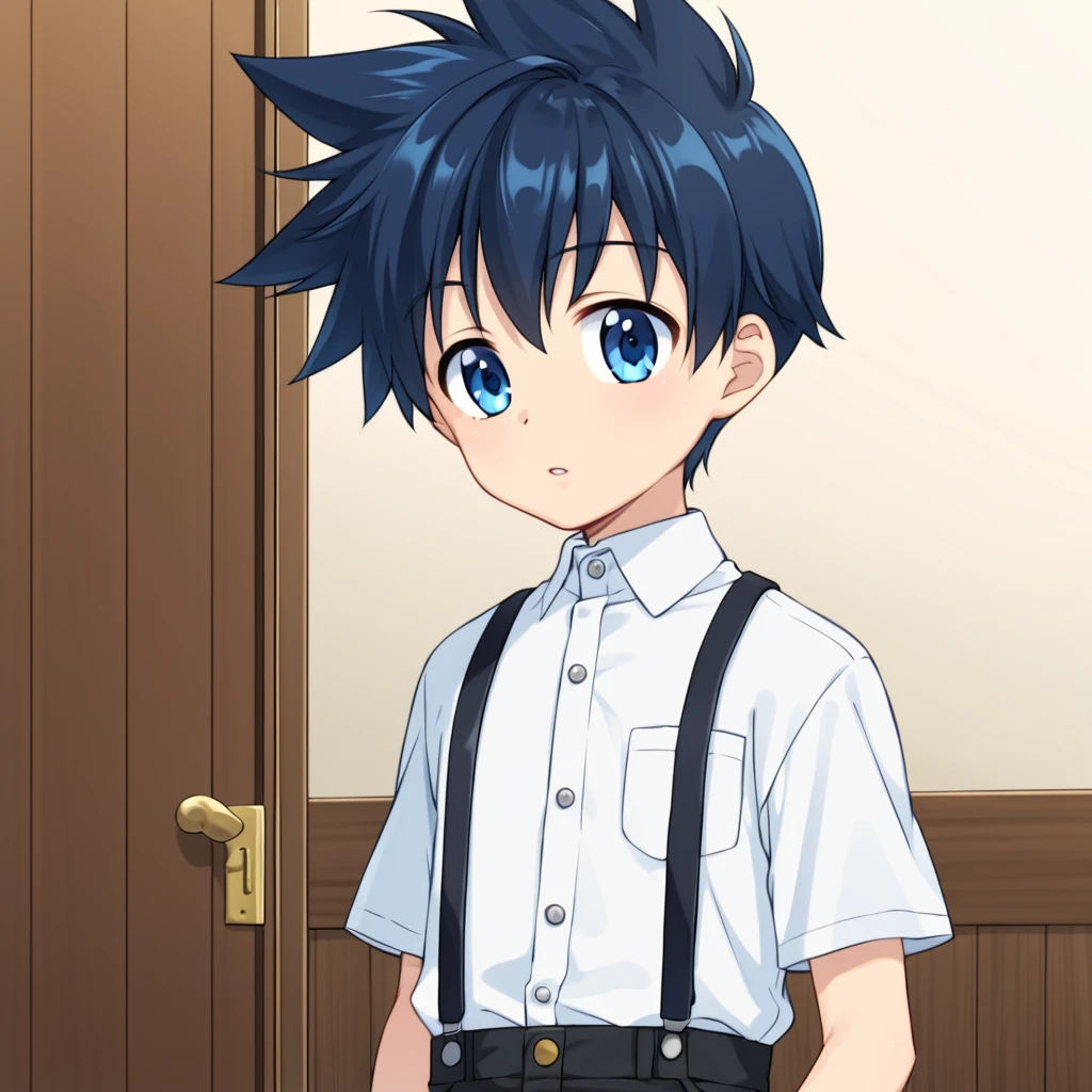 '1boy, solo, aged-down, black-blue hair, blue eyes, short hair, spikey hair,'