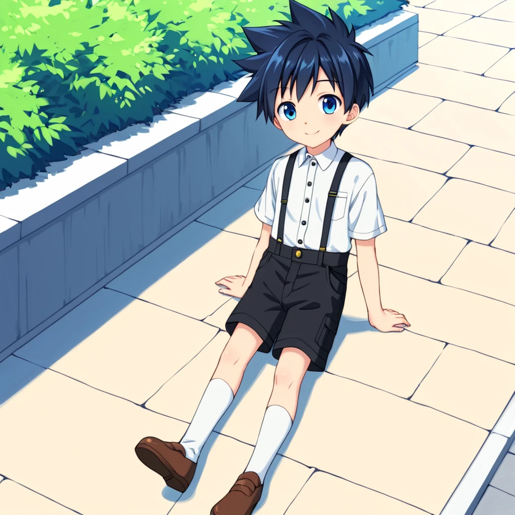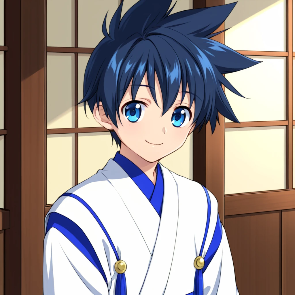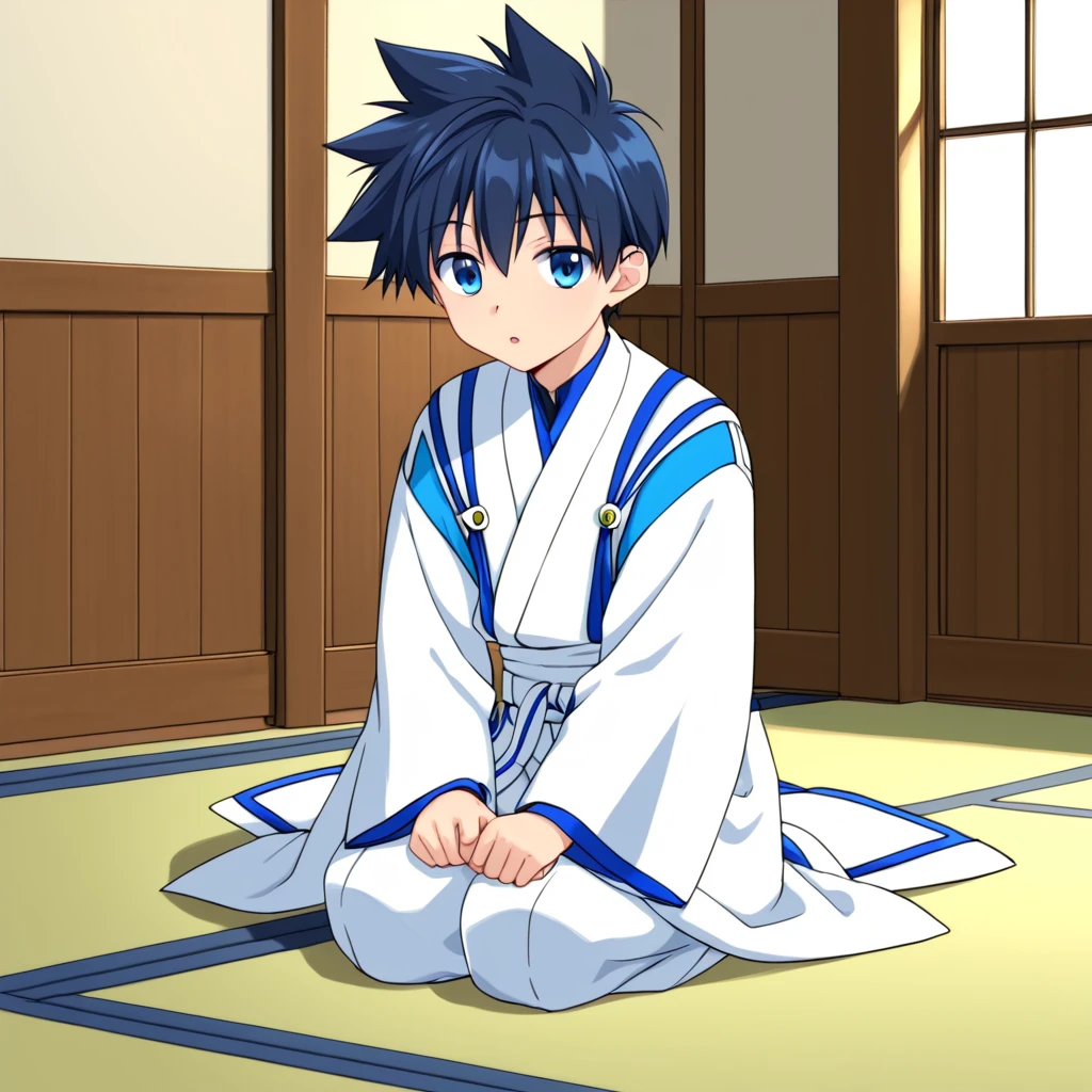'1boy, solo, aged-down, black-blue hair, blue eyes, short hair, spikey hair,'