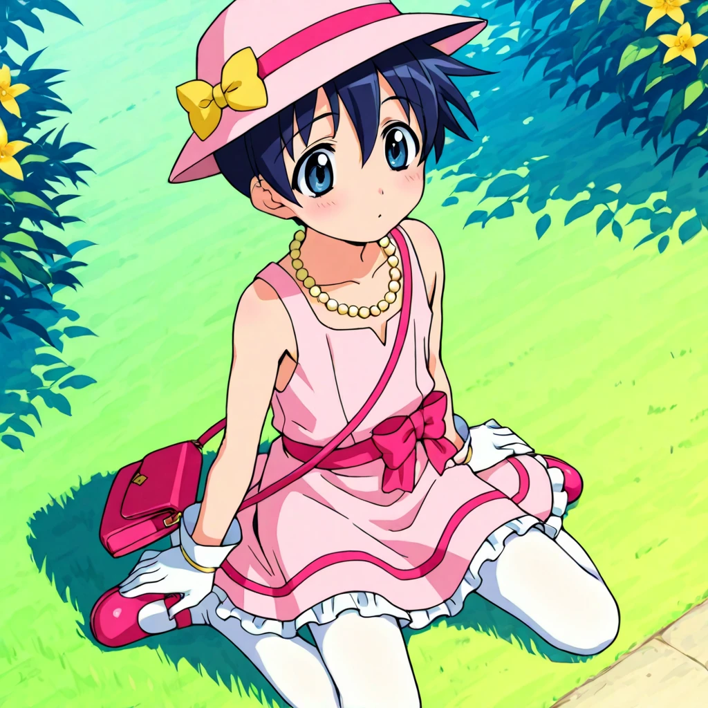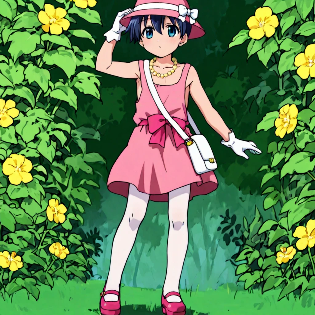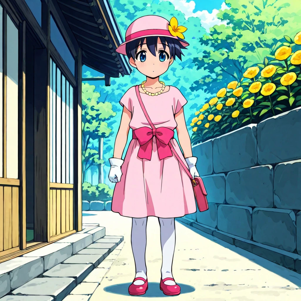 'Moga Outfit, pink headwear, hat, hatband, yellow flower pinned to hat, yellow pearl necklace, collarbone, pink dress, no sleeves, white gloves, pink sash, bow, white tights, pink maryjanes, handbag,'