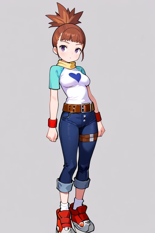 medium breasts, rukidef, raglan sleeves, scarf, t-shirt, heart print, wristband, belt, pants, jeans, thigh strap, pants rolled up, socks, shoes,