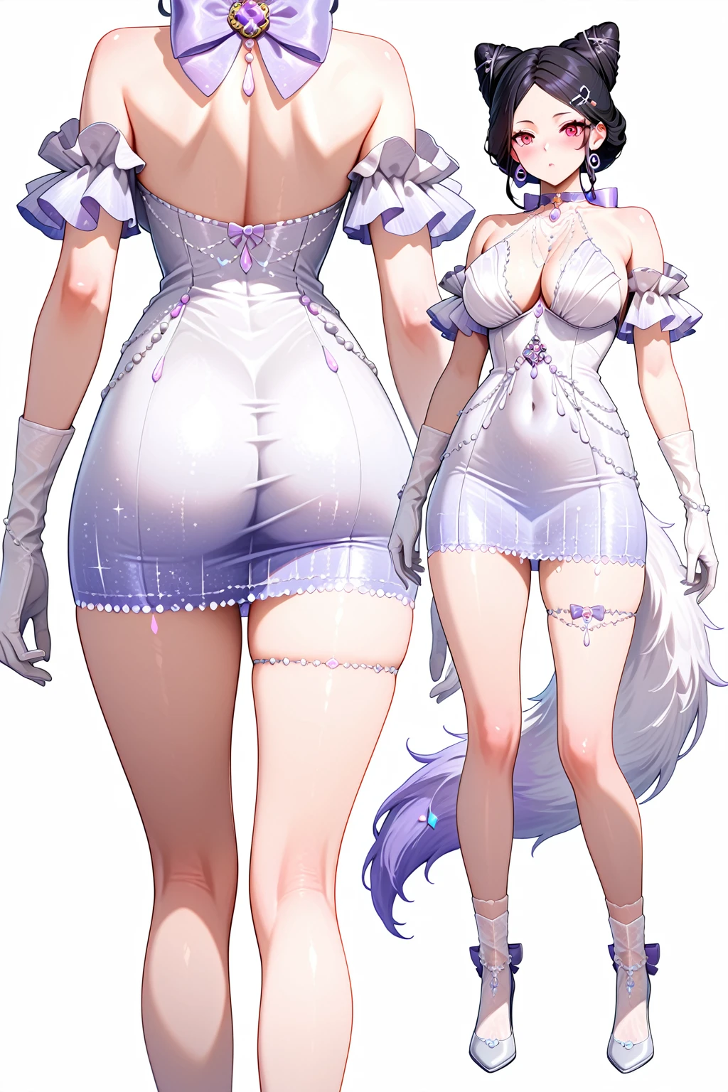 1. 13878w,choker,white gloves,thigh strap,white fox tail,socks,jewelry,high heels,halter neck microdress,beaded trim dress,gemstone embellishment,earrings,arm frill,bow,