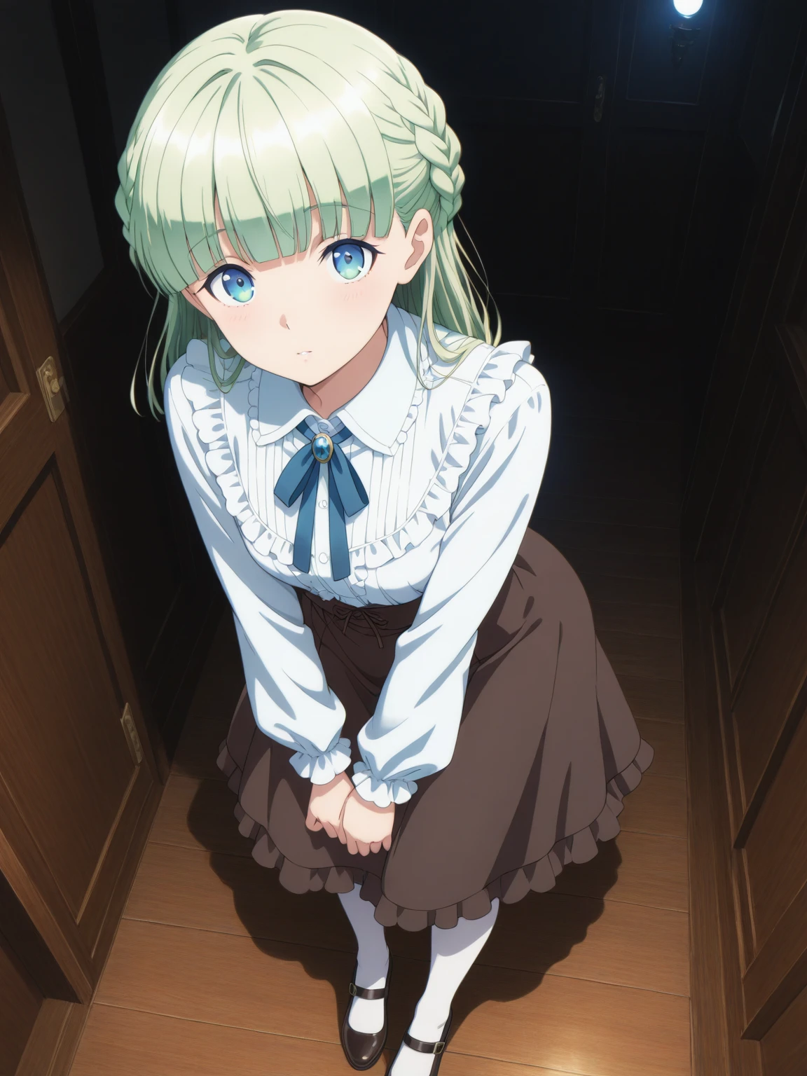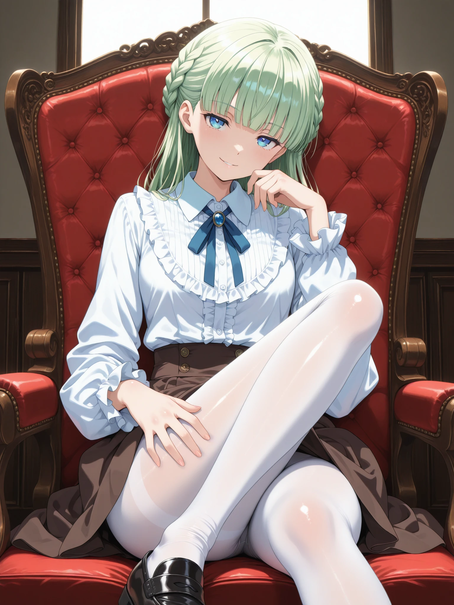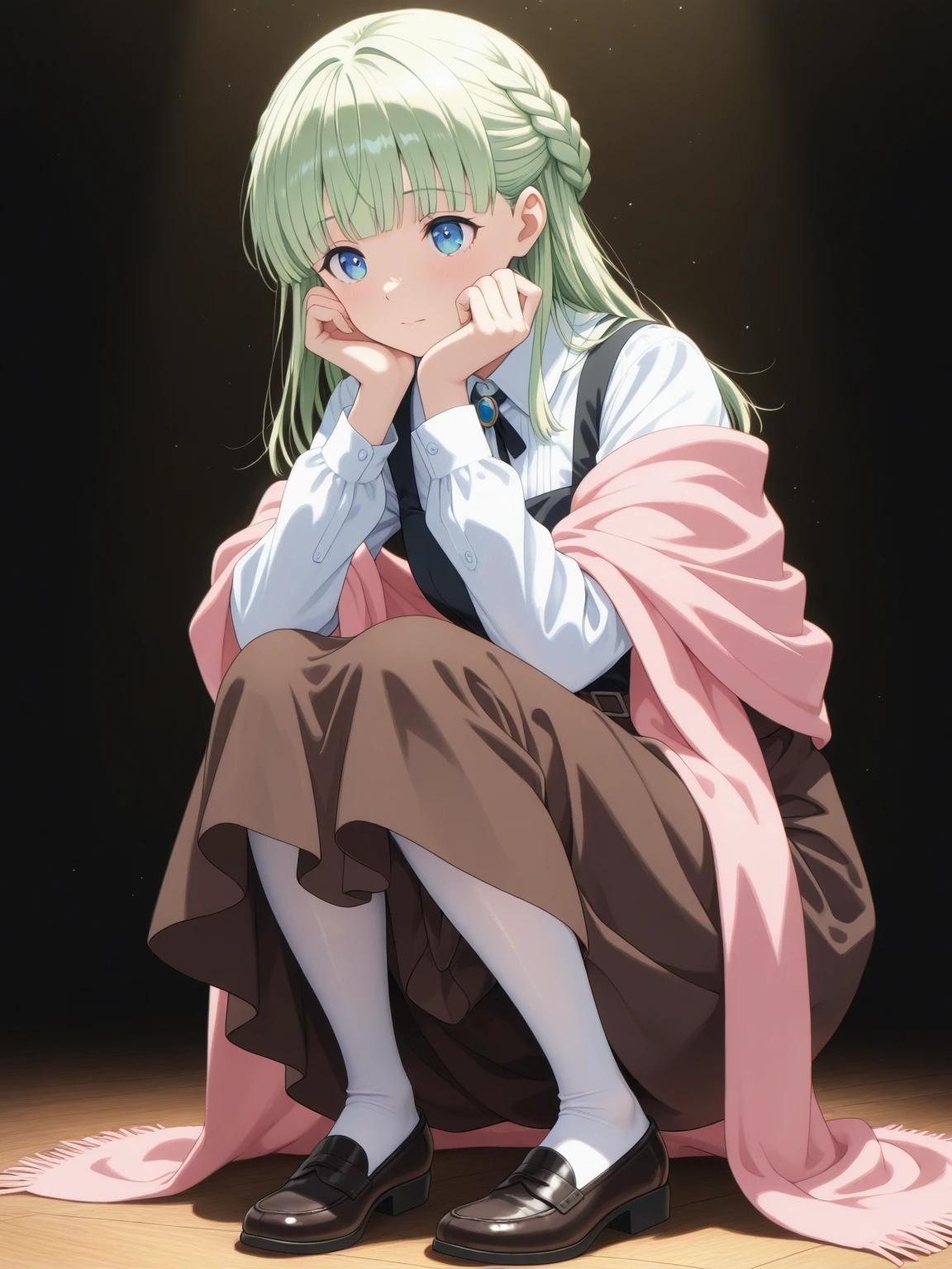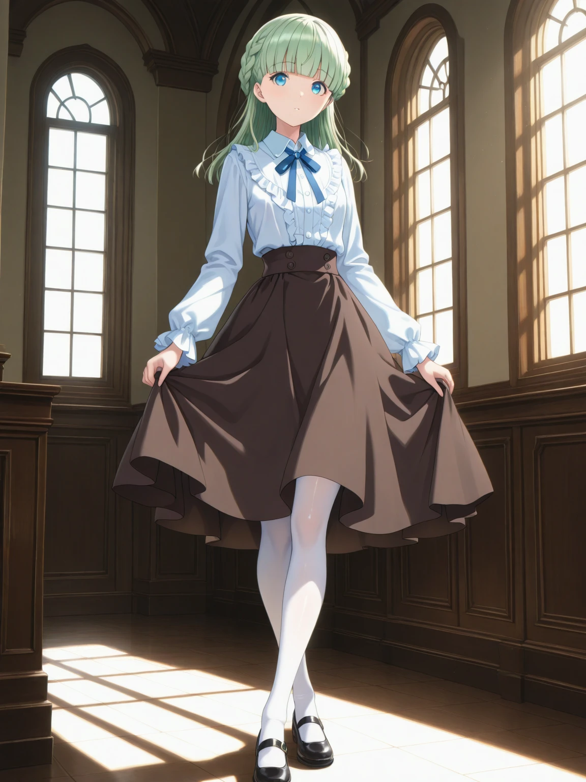 Casual: (ZenaCasual, blue eyes, green hair, blunt bangs, french braid), (white frilled shirt, blue neck ribbon, pink shawl, brown skirt, white pantyhose, black dress shoes)