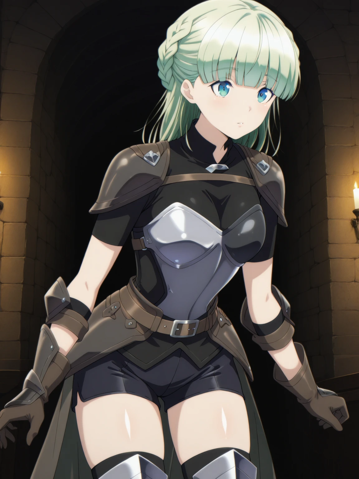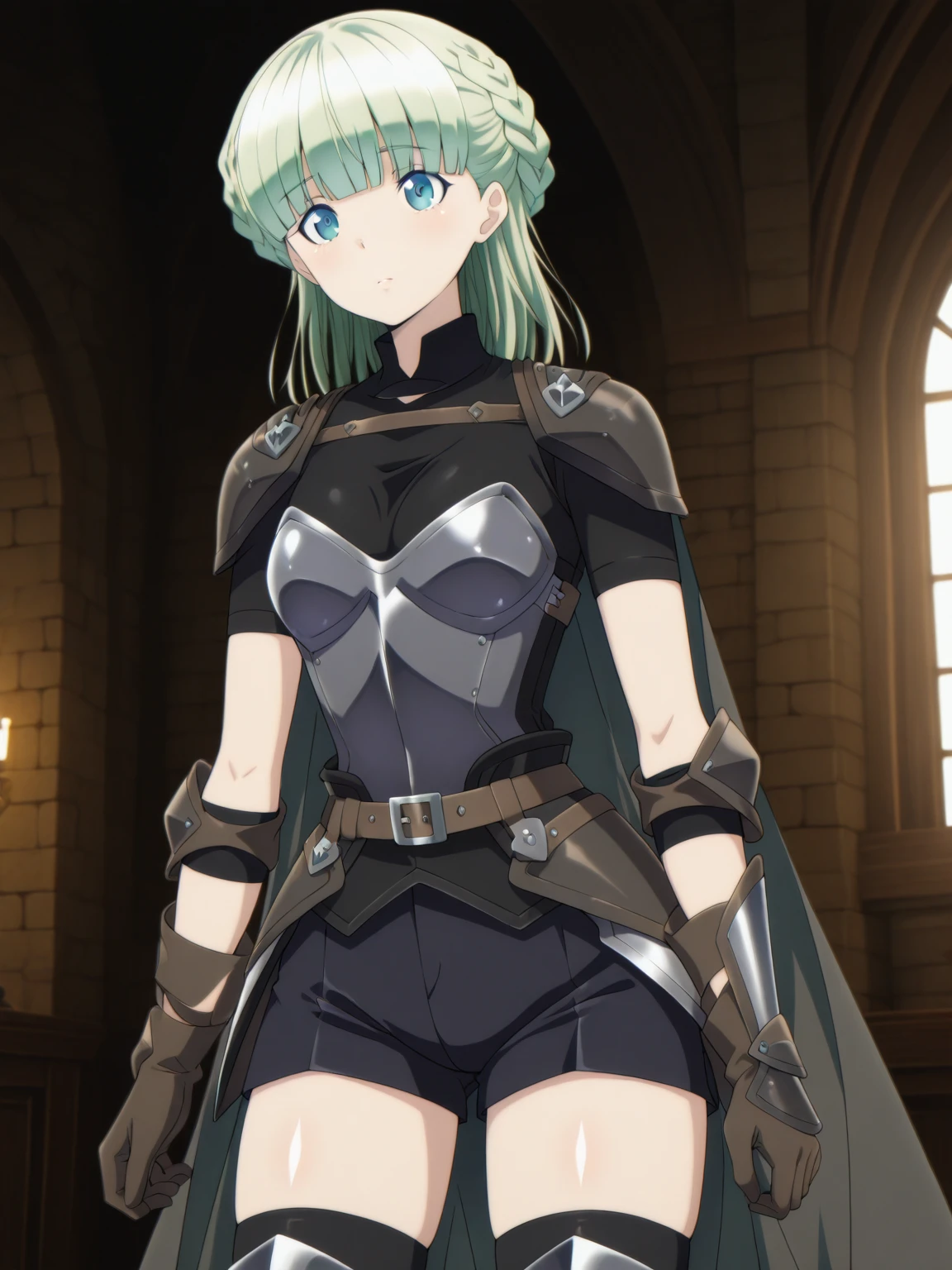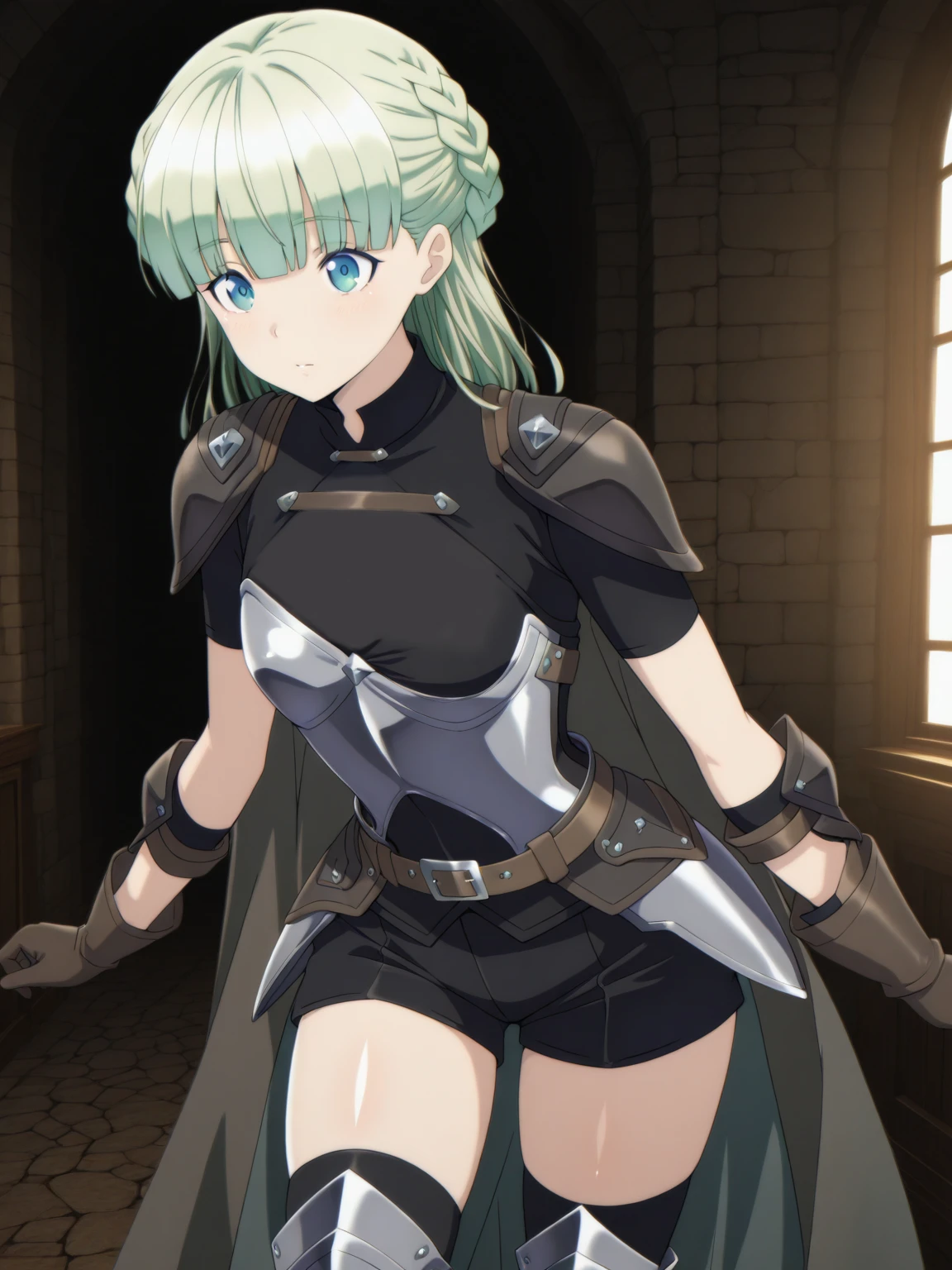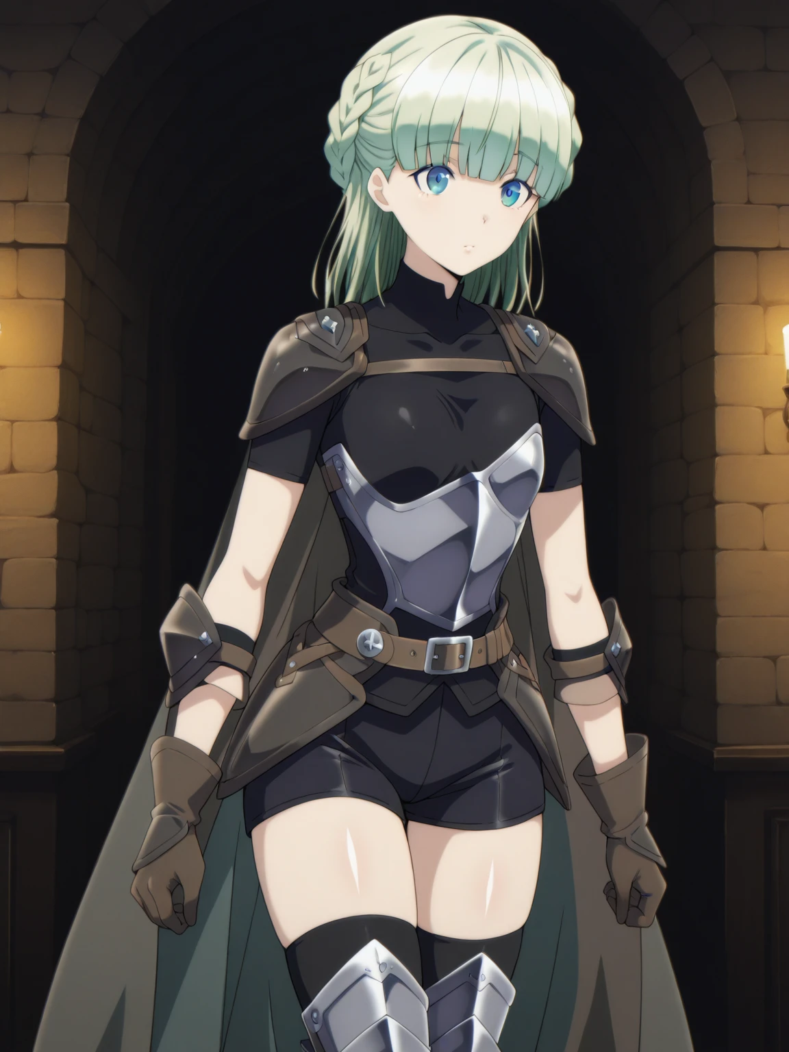 Armor: (ZenaArmor, blue eyes, green hair, blunt bangs, french braid), (black shirt, covered collarbone, short sleeves, armor, (half chest armor), (waist armor), black shorts, brown belt, brown gloves, black thighhighs, greaves, cape)